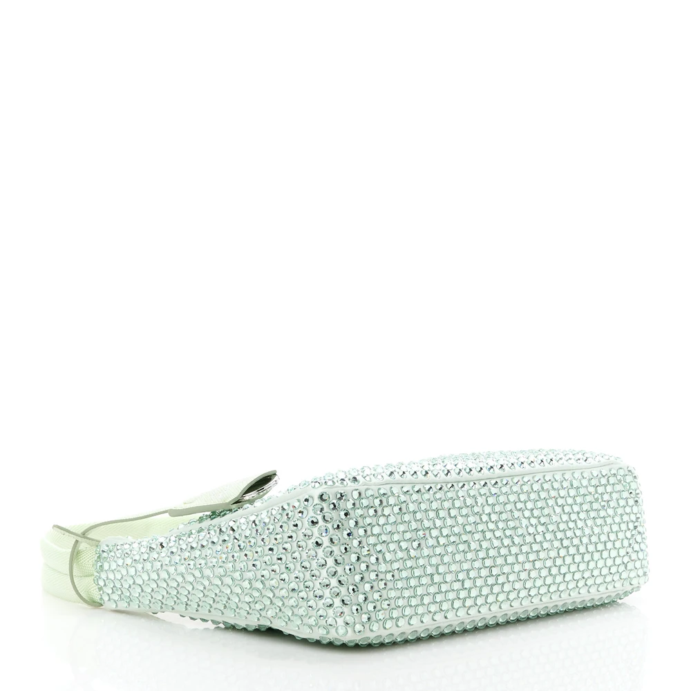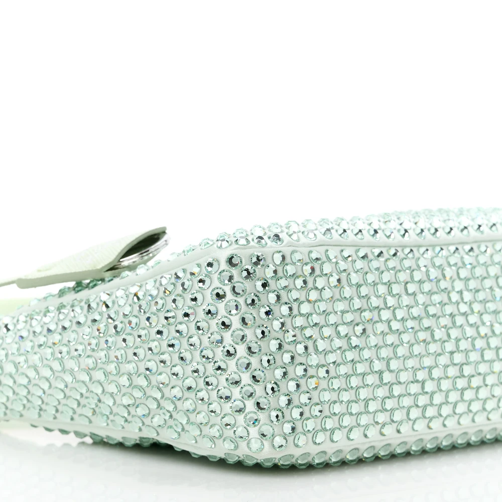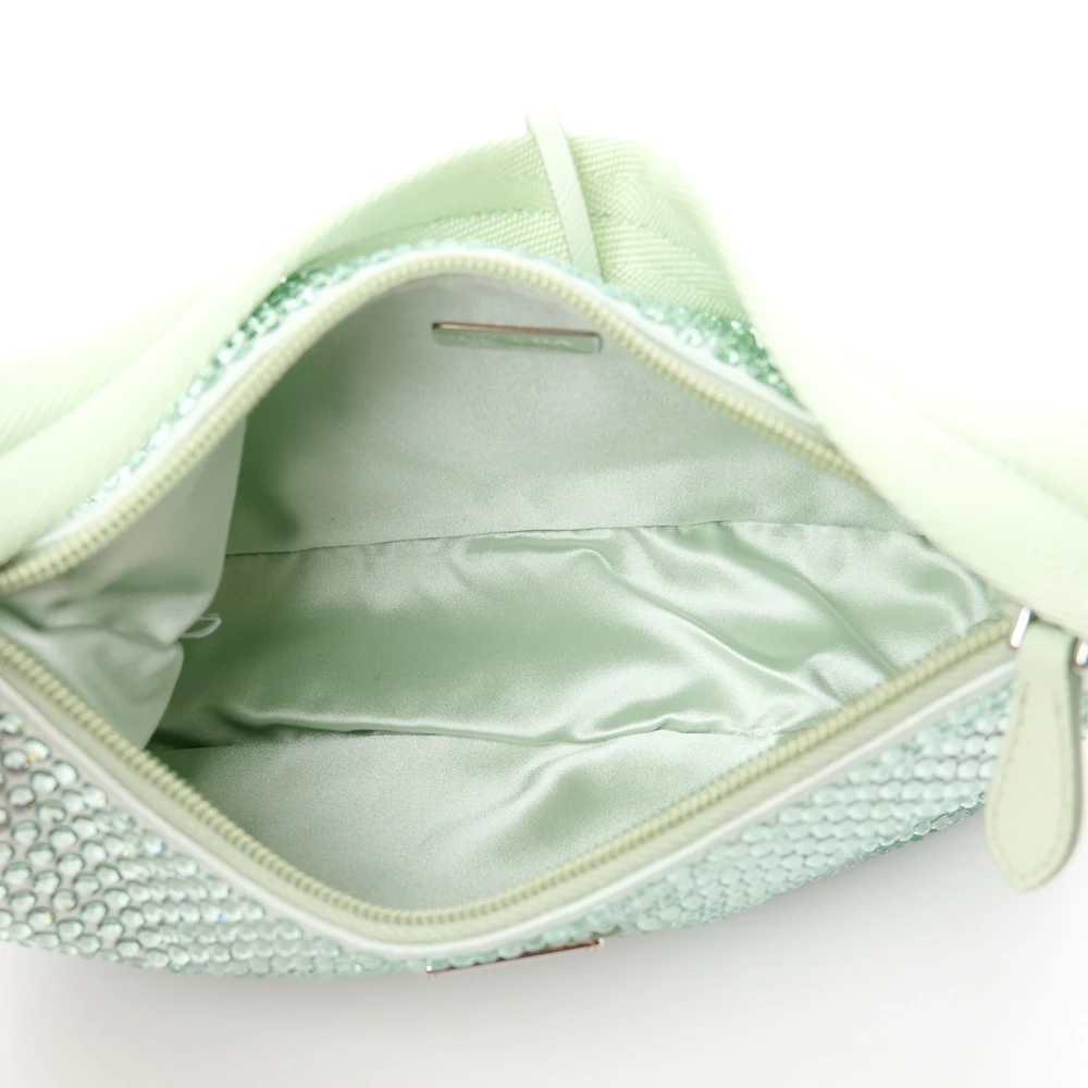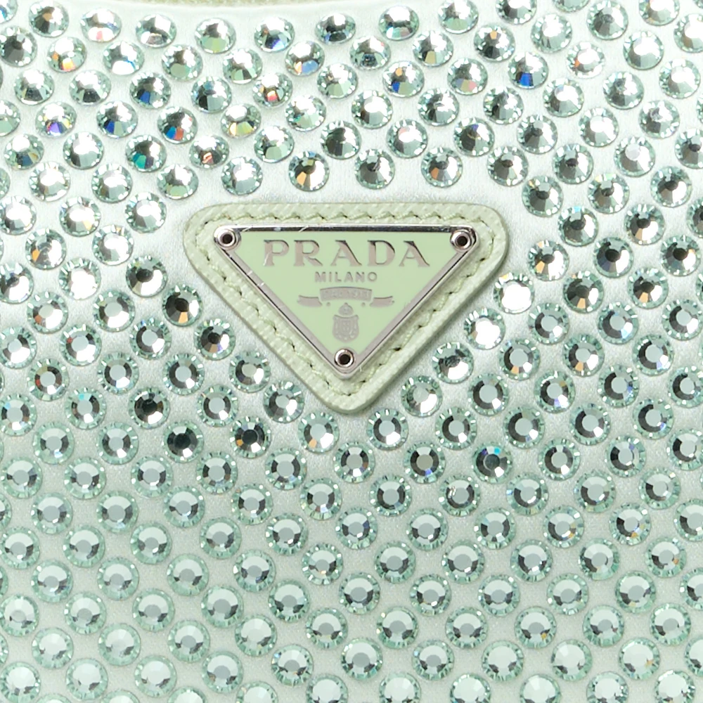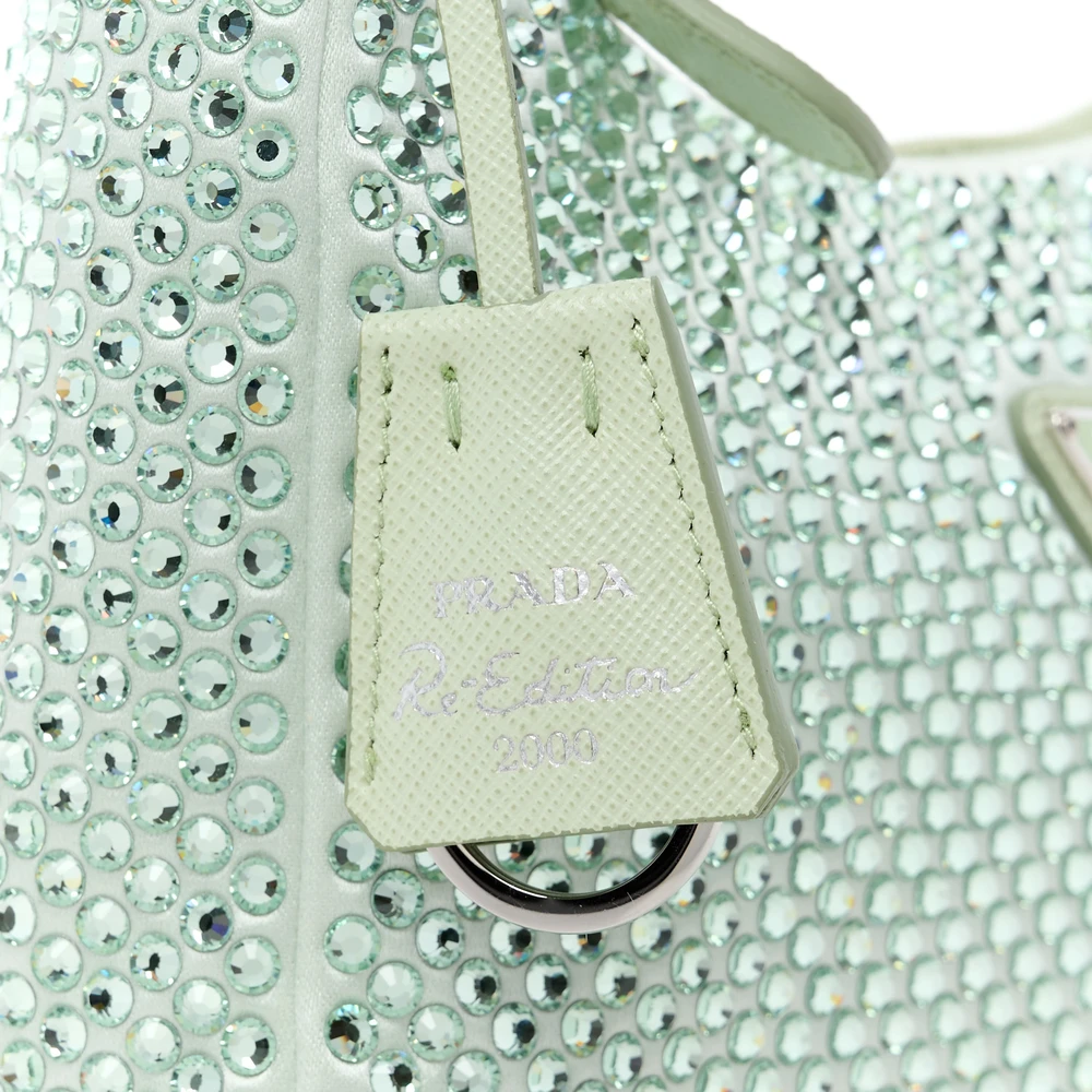 This Prada Mini Re-Edition 2000 Bag in Acqua is crafted from satin and crystal. Compact yet functional for evening essentials. A sparkling accessory for glamorous occasions. Lightweight and easy to carry. Perfect for adding a touch of elegance to your outfit. A chic statement piece.