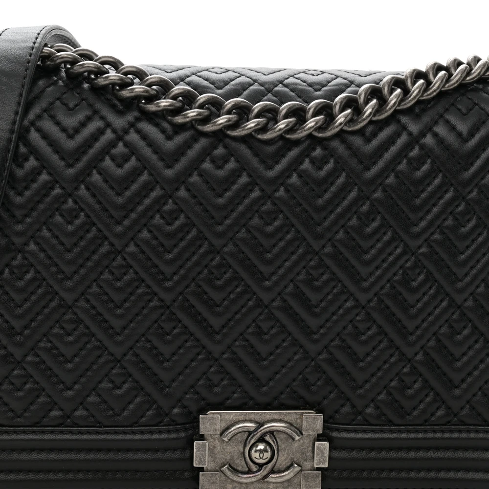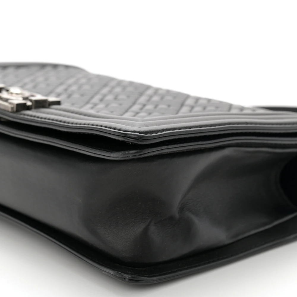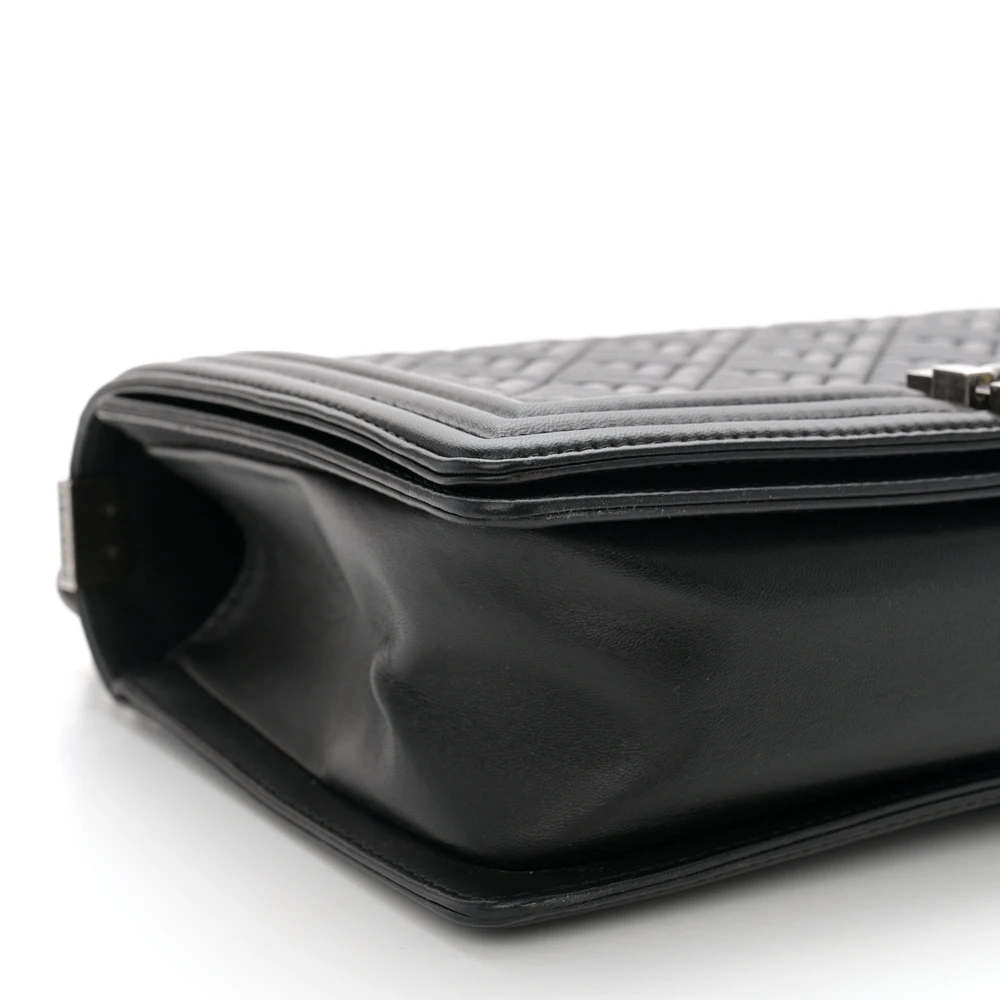 This Chanel Boy Flap New Medium in Black Quilted Lambskin Leather with Ruthenium Hardware is a bold and contemporary piece. The geometric chevron quilting and lambskin leather offer a modern twist on a classic design. Ruthenium hardware adds an edgy touch, making it a standout accessory. The spacious interior is perfect for carrying essentials, while the signature Boy clasp completes its iconic look. Ideal for both day and night, this bag adds a chic edge to any outfit. A must-have for Chanel enthusiasts.