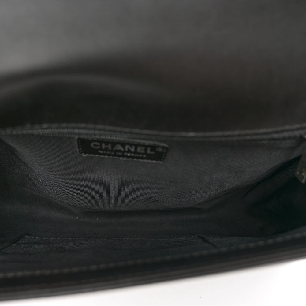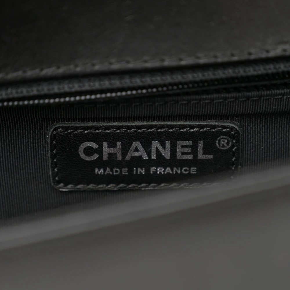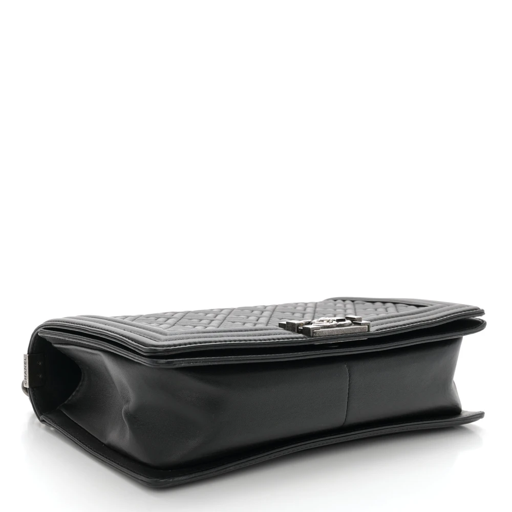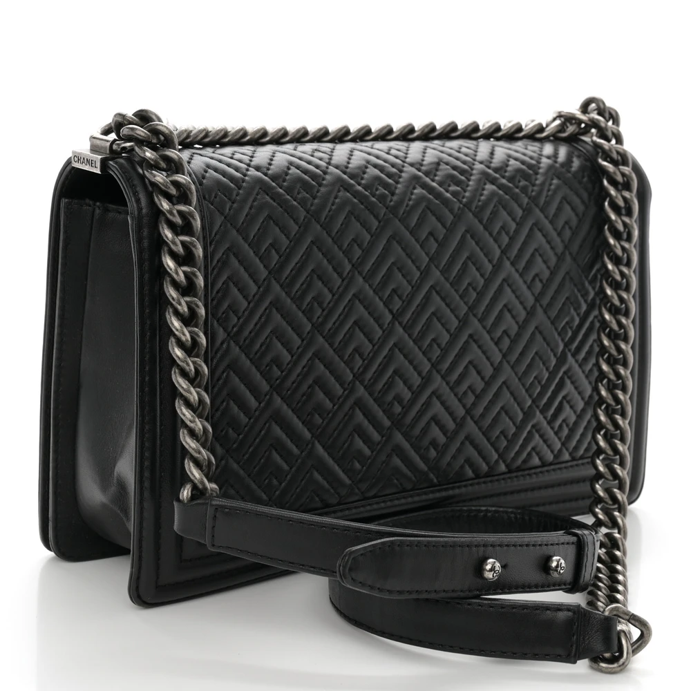 This Chanel Boy Flap New Medium in Black Quilted Lambskin Leather with Ruthenium Hardware is a bold and contemporary piece. The geometric chevron quilting and lambskin leather offer a modern twist on a classic design. Ruthenium hardware adds an edgy touch, making it a standout accessory. The spacious interior is perfect for carrying essentials, while the signature Boy clasp completes its iconic look. Ideal for both day and night, this bag adds a chic edge to any outfit. A must-have for Chanel enthusiasts.