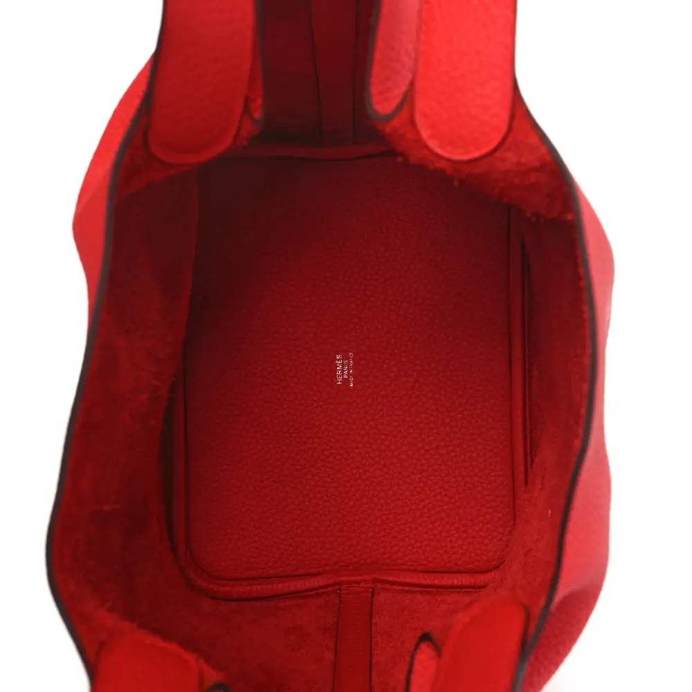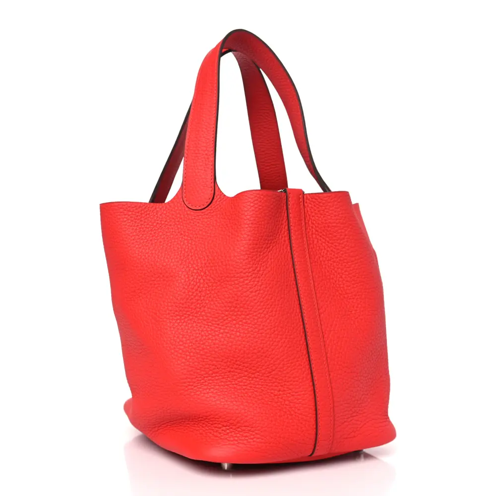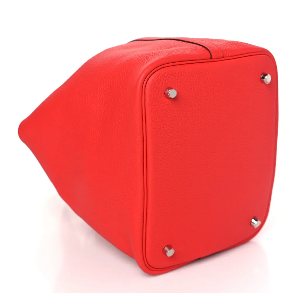 This Hermès Picotin Lock 22 MM in Rouge Casaque Taurillon Clemence Leather adds a bold touch to your style. The vibrant red hue is paired with gold hardware for an elegant finish. Its open-top design offers easy access to essentials. Lightweight and functional, it’s ideal for daily use. A structured silhouette ensures timeless sophistication. A vibrant accessory for any wardrobe.