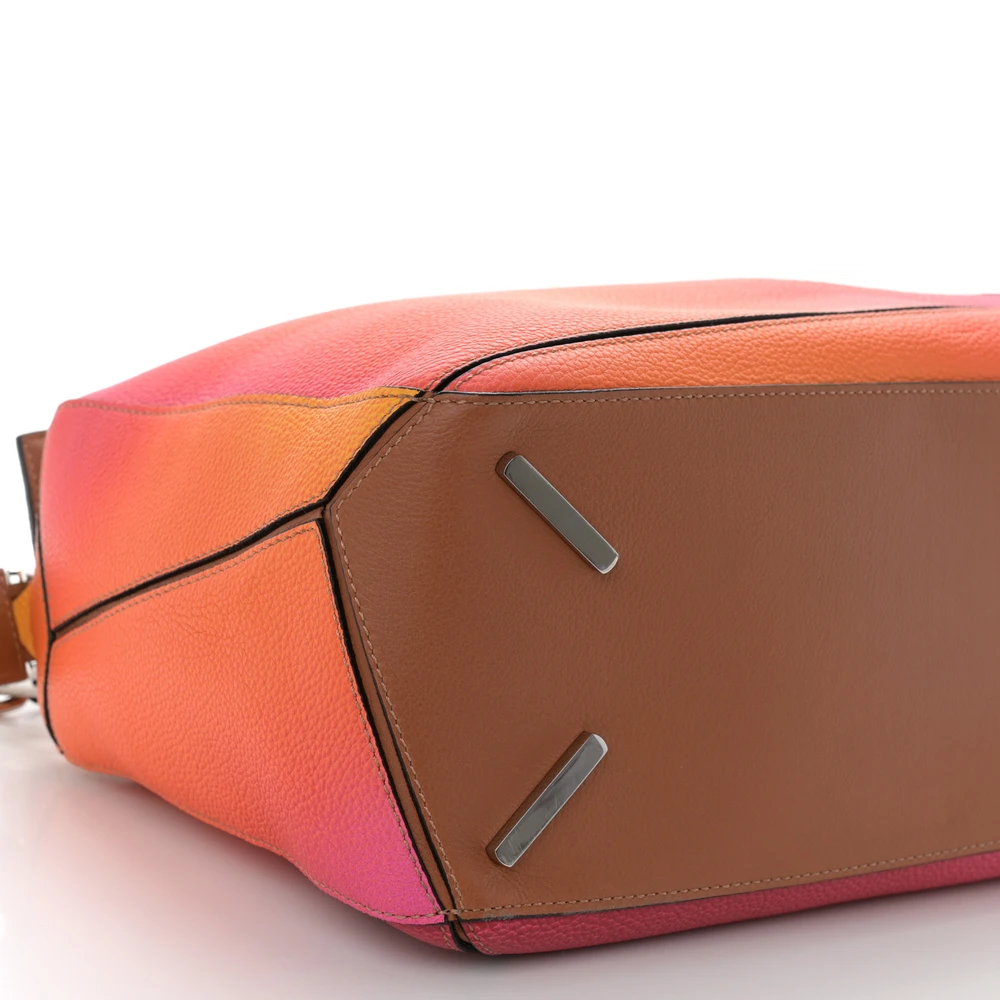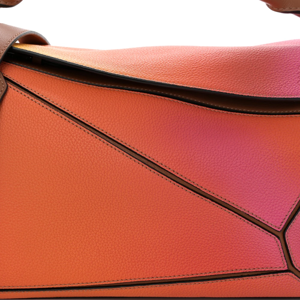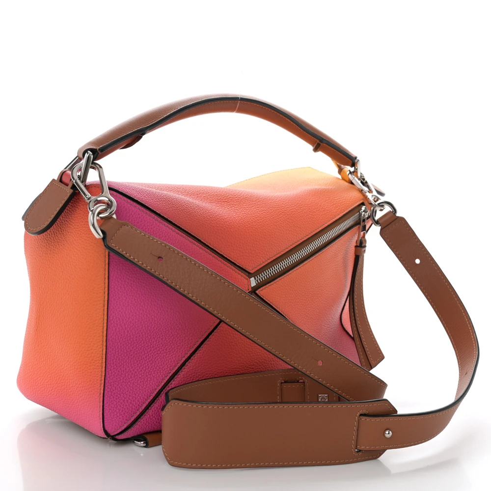 This Loewe Puzzle Bag Medium in Orange Sunset showcases a bold, vibrant hue in calfskin leather. Featuring the iconic geometric design, it blends functionality with artistic flair. Its spacious interior makes it ideal for everyday essentials. The structured shape adds a contemporary edge. Adjustable strap ensures versatility for shoulder or crossbody wear. Perfect for adding a pop of color to any outfit.