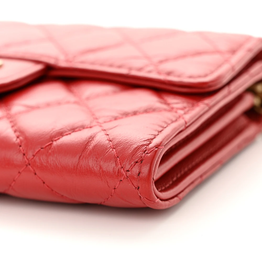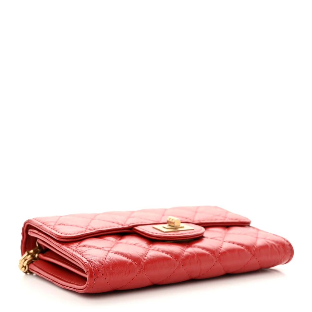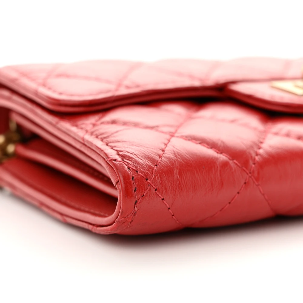 This Chanel 2.55 Reissue Wallet On Chain (WOC) Small in Red Quilted Aged Calfskin Leather with Gold Hardware is a timeless and elegant bag. The aged calfskin leather offers a vintage-inspired charm, while the red hue adds vibrancy. Gold hardware enhances its classic appeal, making it perfect for any occasion. Compact yet functional, it features compartments for cards and cash. The chain strap allows for versatile wear, from crossbody to clutch. A chic and practical addition to your collection.
