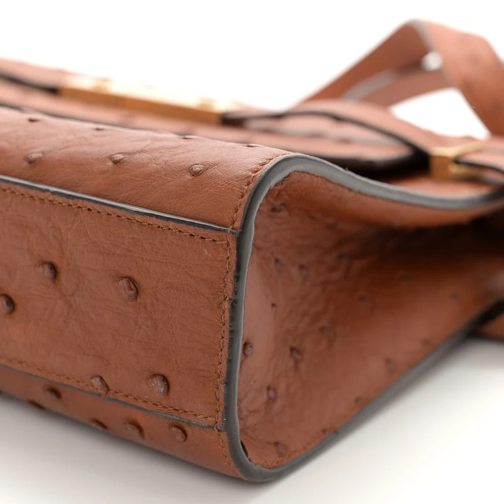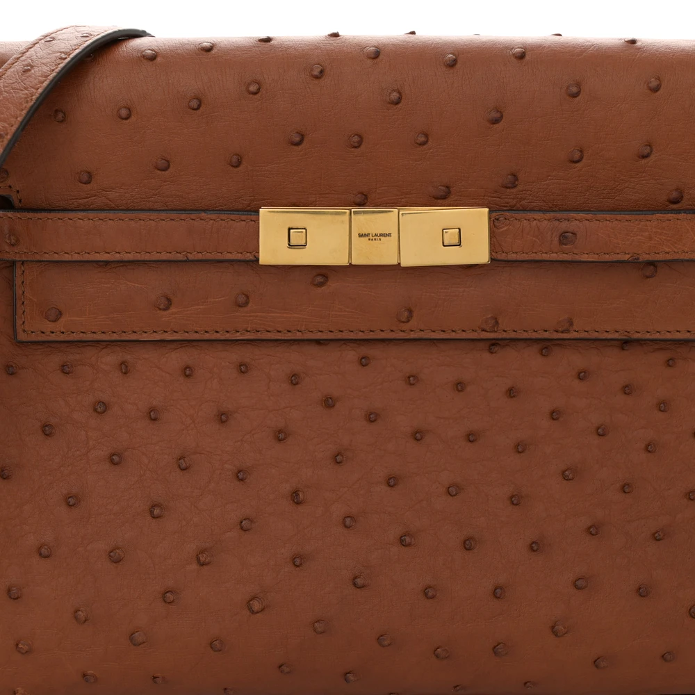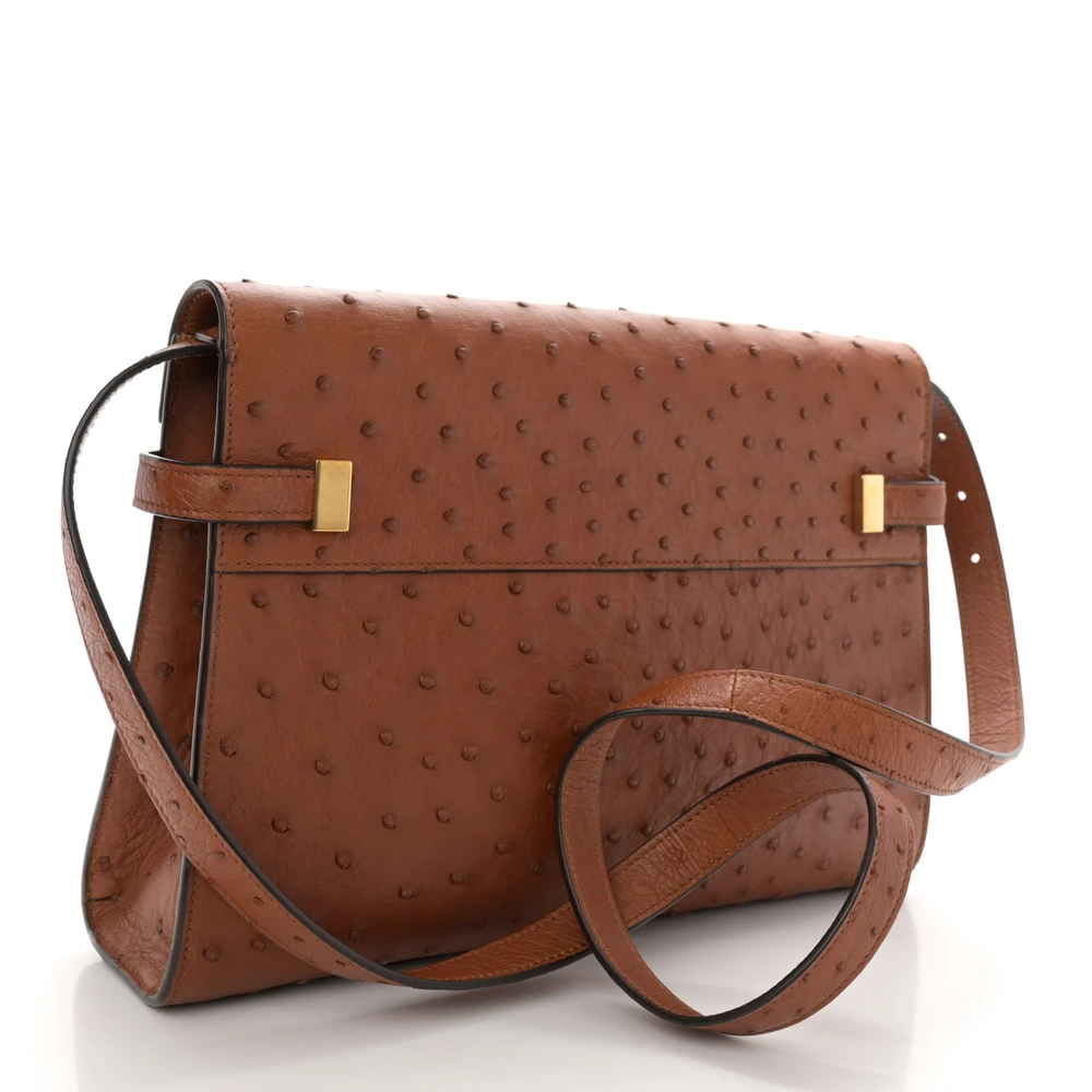 This Small Manhattan Shoulder Bag in Cognac showcases luxurious Ostrich Leather with brass hardware. Its structured silhouette and compact design exude sophistication, perfect for formal occasions or elegant day wear. The interior offers ample space for essentials, while the adjustable strap provides versatile carrying options. A statement piece, this bag combines exotic texture with timeless charm.