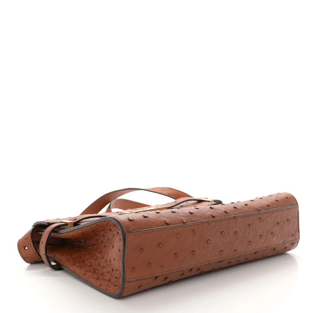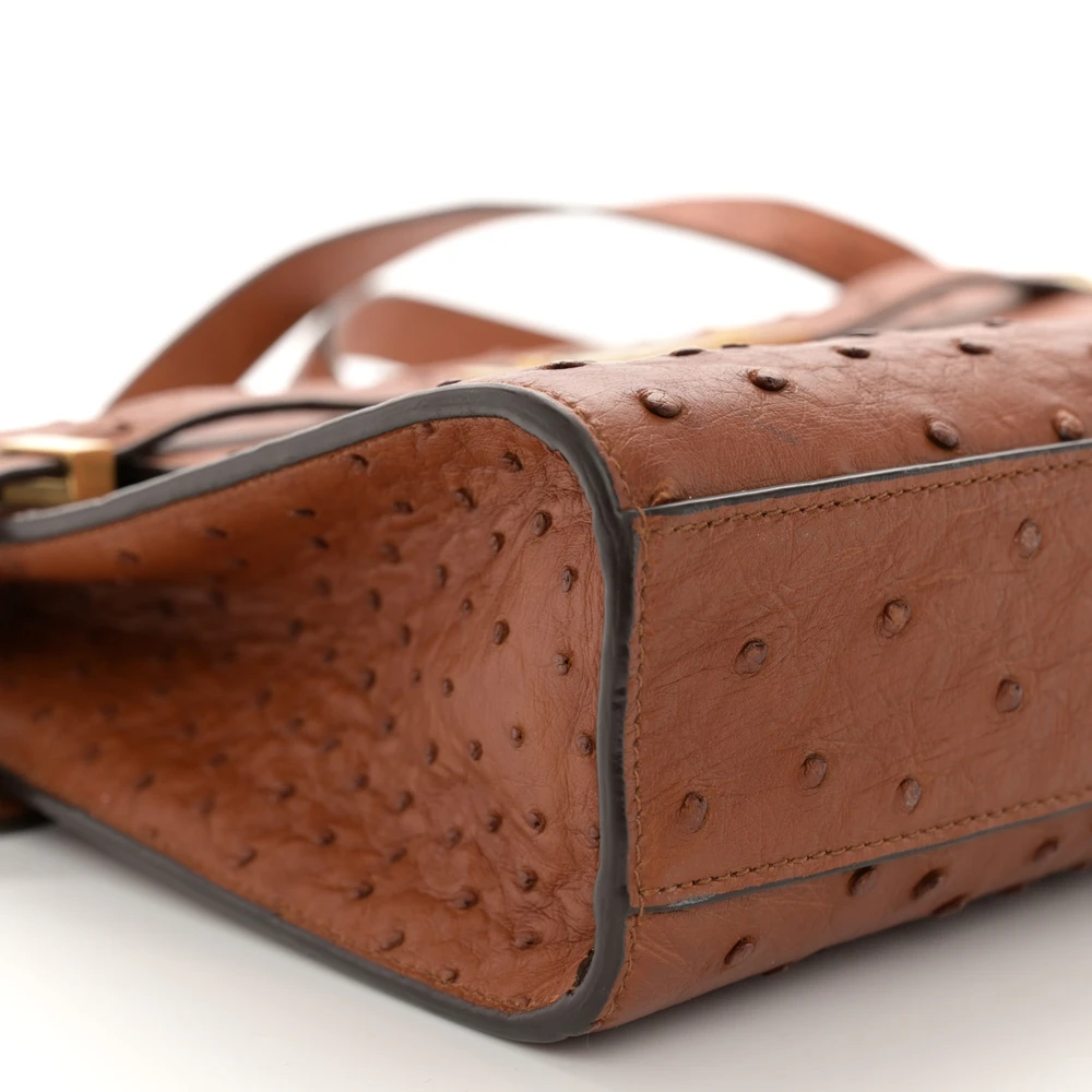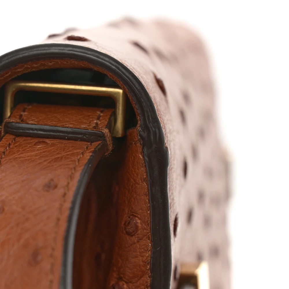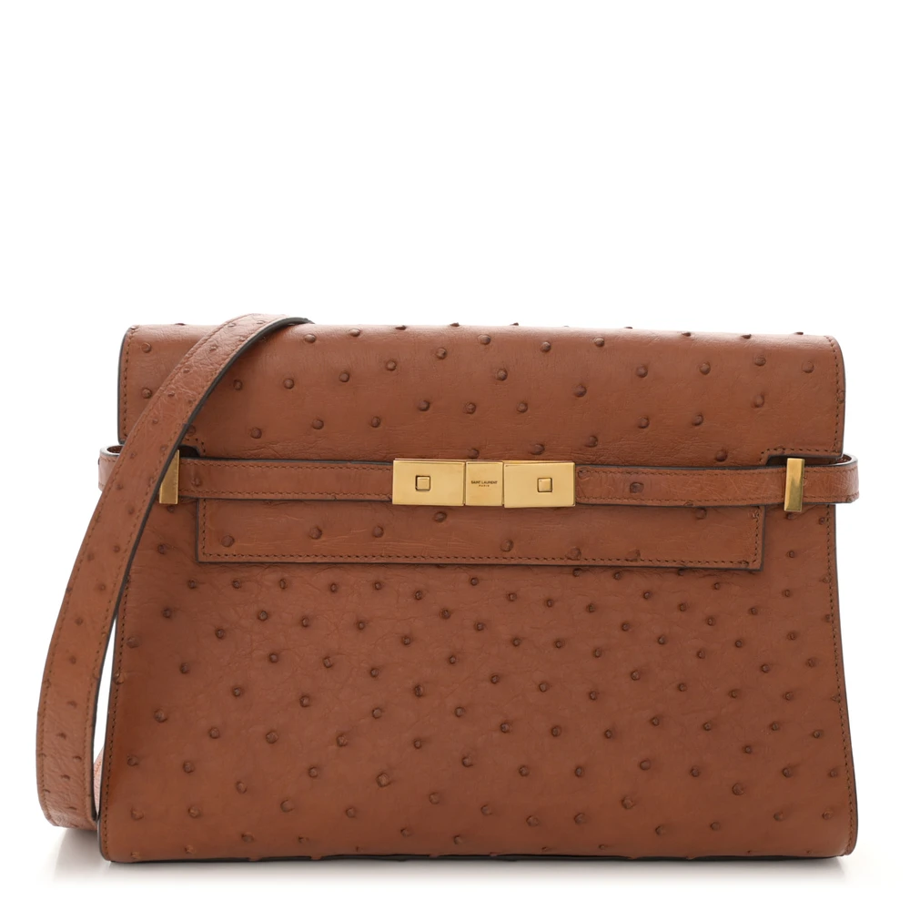 This Small Manhattan Shoulder Bag in Cognac showcases luxurious Ostrich Leather with brass hardware. Its structured silhouette and compact design exude sophistication, perfect for formal occasions or elegant day wear. The interior offers ample space for essentials, while the adjustable strap provides versatile carrying options. A statement piece, this bag combines exotic texture with timeless charm.