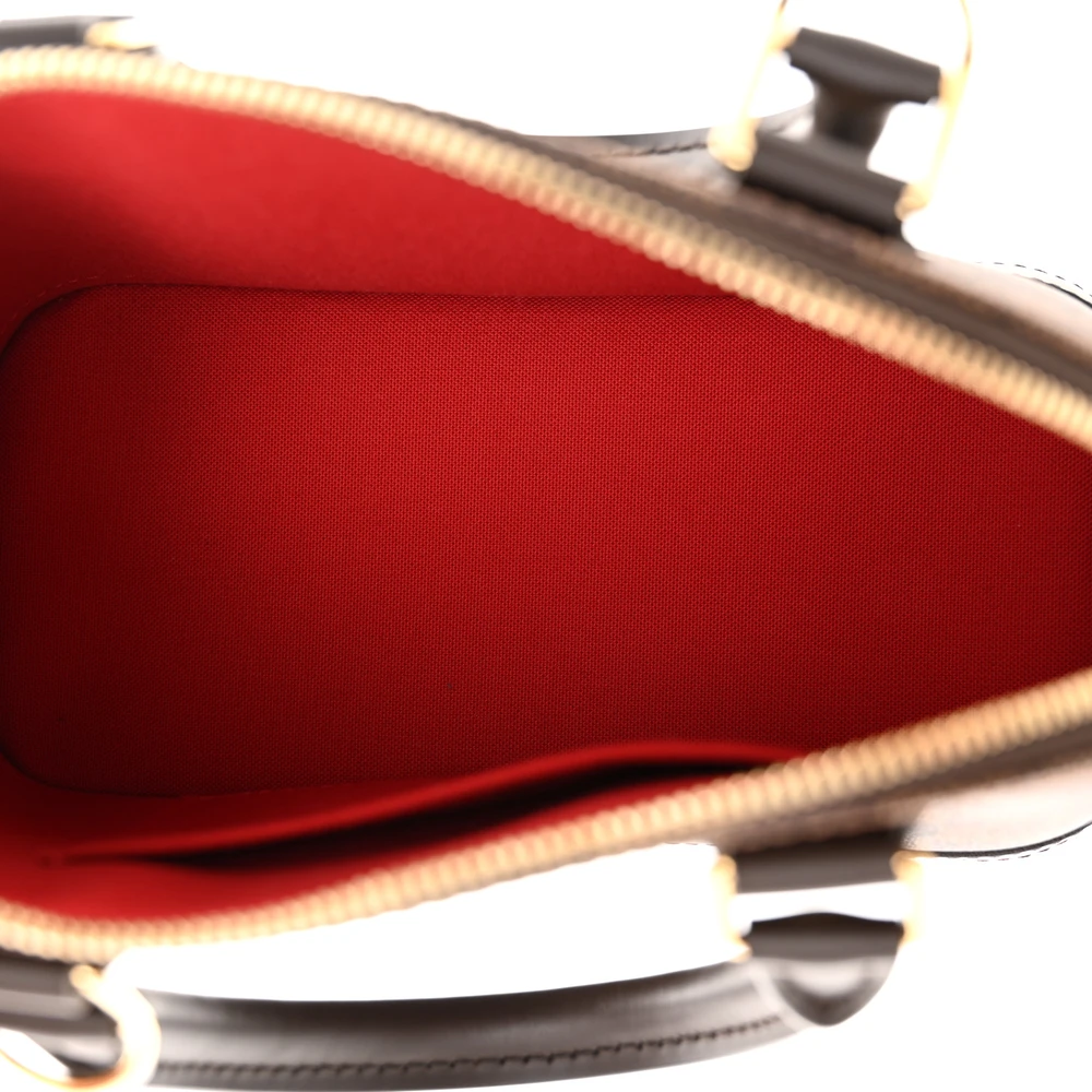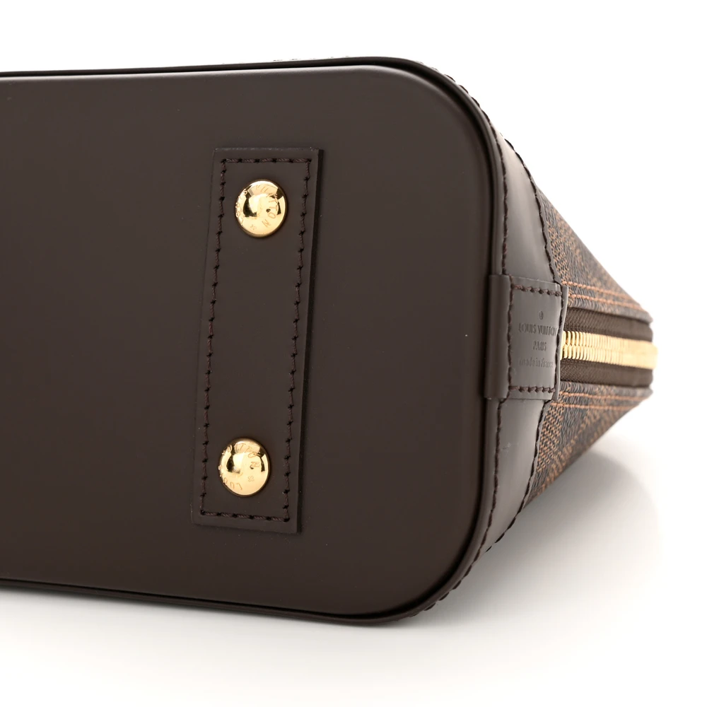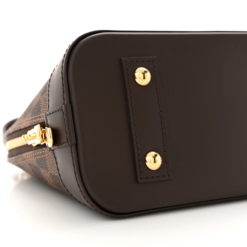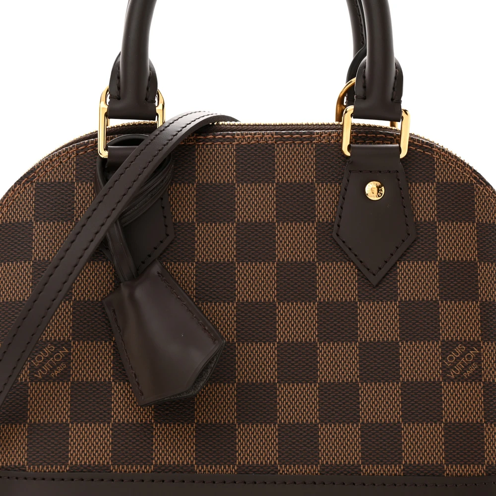 This Louis Vuitton Alma BB Damier Ebene Canvas Brass Hardware is a chic and sophisticated handbag made from durable Damier Ebene canvas. The brass hardware adds a touch of luxury, while the structured shape ensures easy access to your essentials. A perfect blend of elegance and practicality.