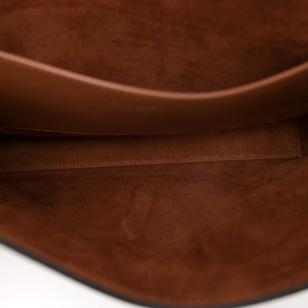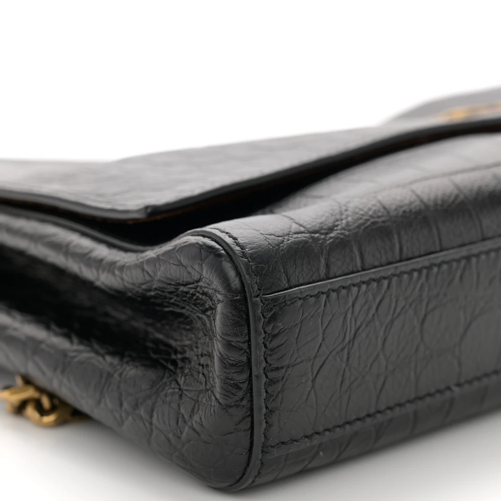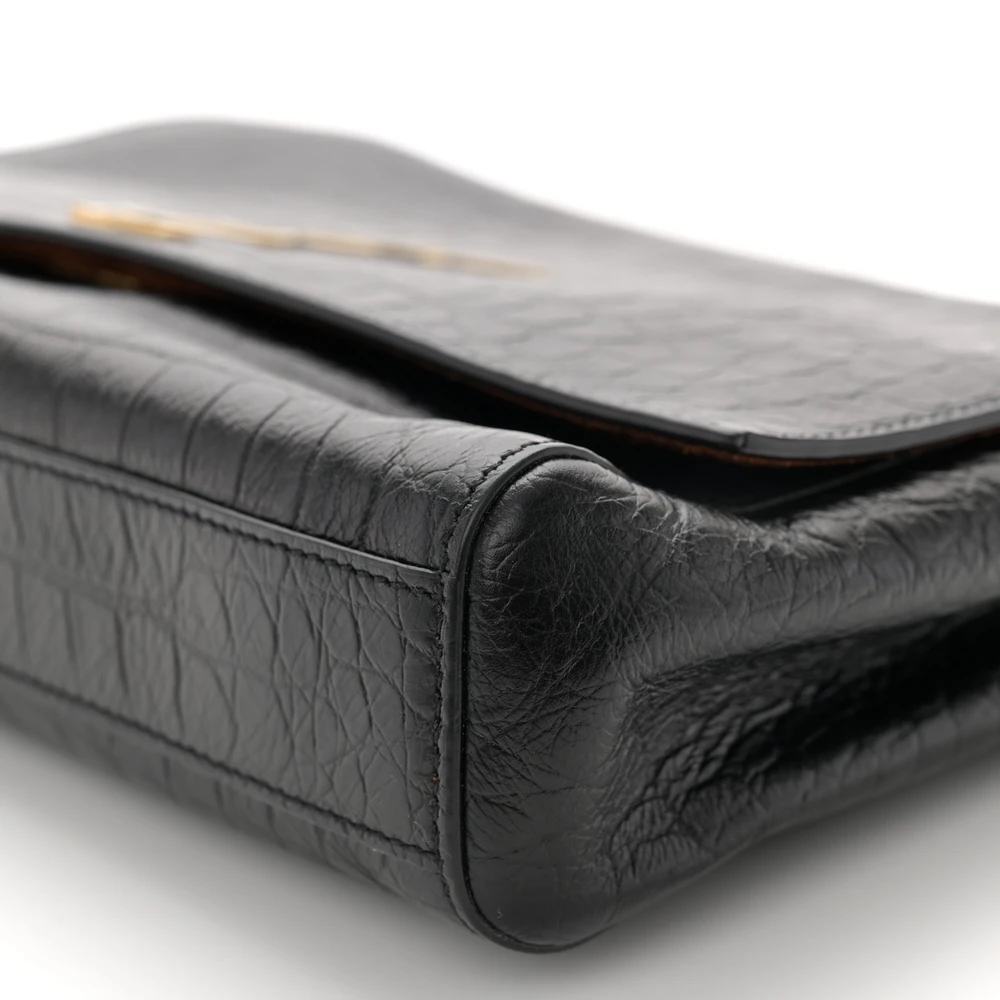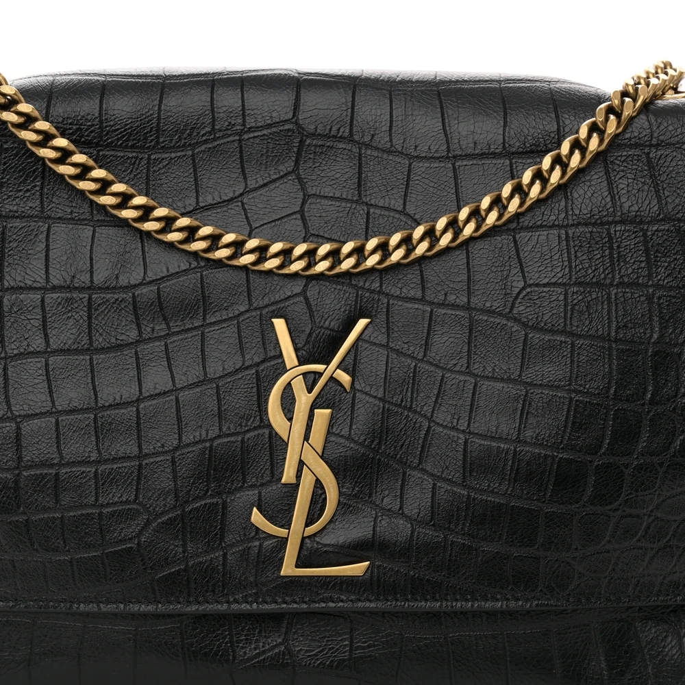 This Saint Laurent Medium Kate Satchel in Black offers reversible styling with Smooth Calfskin Leather on one side and suede on the other. Accented with aged gold hardware, it exudes timeless sophistication. The chain strap allows for versatile wear, making it perfect for day or evening use. A truly unique addition to any collection.