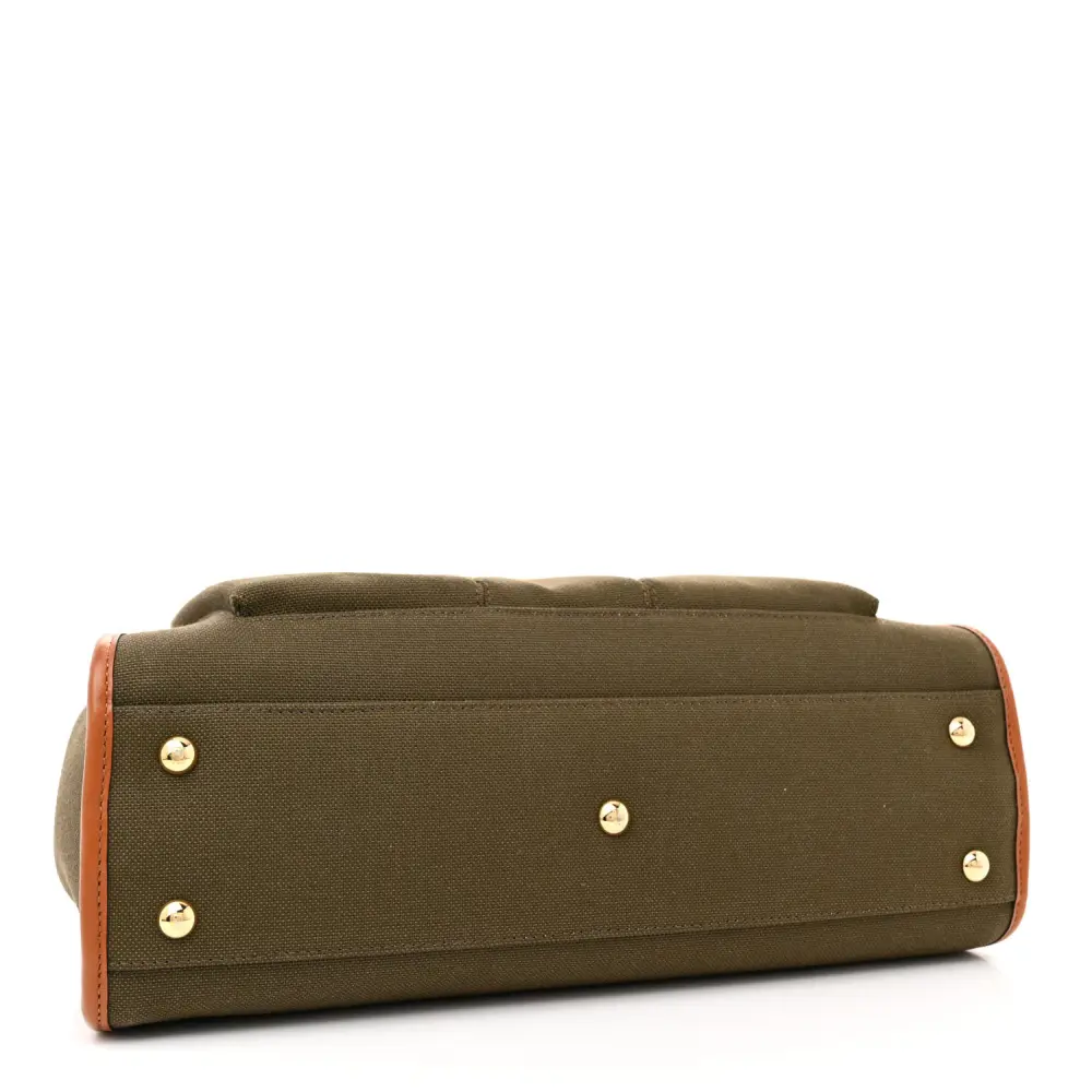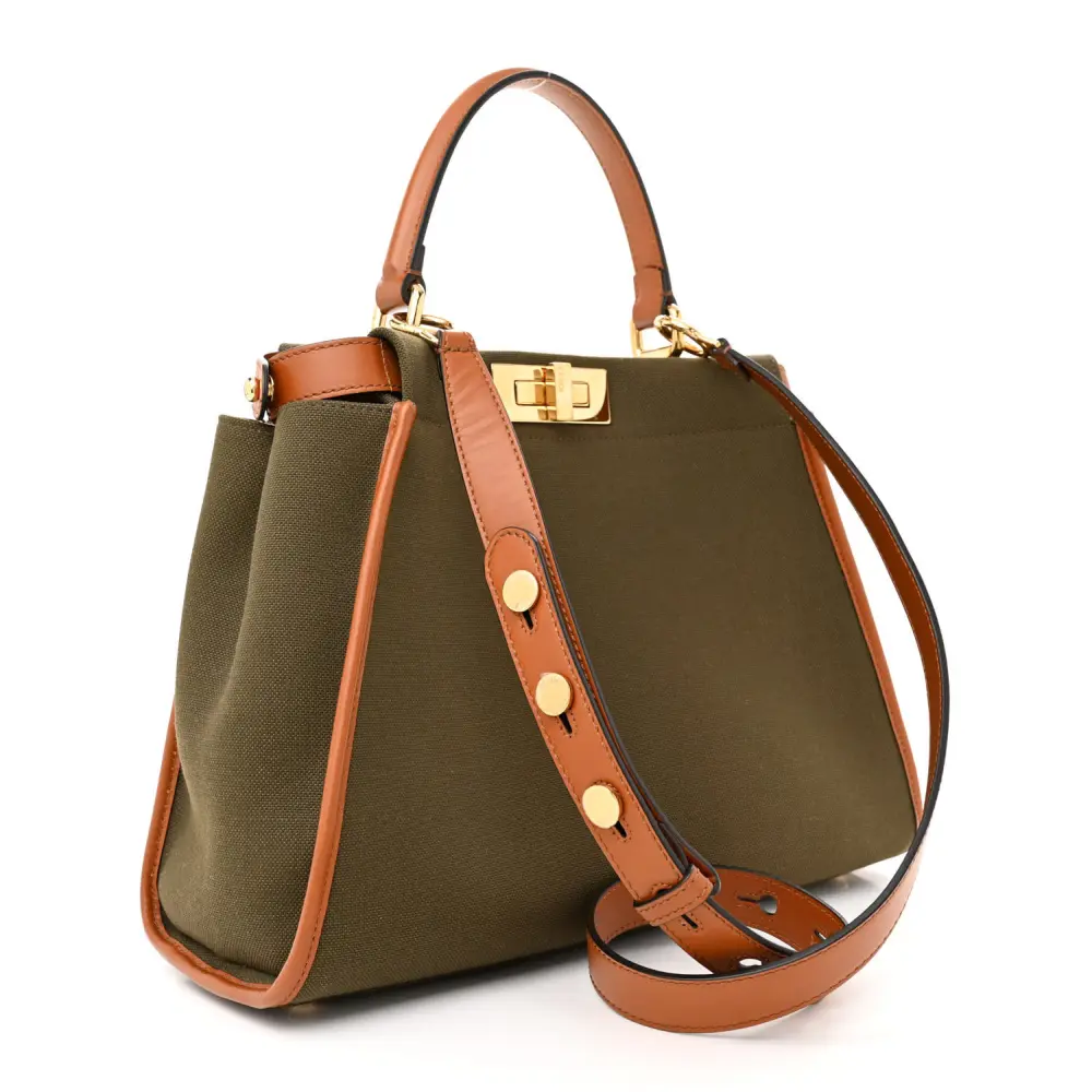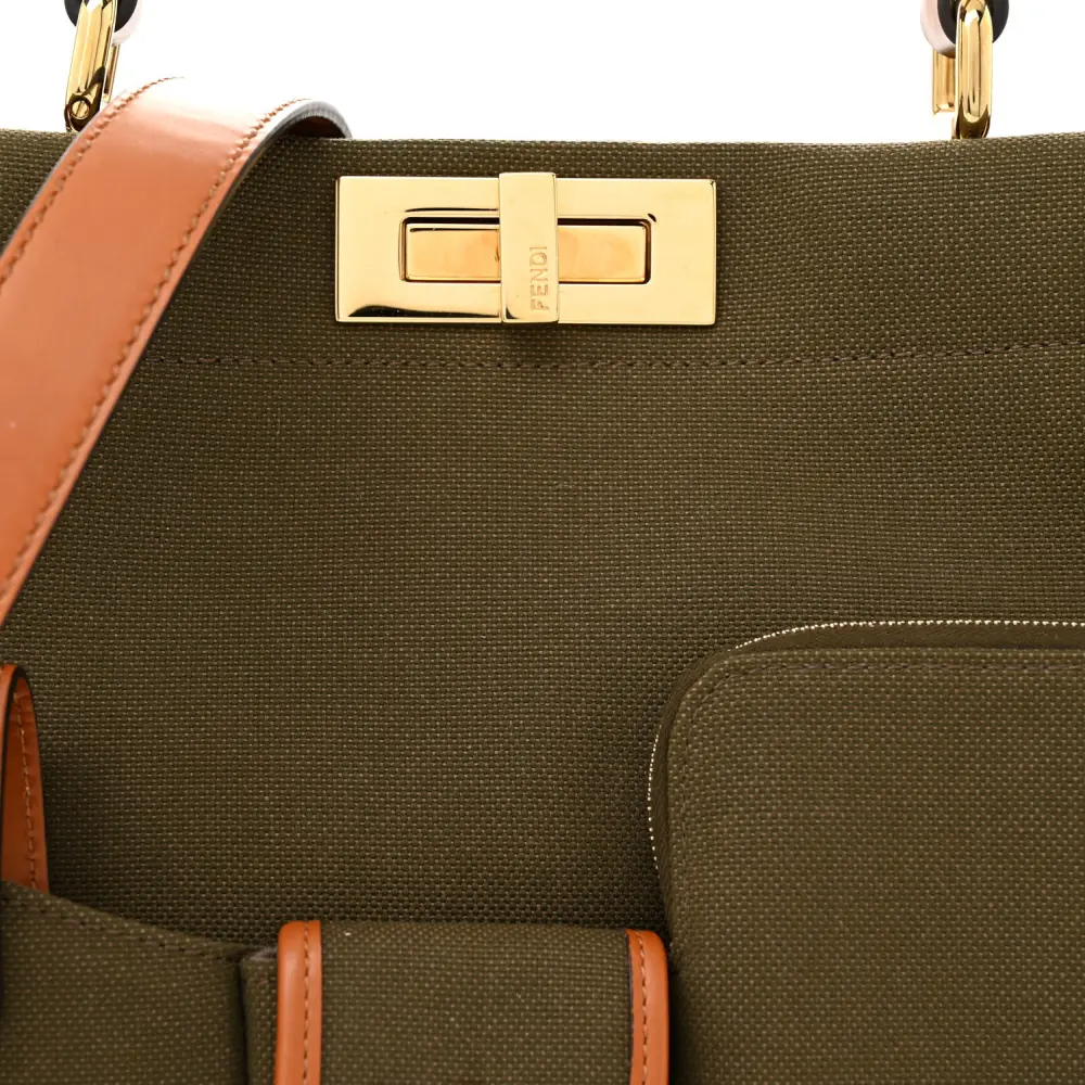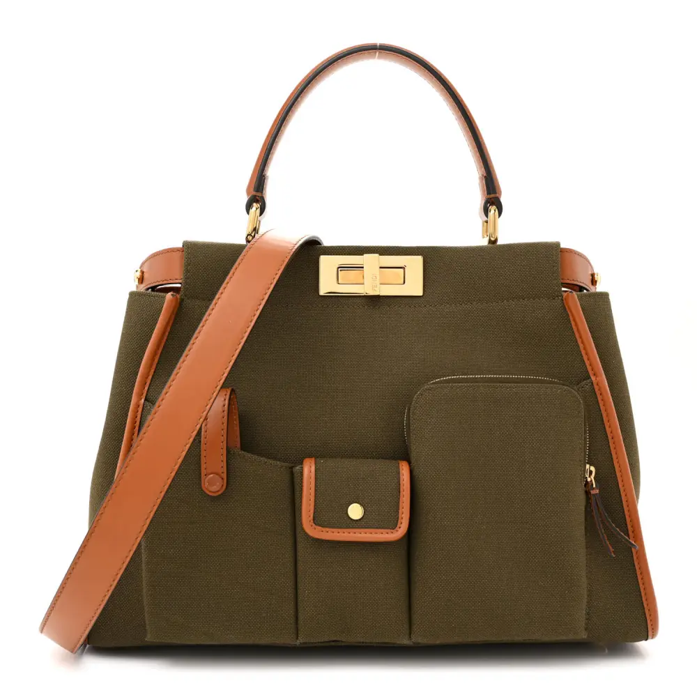 This Fendi Medium 3 Pocket Peekaboo Iconic Satchel in Amazzonia/Cuoio combines Canvas and Calfskin Leather. Gold hardware highlights its timeless silhouette. Three compartments ensure organized storage for essentials. The detachable strap allows multiple carrying options. Its iconic design suits any occasion. Perfect for an effortlessly chic look.