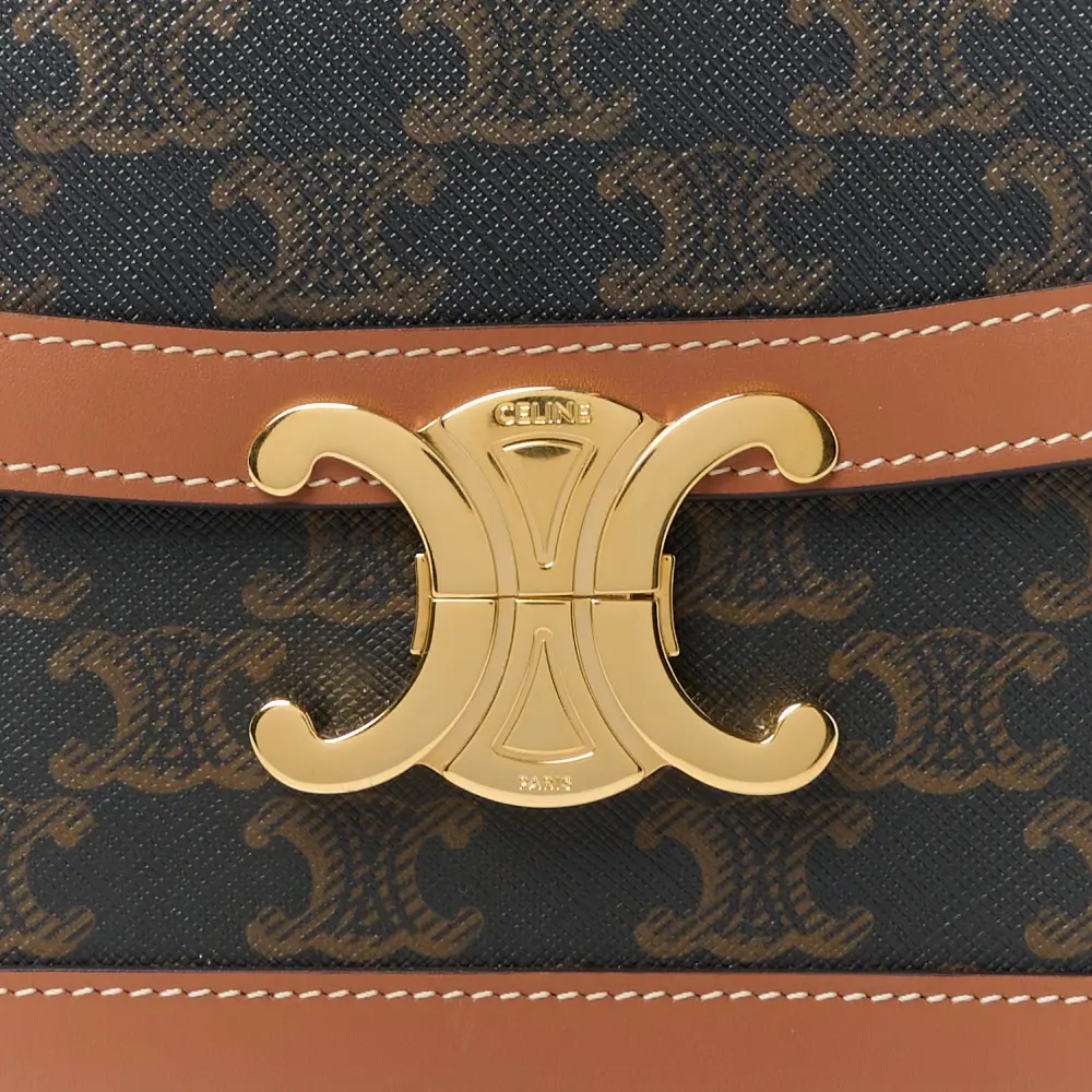 This Celine Medium Triomphe Bag in Tan combines Triomphe canvas and calfskin leather with gold hardware. Its structured silhouette adds elegance to its design. Spacious enough for essentials, it’s perfect for everyday wear. A timeless and sophisticated accessory.
