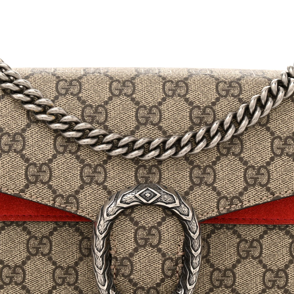 This Gucci Small Dionysus Shoulder Bag is designed in striking red GG Supreme monogram coated canvas. Aged silver hardware enhances its vintage charm. Compact size is ideal for day-to-night transitions. Features a signature Dionysus closure for added style. Adjustable strap provides versatile carrying options. A timeless and bold statement piece.