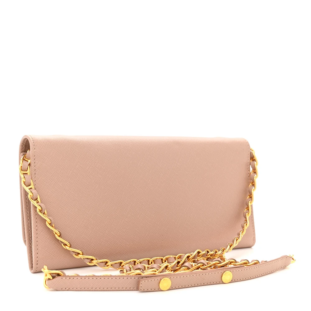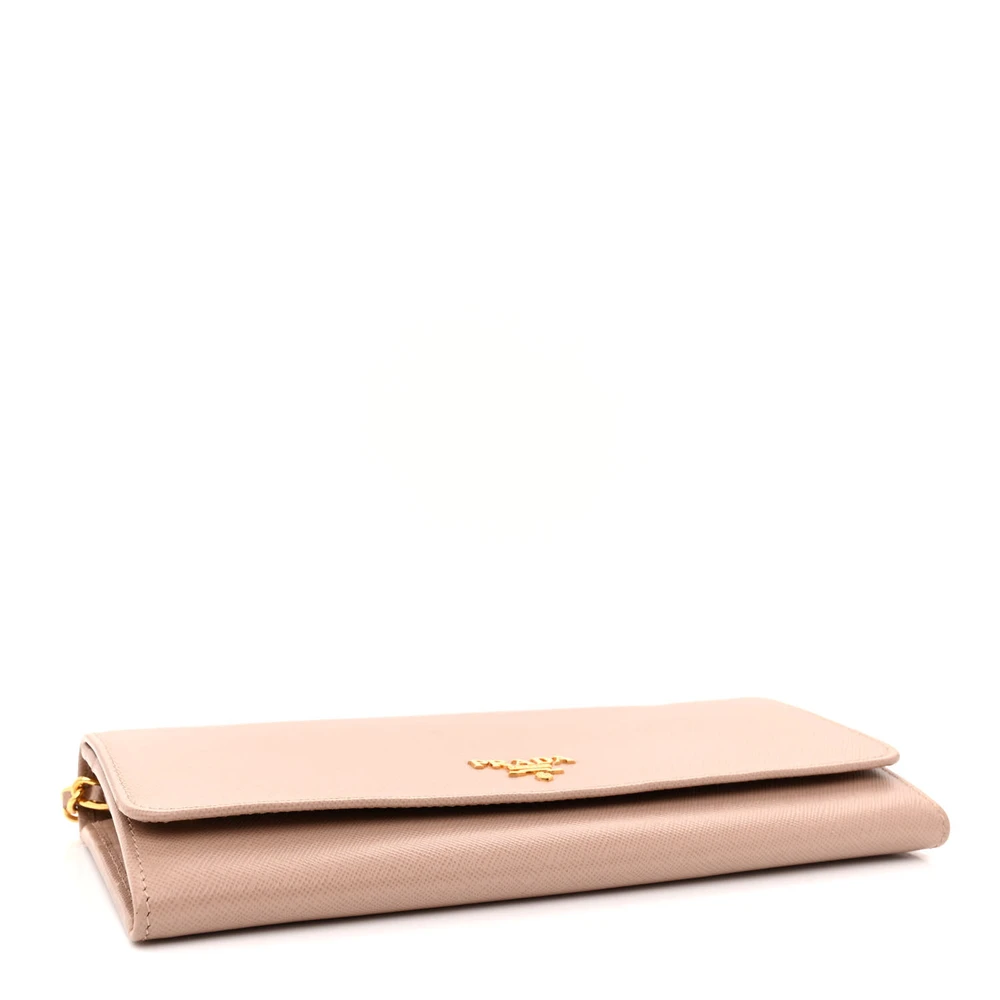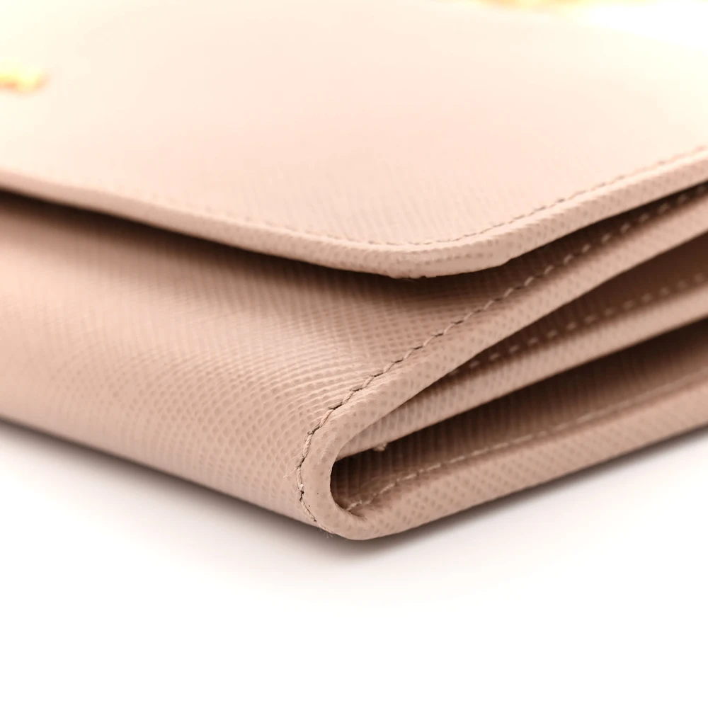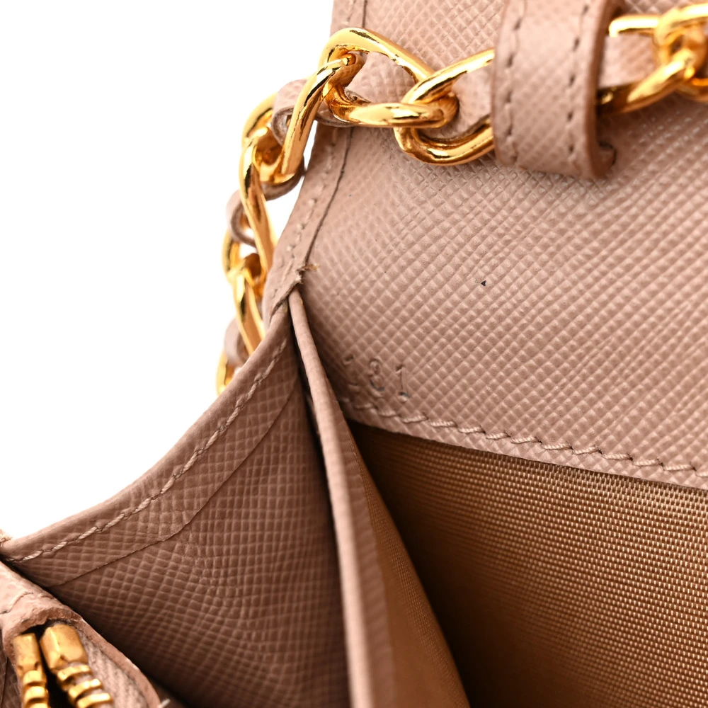 This Prada Small Metal Oro Chain Wallet in Cammeo is crafted from Saffiano leather. Gold hardware adds a sophisticated touch. Compact yet spacious enough for cards and cash. Chain strap offers versatile carrying options. Perfect for evenings or special events. A timeless and elegant wallet.