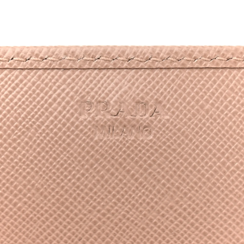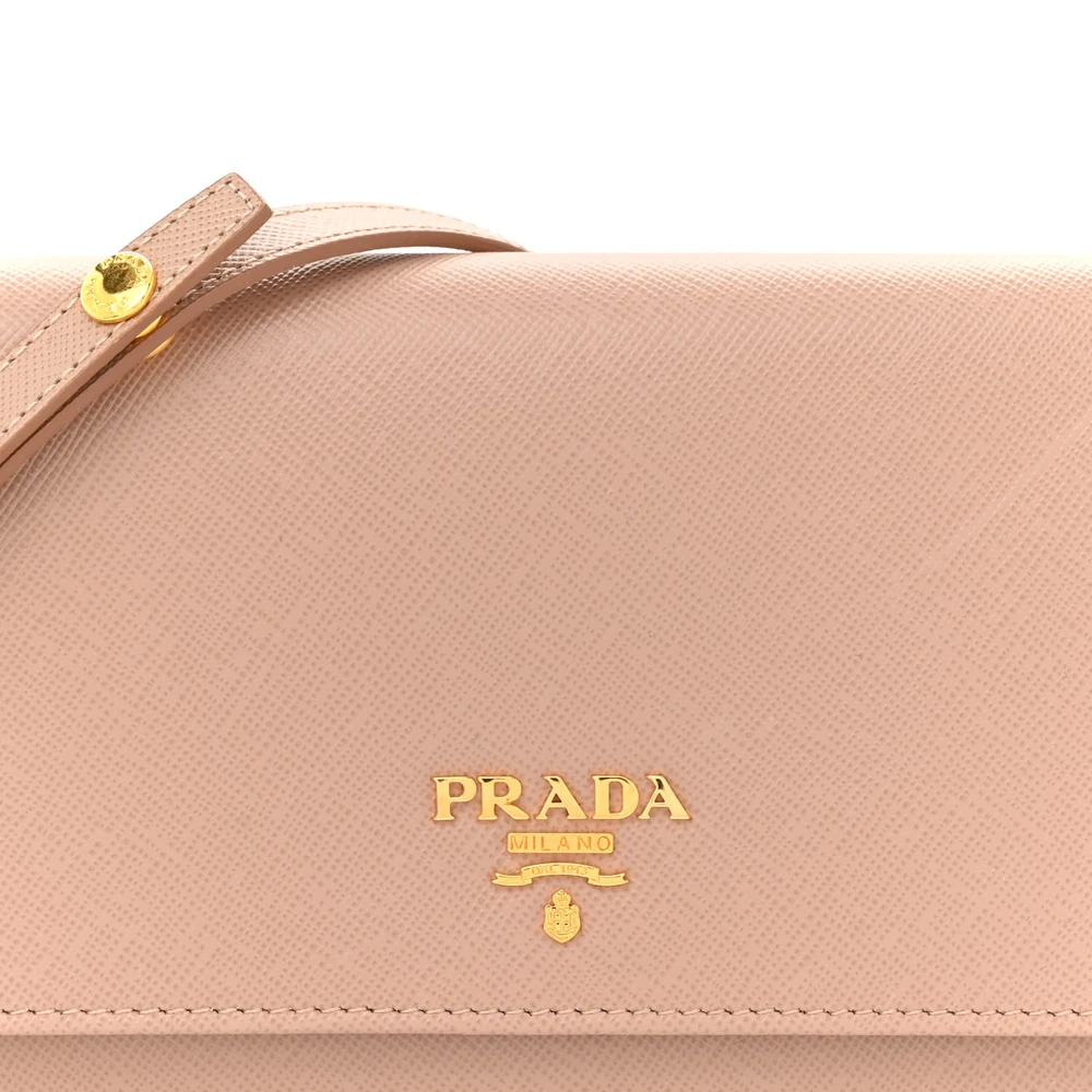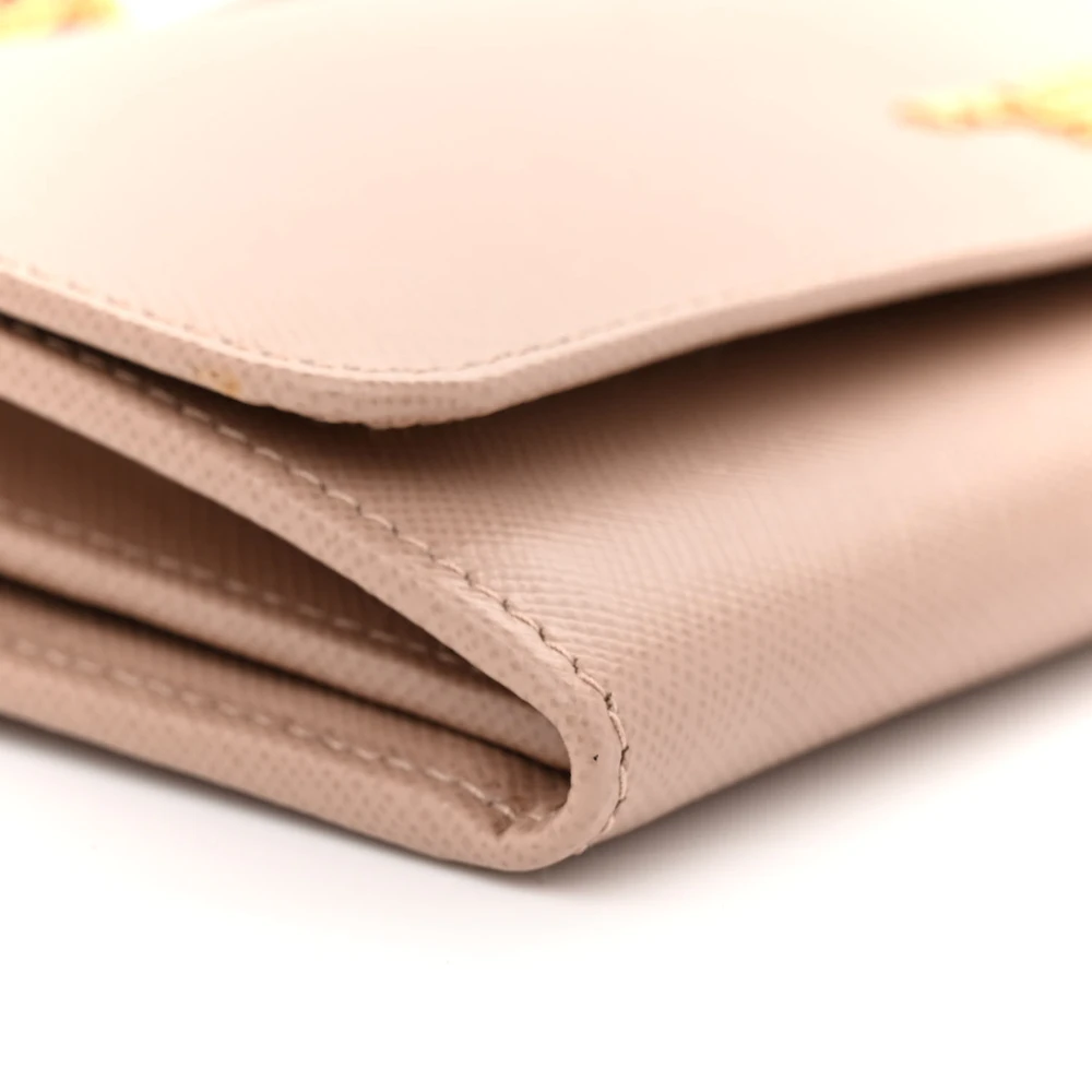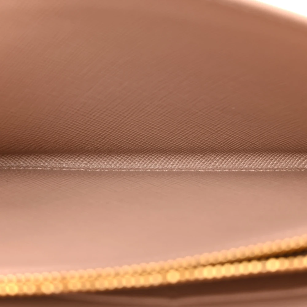 This Prada Small Metal Oro Chain Wallet in Cammeo is crafted from Saffiano leather. Gold hardware adds a sophisticated touch. Compact yet spacious enough for cards and cash. Chain strap offers versatile carrying options. Perfect for evenings or special events. A timeless and elegant wallet.