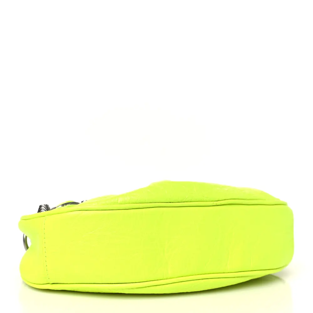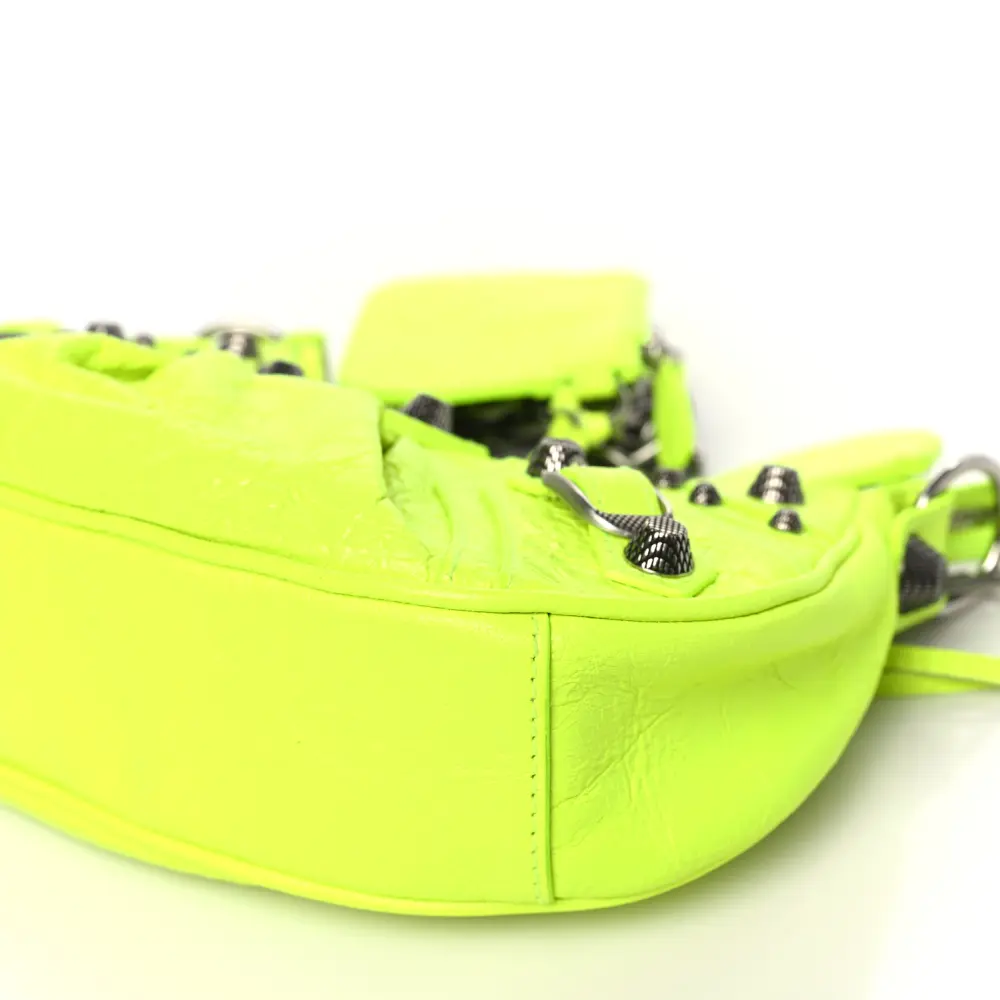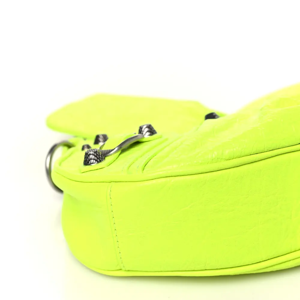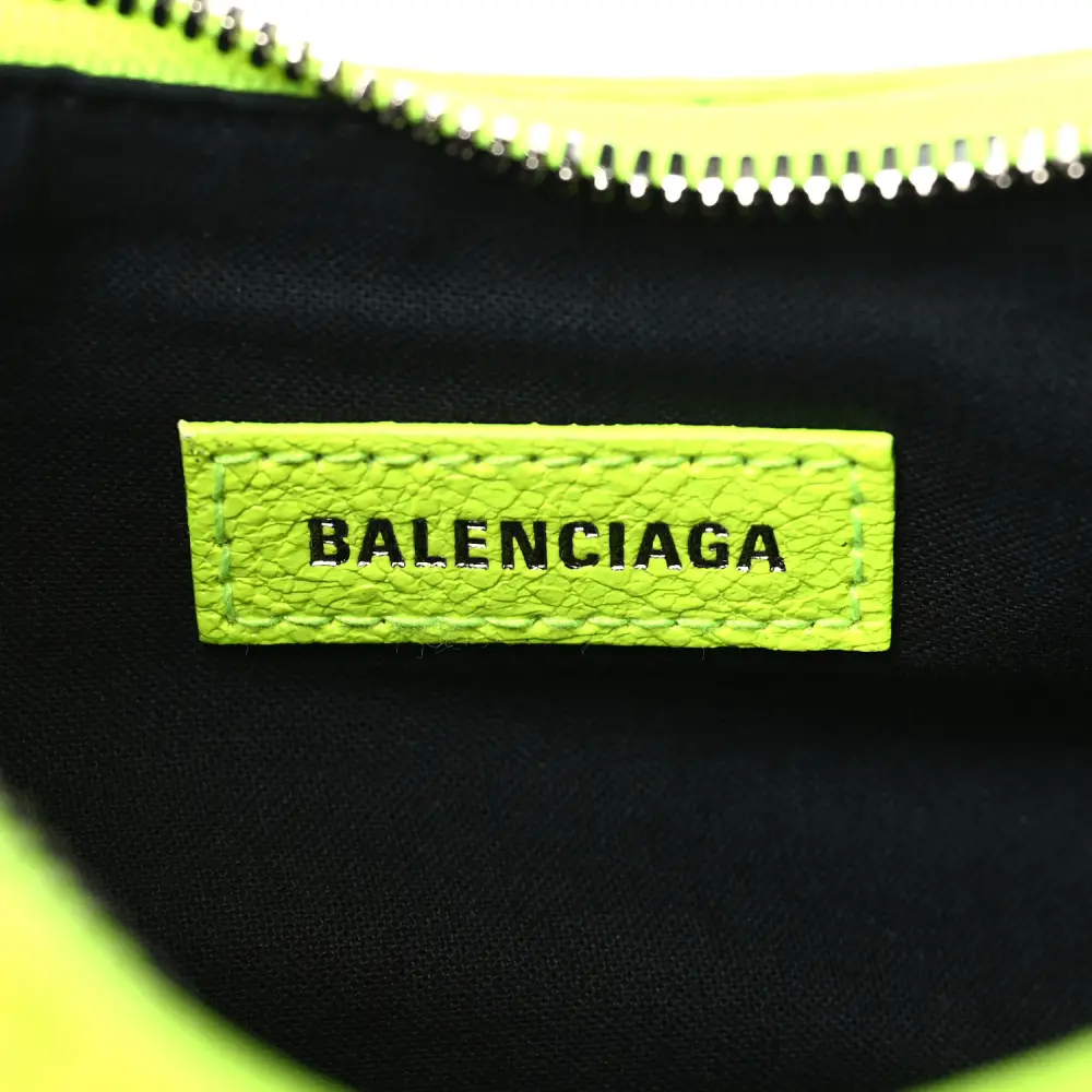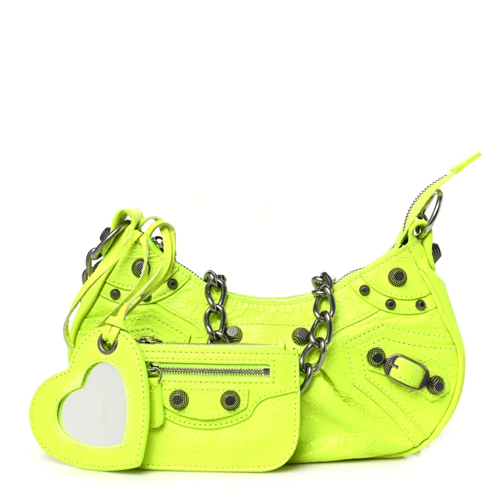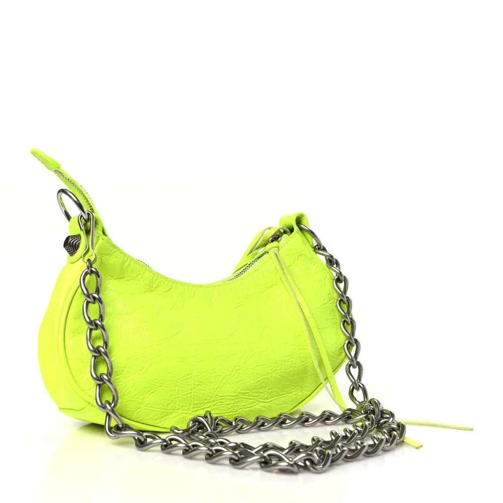 This Balenciaga XS Le Cagole Chain Shoulder Bag in Fluo Yellow adds a vibrant pop to any outfit. Made from Agneau Arena leather, it features silver hardware and bold chain detailing for an edgy, modern look. Its compact size makes it perfect for carrying your essentials while maintaining a statement-making aesthetic. Adjustable straps ensure versatile styling options for day or night. Elevate your wardrobe with this eye-catching accessory.
