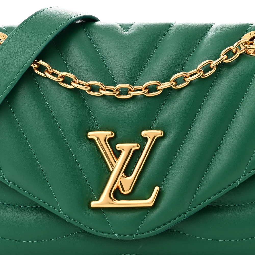 This Louis Vuitton New Wave Chain Bag MM NM Emerald Calfskin Leather Gold Hardware is a bold and modern handbag. Made from emerald-colored calfskin leather, it features a striking wave pattern for added texture. The MM size offers ample space for your essentials, while the gold hardware adds a touch of luxury.