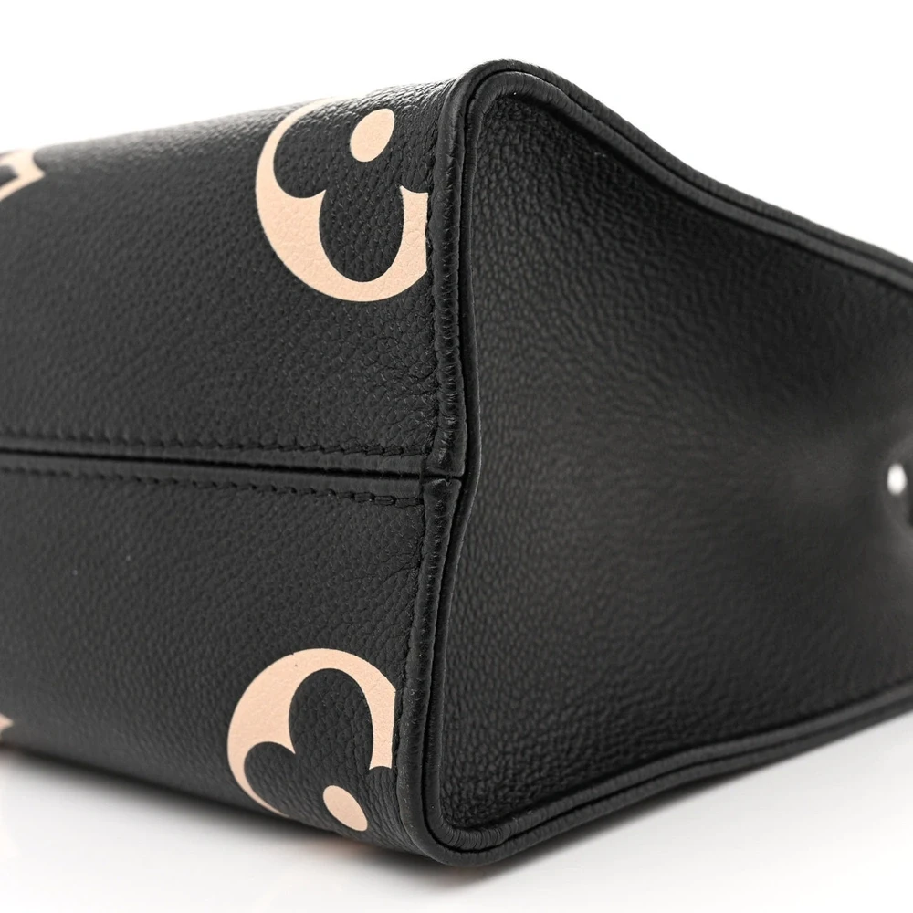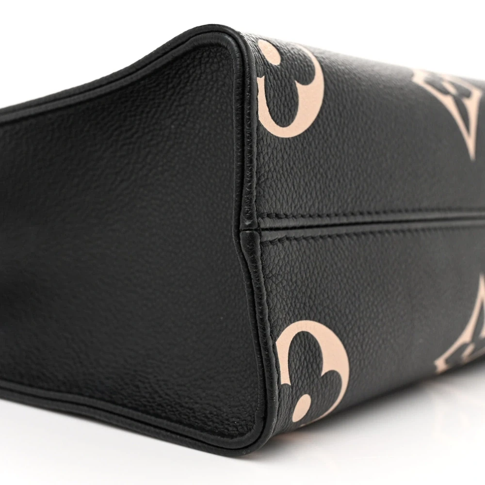 This Louis Vuitton Black/Beige Giant Monogram Empreinte Leather OnTheGo PM is a statement bag that brings sophistication to every occasion. Crafted from embossed monogram empreinte leather, its bold black and beige color combination offers a contemporary twist on the classic design. Brass hardware adds a polished finish, while the spacious interior ensures you can carry all your essentials with ease. The sturdy top handles and adjustable shoulder straps provide versatility and comfort. Perfect for work or play, this bag can seamlessly transition from day to night. A stylish choice for fashion-forward individuals.