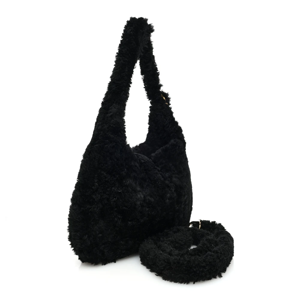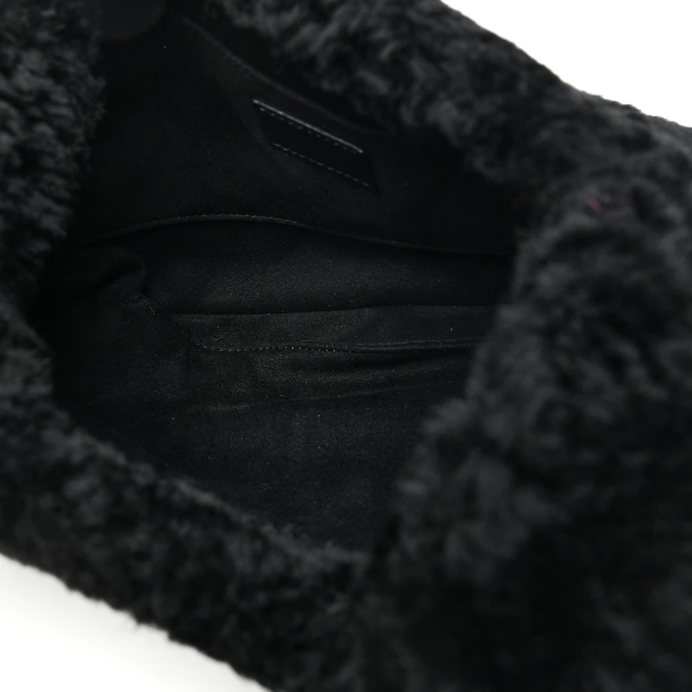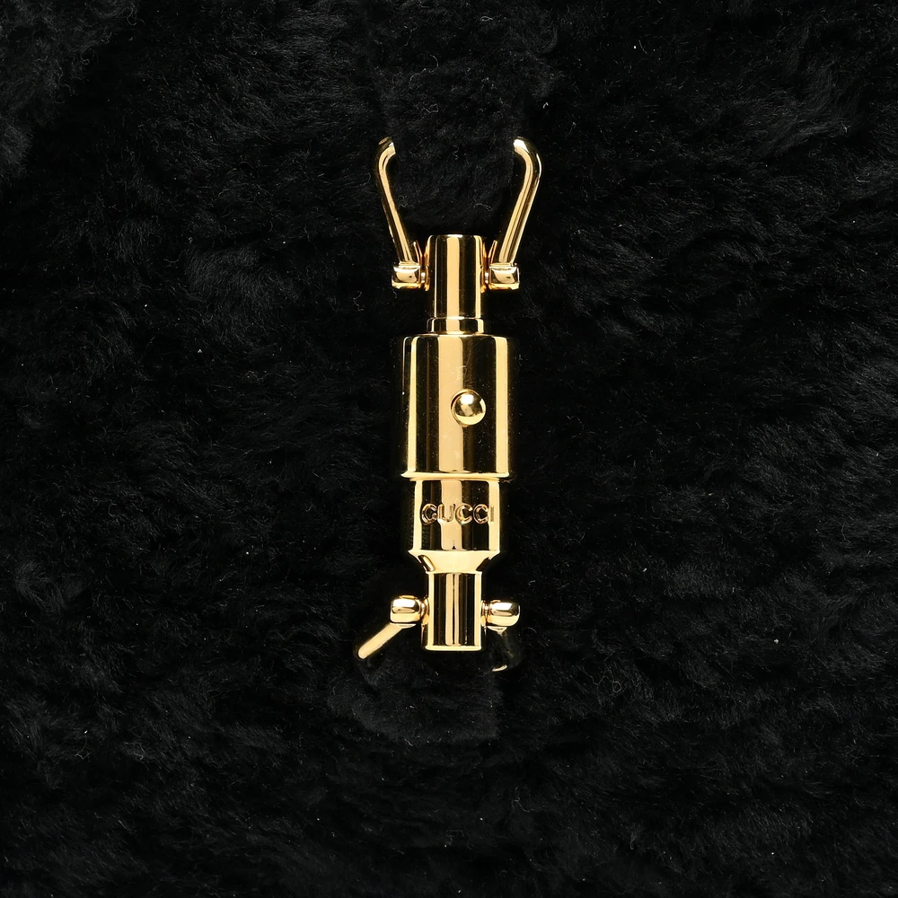 This Gucci Small Jackie 1961 Shoulder Bag is crafted in black shearling for a cozy, chic look. Brass hardware complements its sophisticated design. Compact yet spacious enough for essentials. A versatile accessory for colder months. A blend of fashion and functionality.