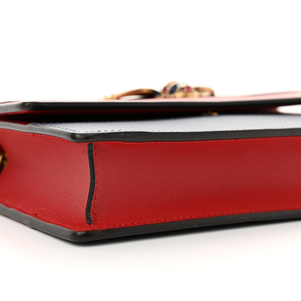 This Gucci Small Queen Margaret Chain Wallet is made from blue agata, hibiscus red, and mystic white calfskin leather. Aged gold hardware highlights its regal appeal. Compact design with a chain strap for versatile styling. Queen Margaret bee detail adds a whimsical touch. Ideal for cards and small essentials. A statement piece with Gucci’s signature flair.