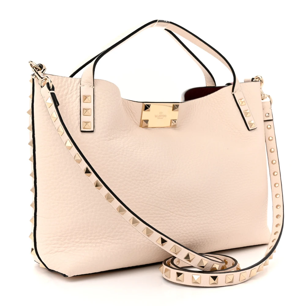 This Valentino Garavani Small Rockstud Flip Lock Tote Bag in Light Ivory/Rubino is chic and practical. Grained calfskin leather with gold hardware creates a polished design. Spacious interior for daily essentials. Rockstud accents add a contemporary edge. Suitable for work or casual outings. A stylish and versatile tote.
