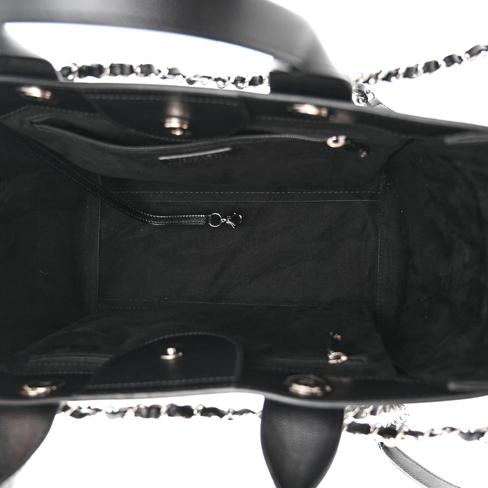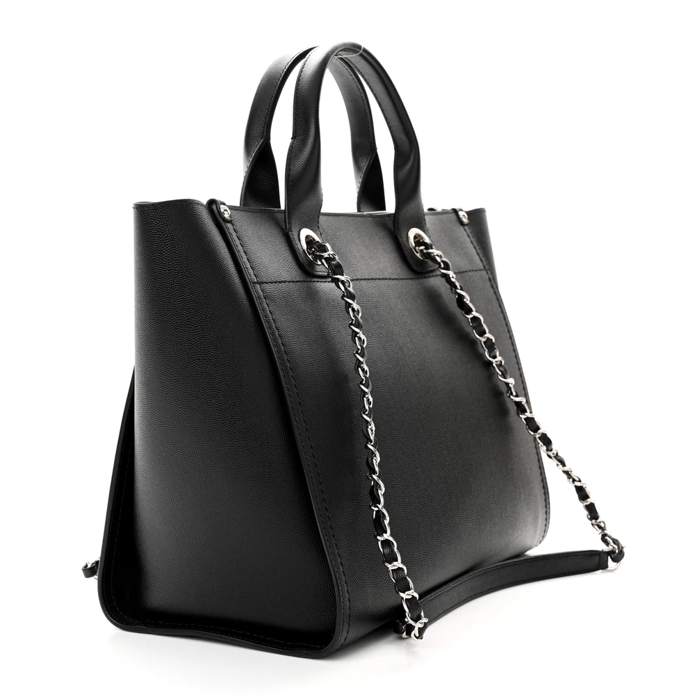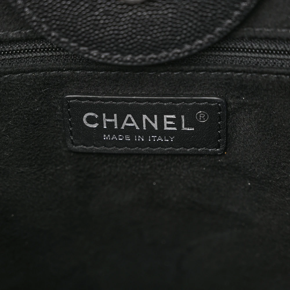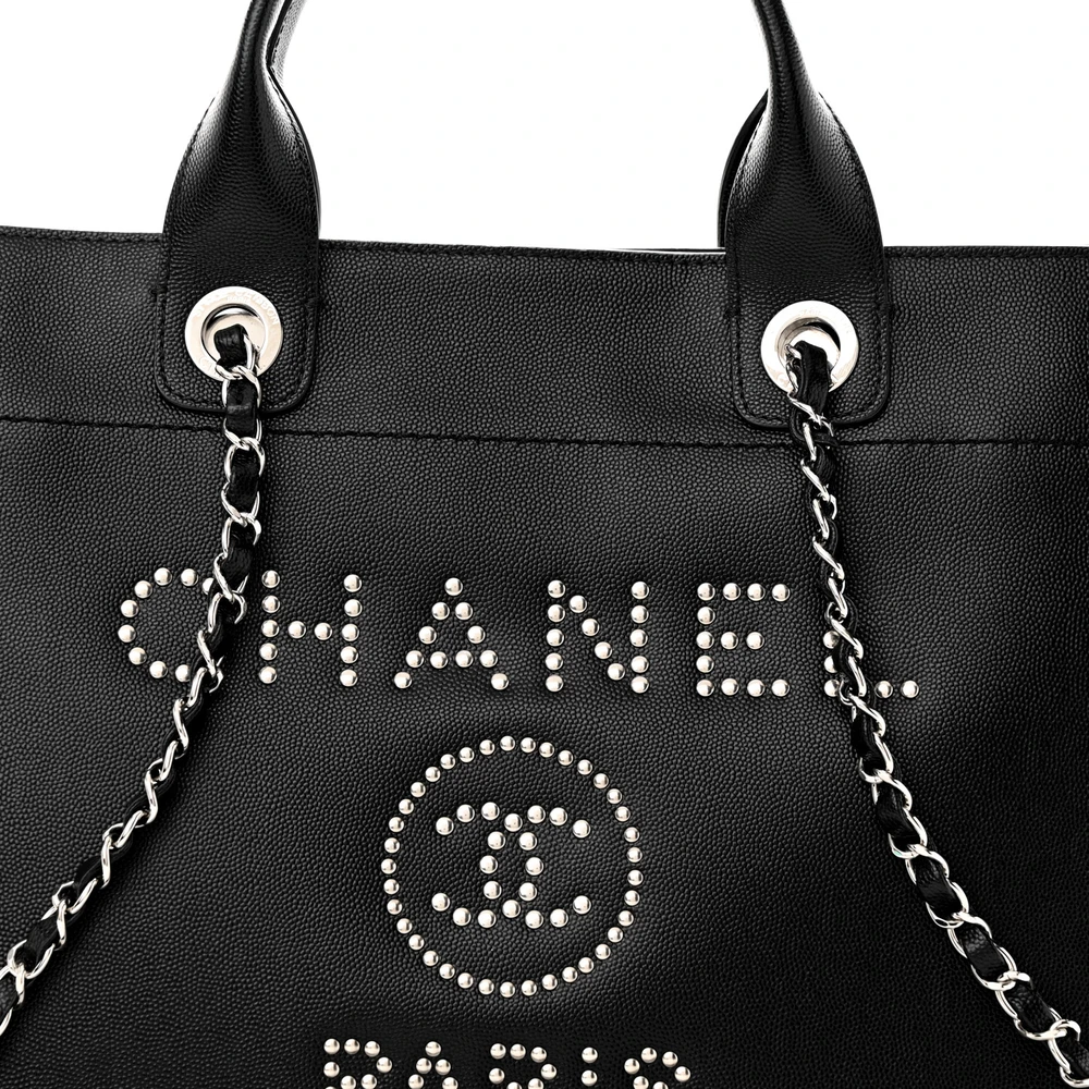 This Chanel Studded Deauville Tote Small in Black Quilted Caviar Leather with Silver Hardware is a modern and edgy piece. The quilted caviar leather is durable and stylish, enhanced by silver stud details. Spacious and practical, it’s perfect for daily use or weekend getaways. The silver hardware adds a sleek contrast to its bold design. A versatile tote for those who love combining functionality with high-fashion.