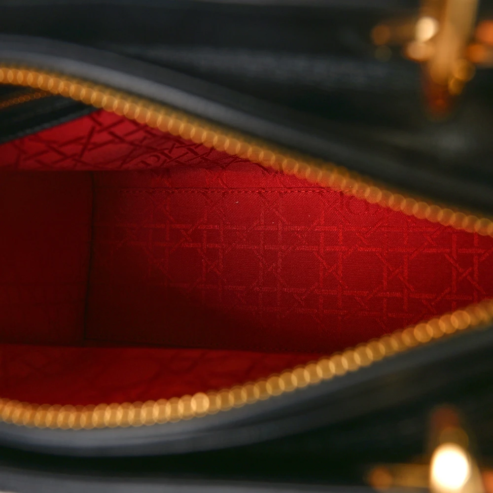 This Dior Medium Lady Dior in Black Cannage Lambskin Leather is the epitome of timeless elegance. Gold hardware accentuates its sophisticated silhouette. Spacious and versatile, it seamlessly transitions from day to evening. The iconic Cannage stitching adds a signature Dior touch. A classic piece that exudes enduring charm.