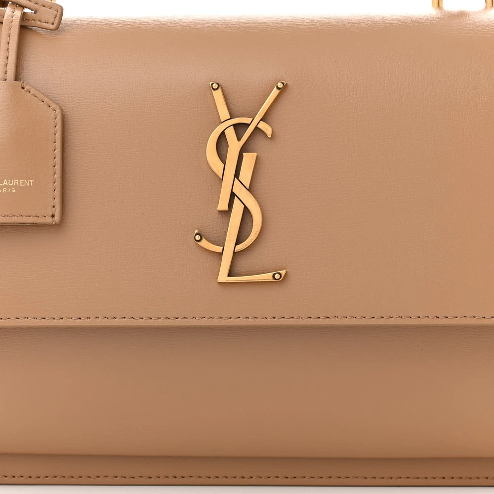 This Medium Sunset Satchel in Natural Tan showcases Smooth Monogram Calfskin Leather with gold hardware. Its structured silhouette and versatile design make it suitable for various occasions. The spacious interior and chain strap offer functionality, while the YSL logo adds classic elegance. A refined choice for effortless style.