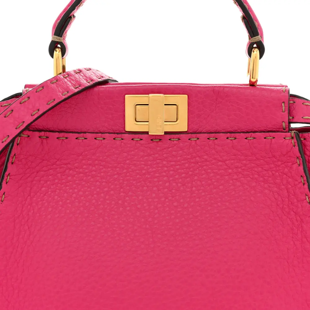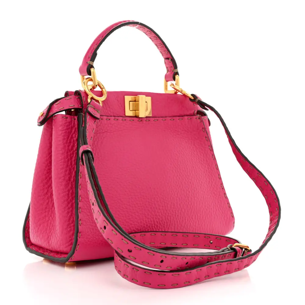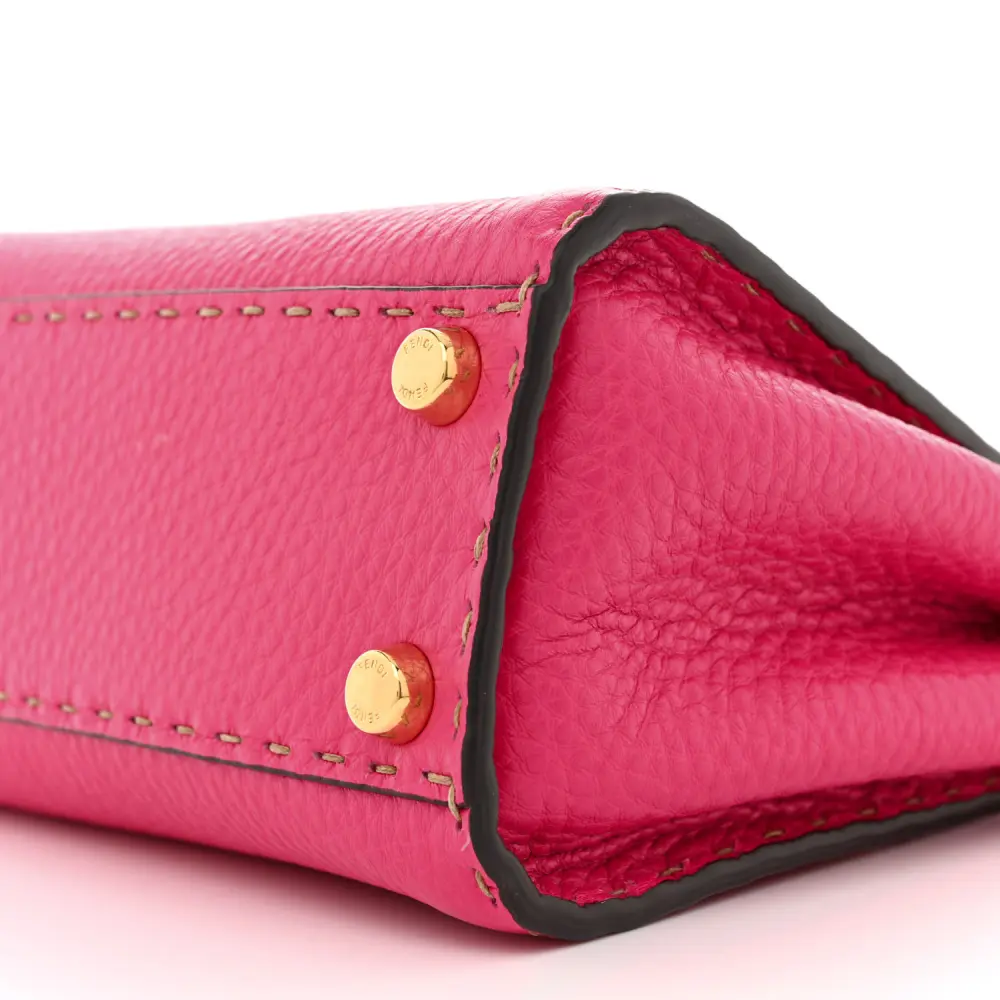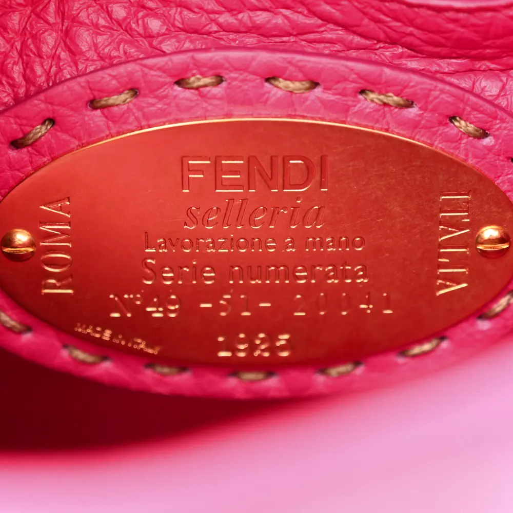 This Fendi Mini Peekaboo Iconic Satchel in Fuxia Cuoio Romano Selleria Leather is bold. Gold hardware adds a touch of luxury to its vibrant design. Spacious yet compact for daily use. Perfect for brightening up any wardrobe. A stylish blend of function and flair. A chic choice for fashion-forward individuals.