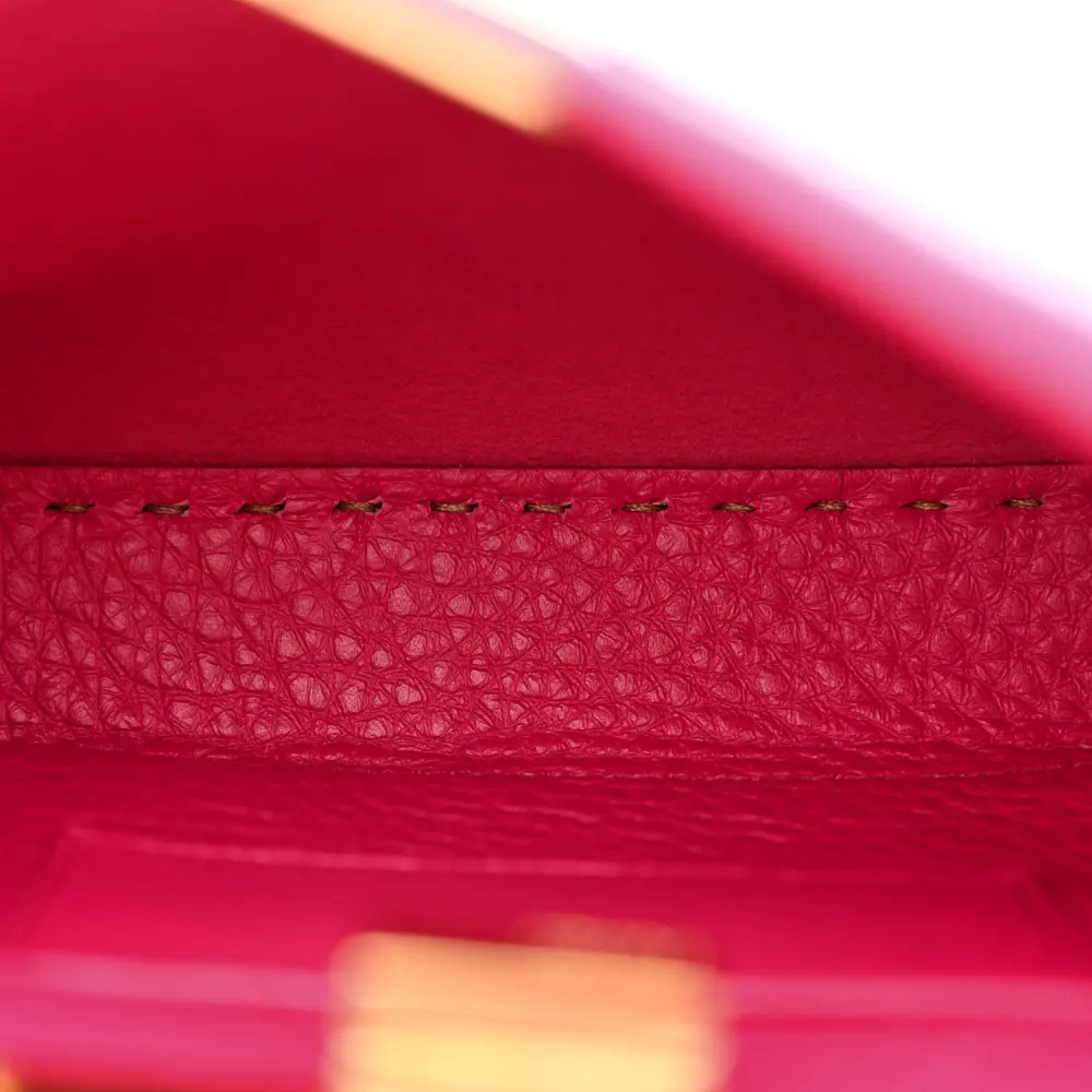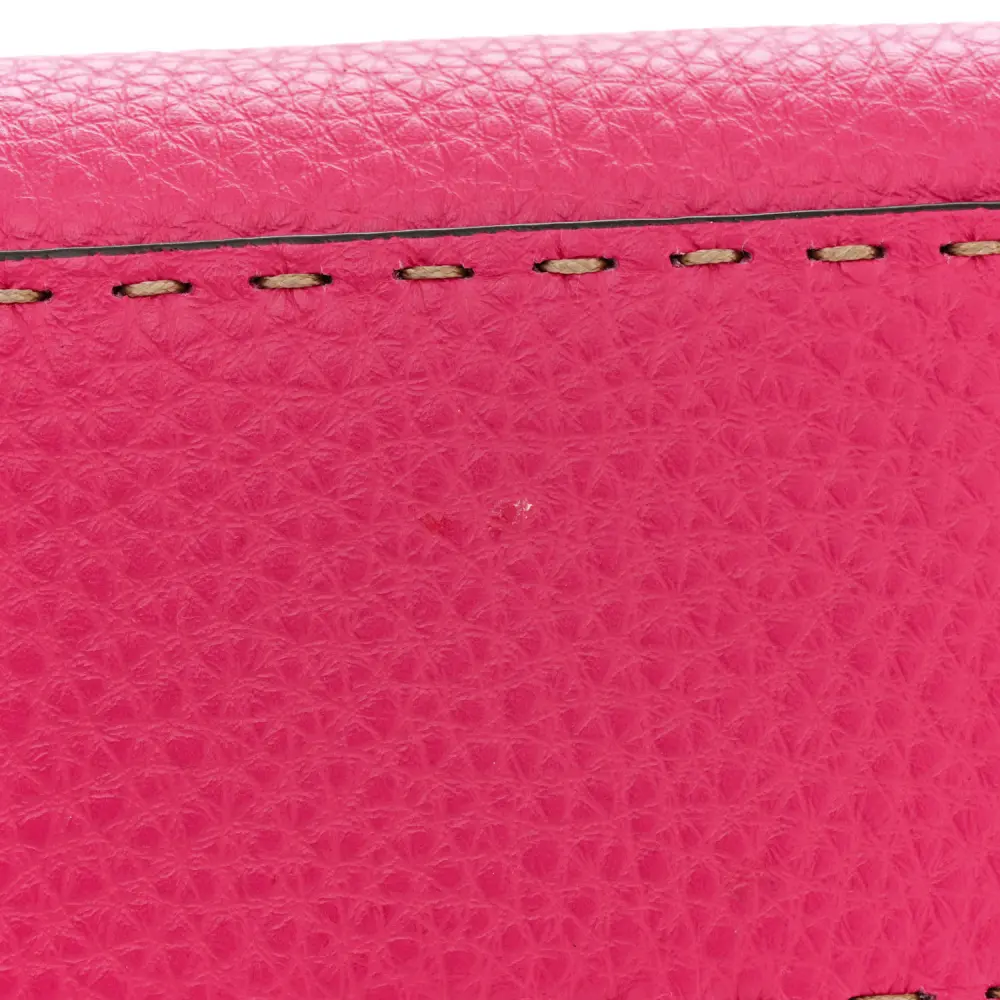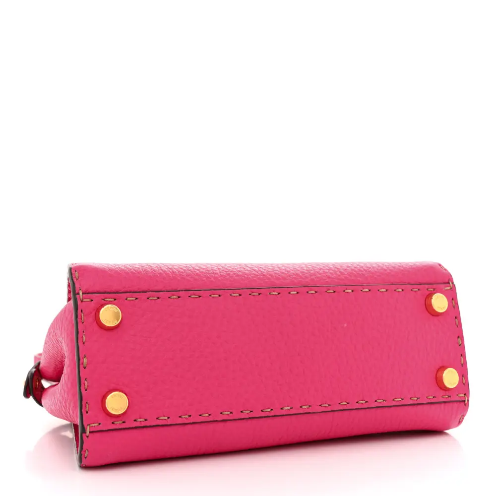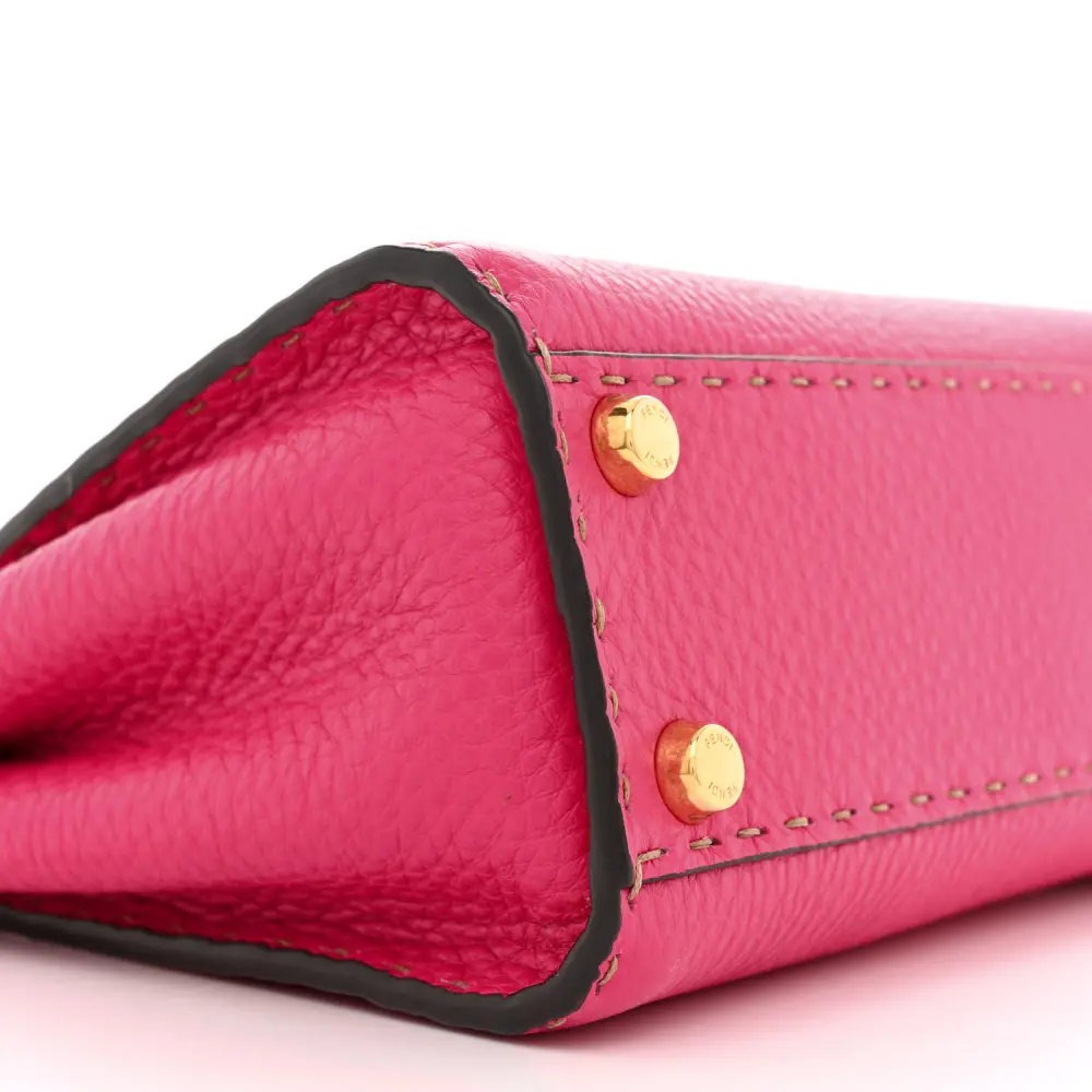 This Fendi Mini Peekaboo Iconic Satchel in Fuxia Cuoio Romano Selleria Leather is bold. Gold hardware adds a touch of luxury to its vibrant design. Spacious yet compact for daily use. Perfect for brightening up any wardrobe. A stylish blend of function and flair. A chic choice for fashion-forward individuals.