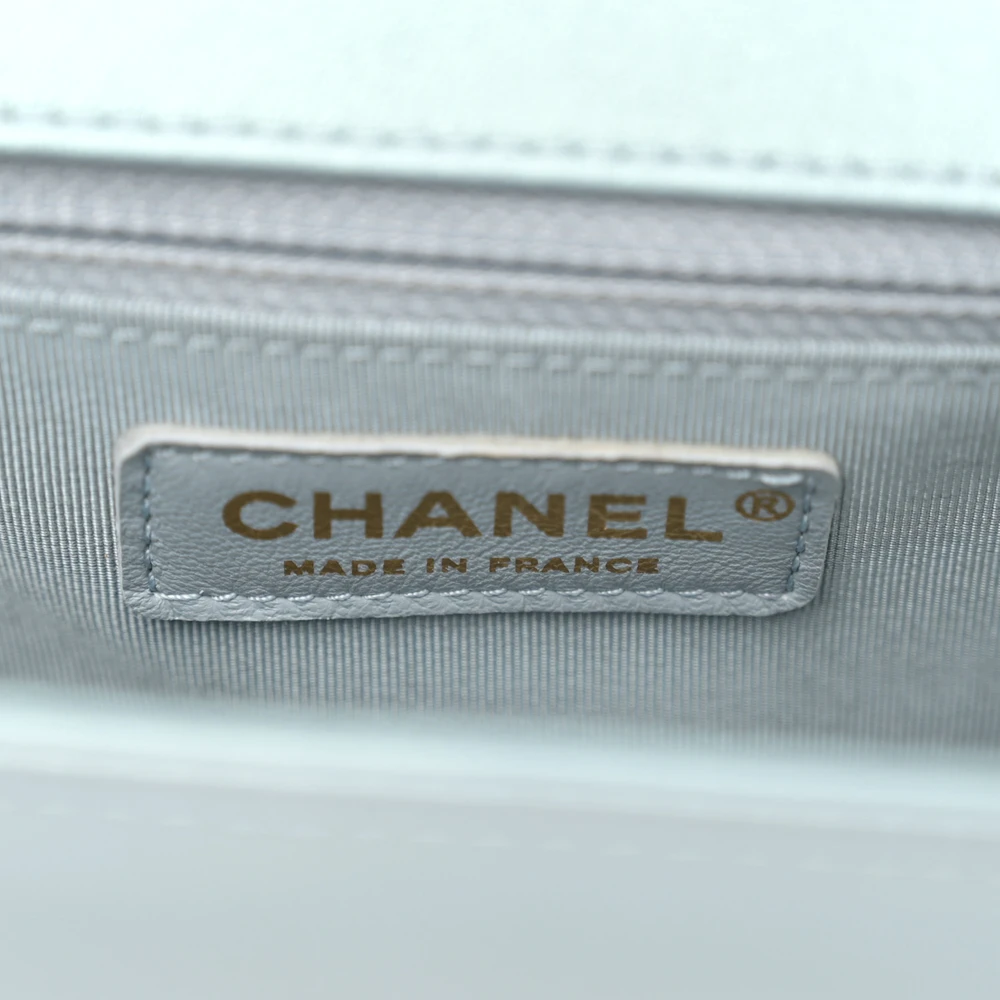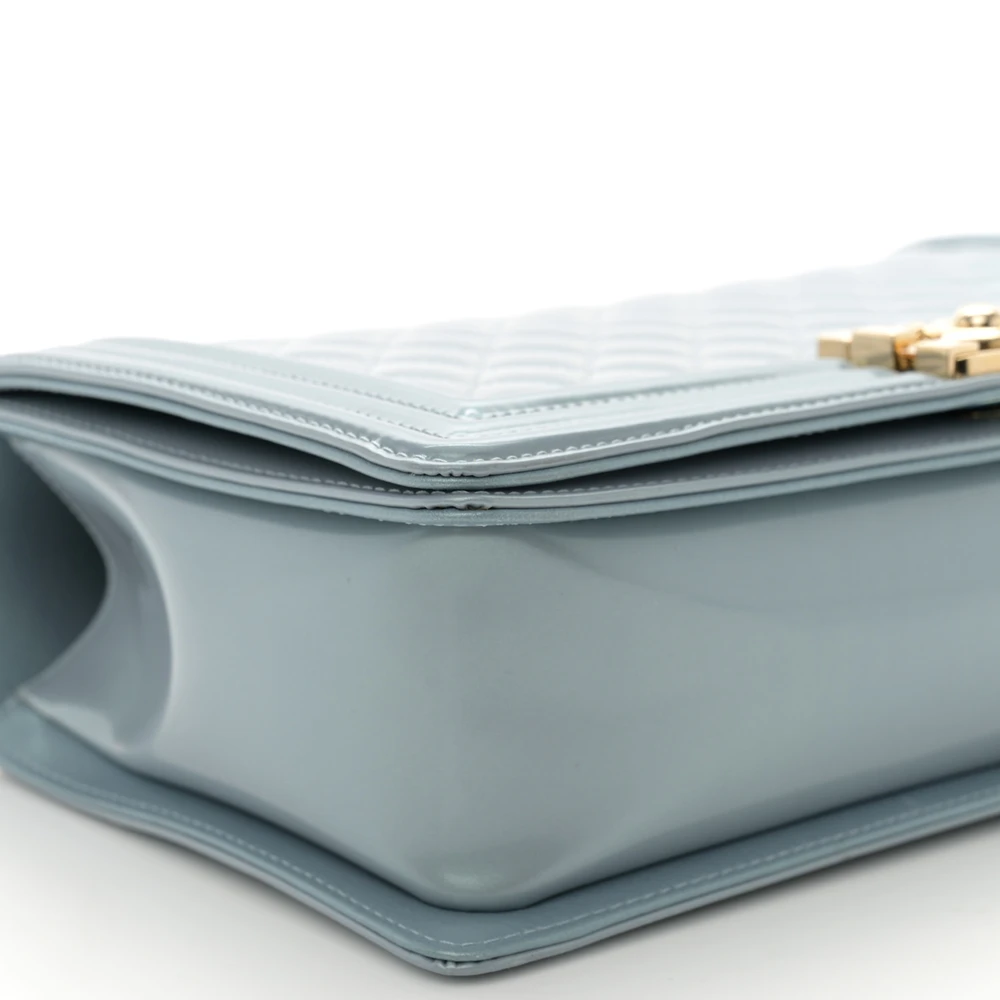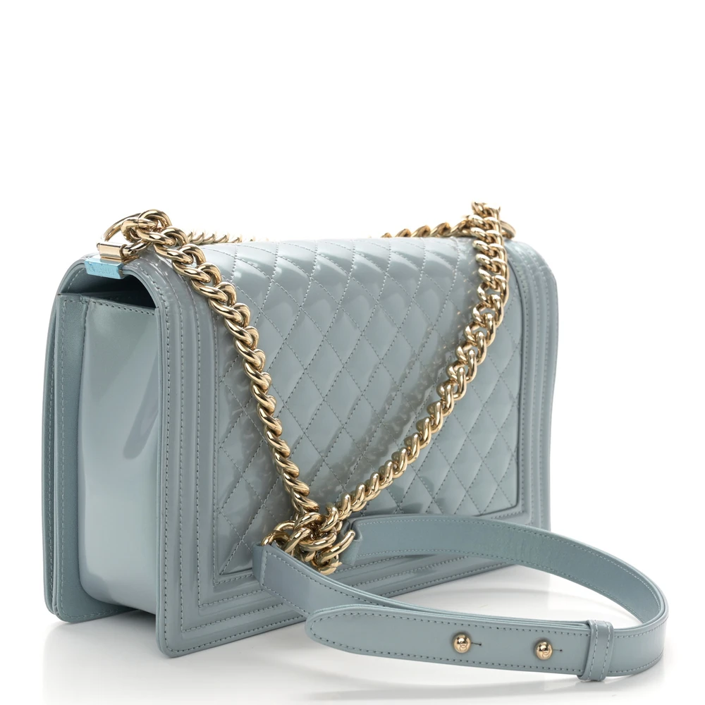 This Chanel Boy Flap New Medium in Light Blue Quilted Glazed Calfskin Leather with Gold Hardware exudes youthful elegance. The light blue hue and glazed calfskin leather create a vibrant yet polished look. Gold hardware highlights its sophisticated design, making it suitable for both casual and formal settings. Spacious and practical, it offers ample room for essentials while maintaining a sleek profile. The iconic Boy clasp and chain strap enhance its timeless appeal. A standout addition to any Chanel collection.