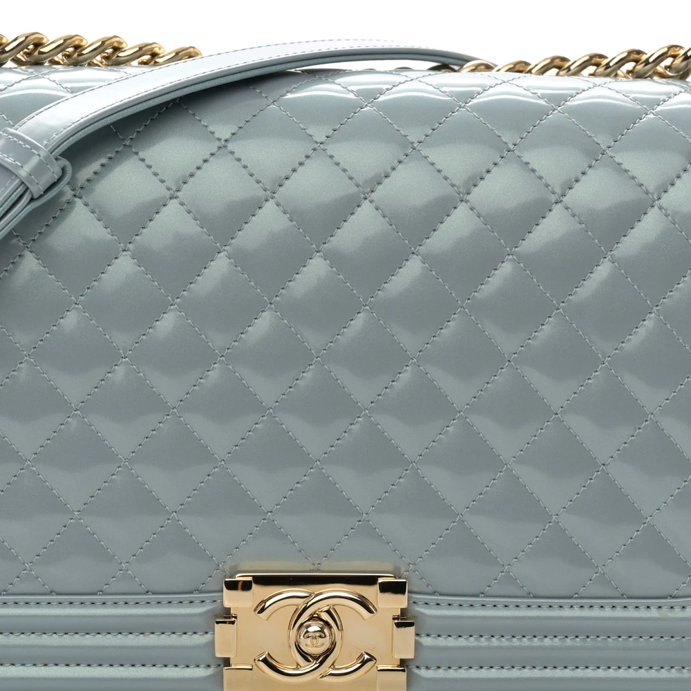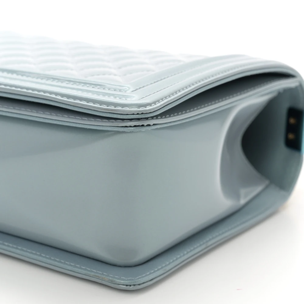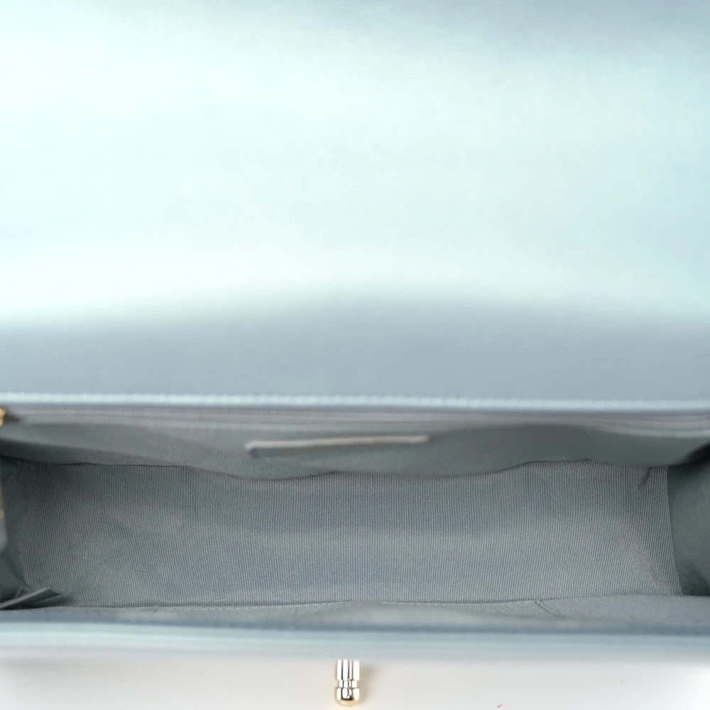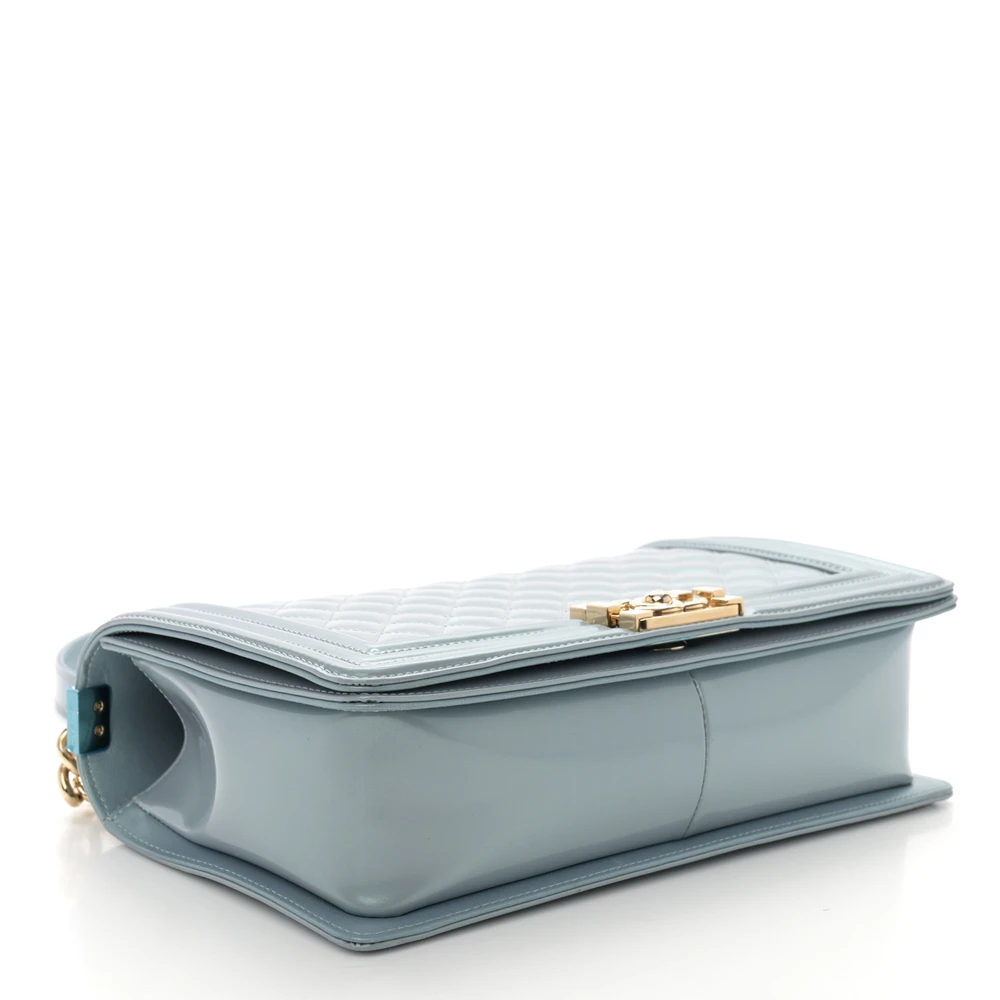 This Chanel Boy Flap New Medium in Light Blue Quilted Glazed Calfskin Leather with Gold Hardware exudes youthful elegance. The light blue hue and glazed calfskin leather create a vibrant yet polished look. Gold hardware highlights its sophisticated design, making it suitable for both casual and formal settings. Spacious and practical, it offers ample room for essentials while maintaining a sleek profile. The iconic Boy clasp and chain strap enhance its timeless appeal. A standout addition to any Chanel collection.