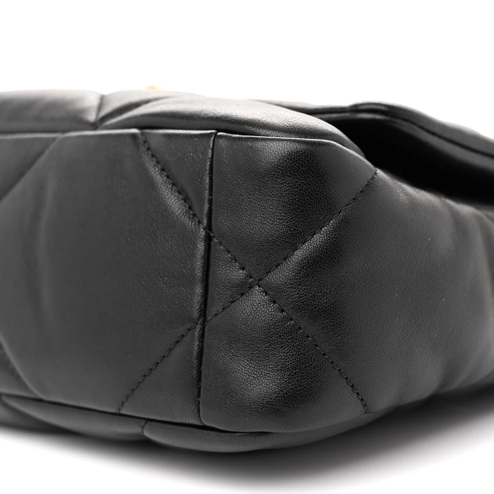 This Chanel Chanel 19 Flap Medium in Black Quilted Lambskin Leather features mixed metal hardware for a modern touch. The soft lambskin leather provides a luxurious texture. Spacious and versatile, it’s perfect for both everyday and evening wear. The iconic quilted pattern and chain detailing enhance its classic appeal. A bold and contemporary piece from the Chanel 19 collection.