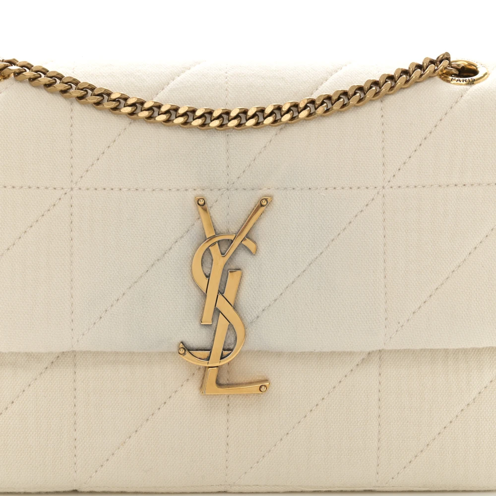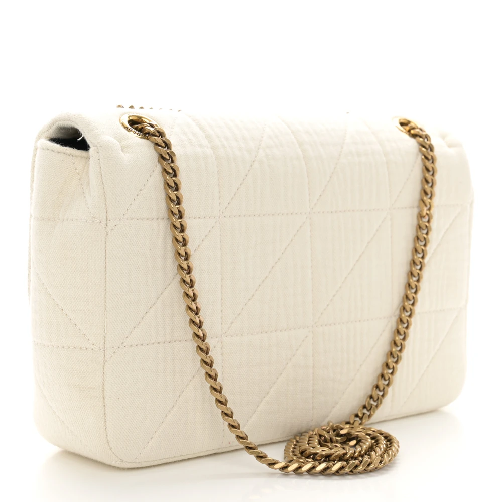 This Medium Jamie Bag in Vanilla Ice features Crinkle Monogram Cotton Patchwork with aged gold hardware. Its artistic texture adds a unique flair to the classic design. The spacious interior and chain strap make it a practical and stylish choice. Perfect for casual outings or as a statement accessory.