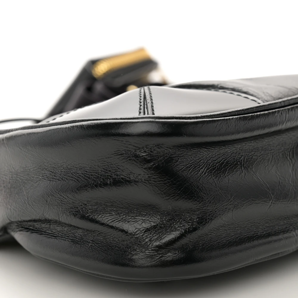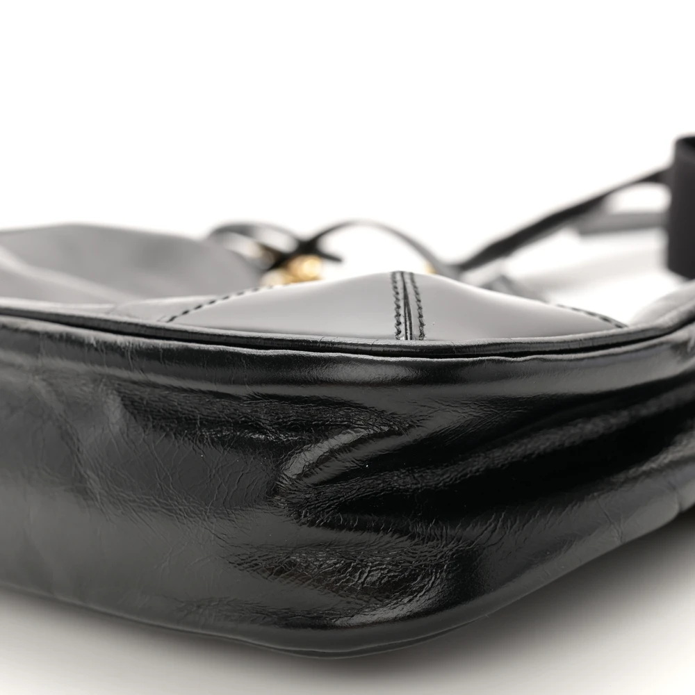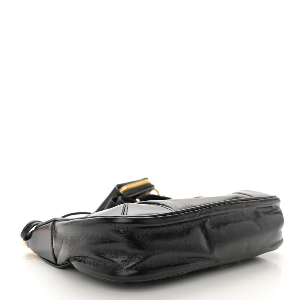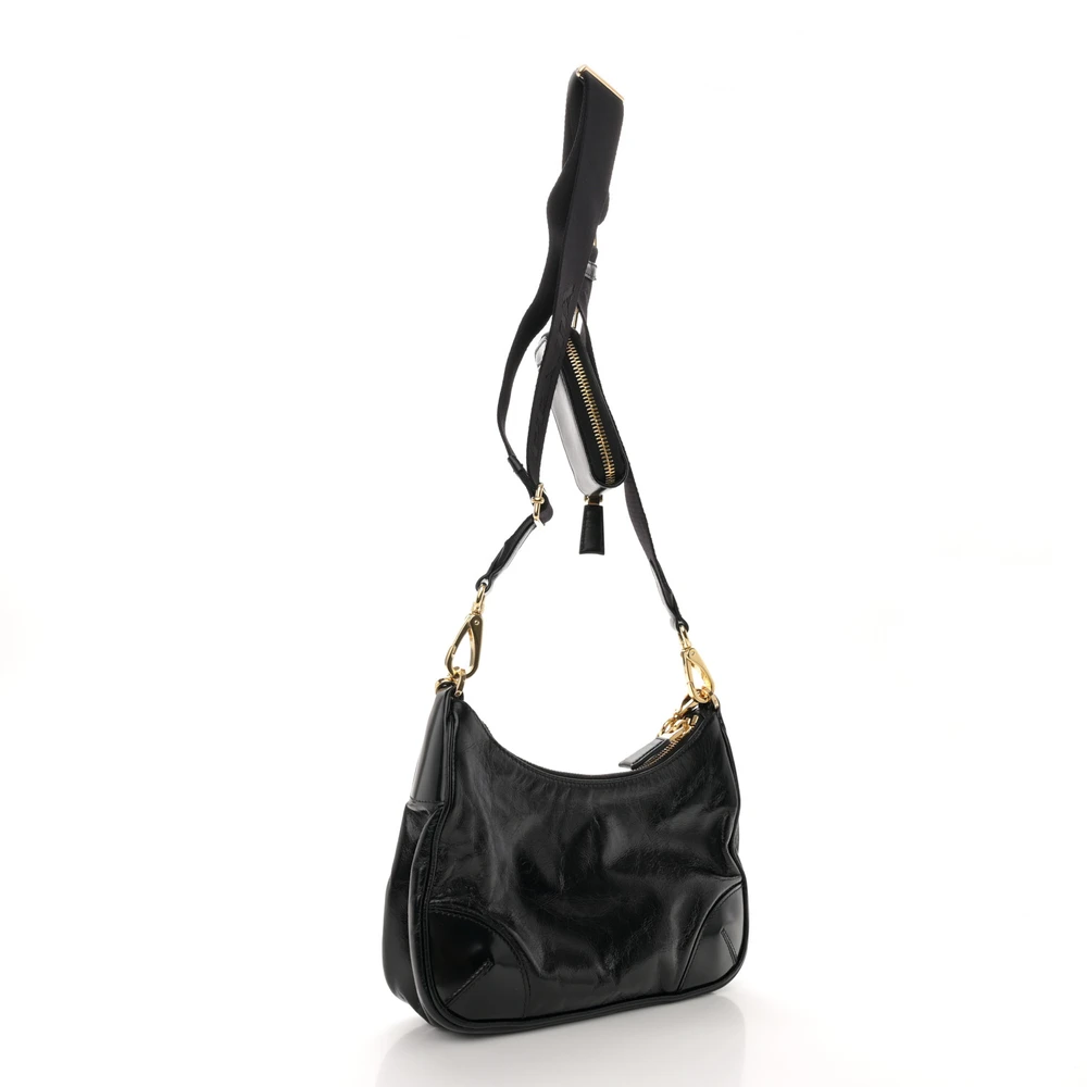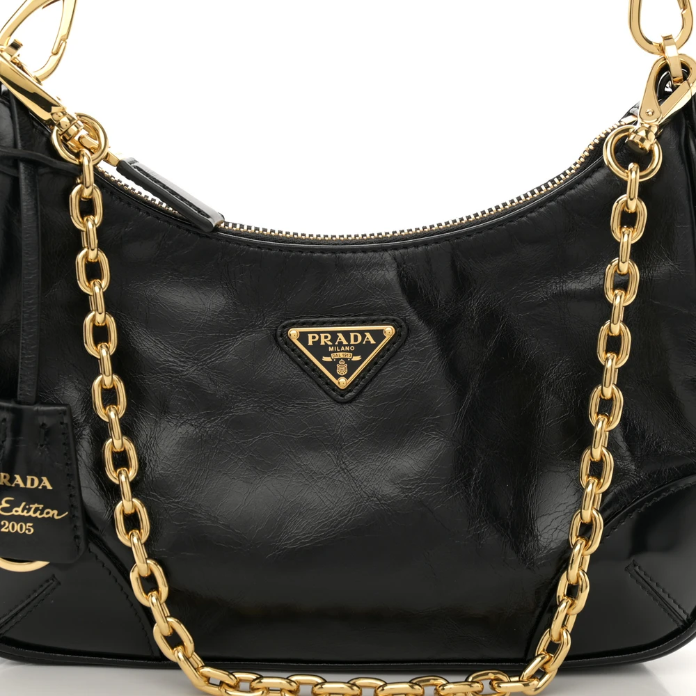 This Prada Medium Re-Edition 2005 Shoulder Bag in Black is crafted from patent Naplak leather. Gold hardware adds a luxurious accent. Spacious design fits daily essentials with ease. Sleek silhouette perfect for casual or formal occasions. Adjustable strap offers versatile carrying options. A timeless and elegant bag for all settings.