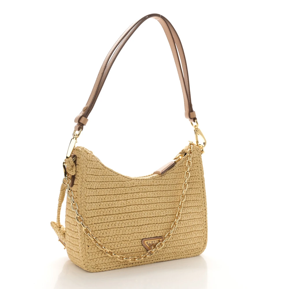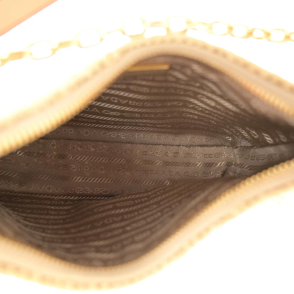 This Prada Mini Effect Crochet Re-Edition 2000 Shoulder Bag in Naturale features yarn raffia construction. Gold hardware adds a luxurious touch. Compact and lightweight, it’s perfect for essentials. Adjustable strap allows versatile carrying options. Ideal for summer outings or casual events. A chic and eco-friendly accessory.