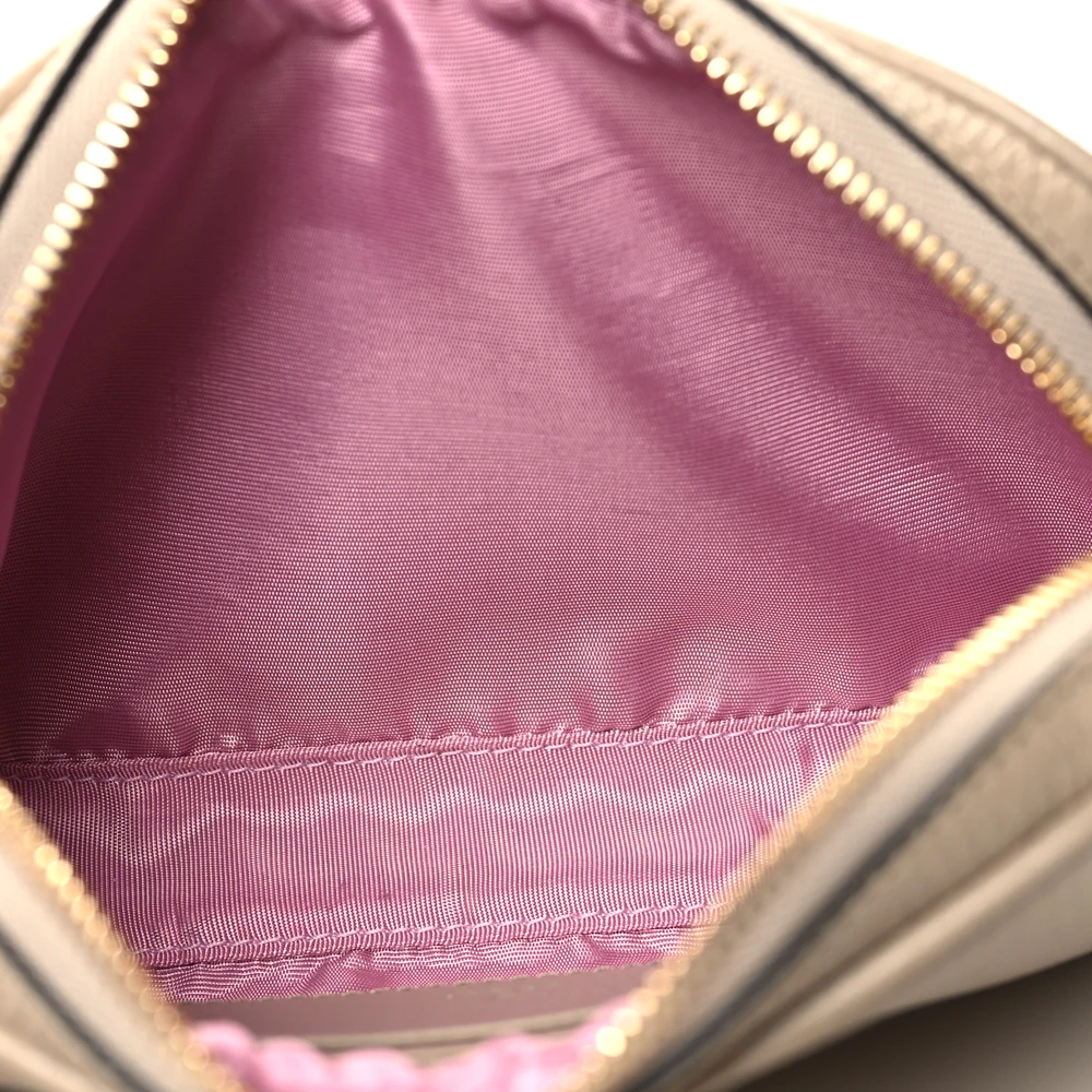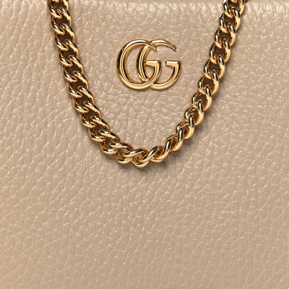 This Gucci Mini GG Marmont Chain Shoulder Bag features beige dollar calfskin super leather. Gold hardware complements its elegant design. Compact size with chain strap for versatile wear. Iconic GG logo highlights its classic style. Ideal for casual outings or evening events. A chic and functional accessory.