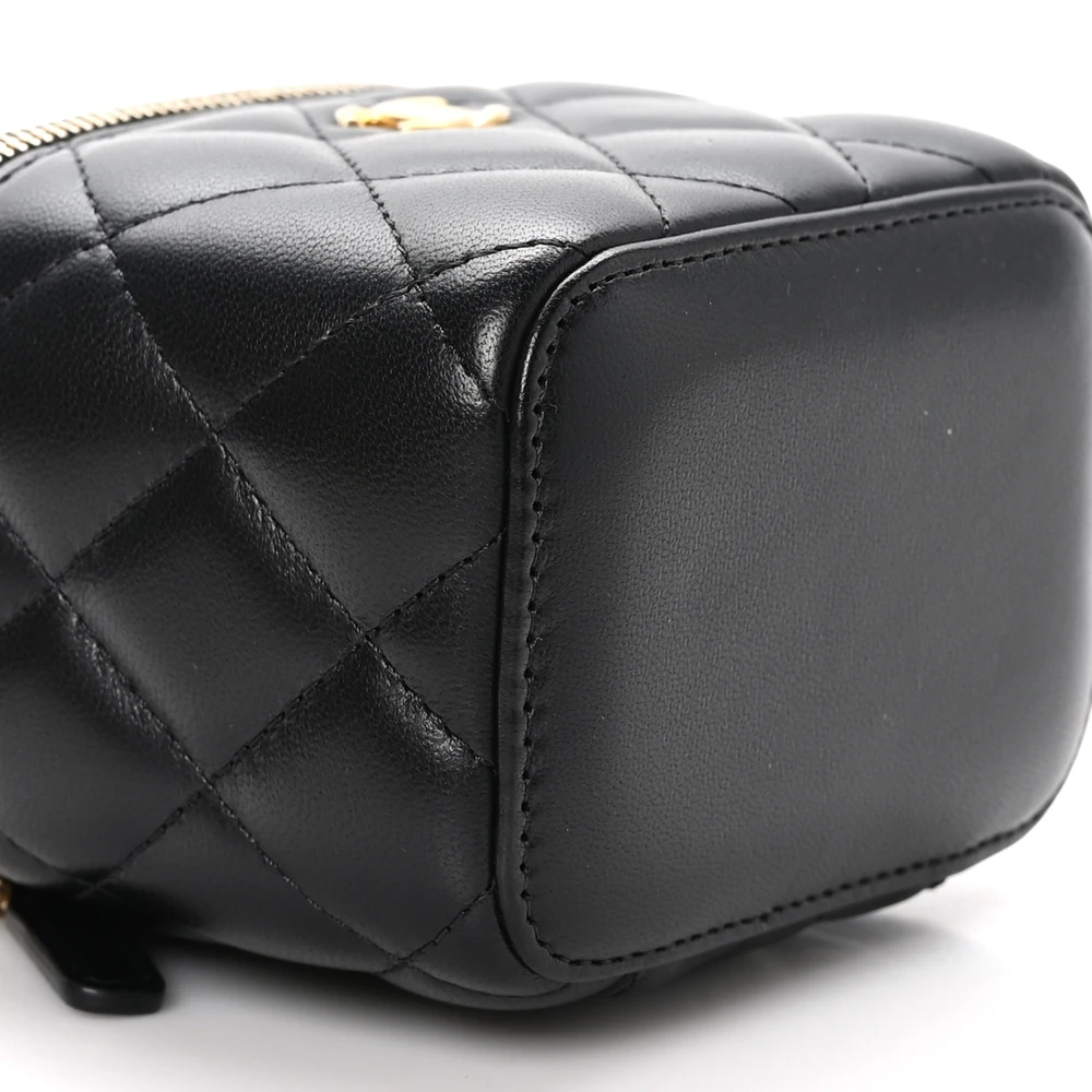 This Chanel Pearl Crush Vanity Case With Chain Mini in Black Quilted Lambskin Leather with Gold Hardware is a unique and playful design. The lambskin leather is soft and luxurious, adorned with Chanel’s signature quilting. Gold hardware adds a touch of elegance, while the pearl accent introduces a whimsical charm. Compact and functional, it’s perfect for storing essentials with style. The chain strap offers versatile carrying options. A delightful piece for lovers of modern Chanel aesthetics.