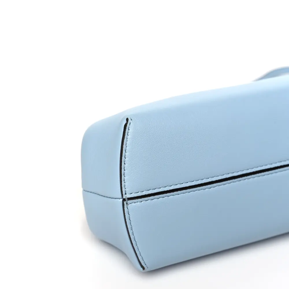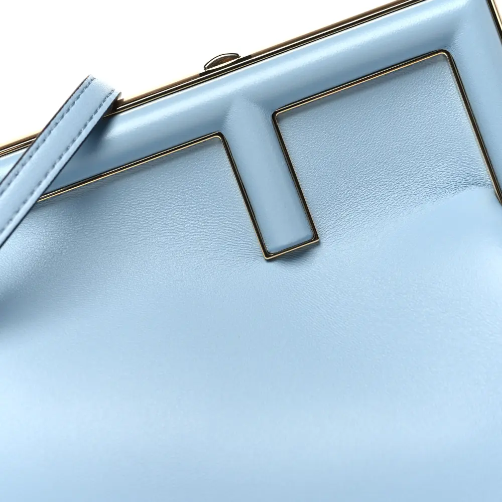 This Fendi Small Fendi First in Azzurro Baby Shiny Nappa Leather is charming. Gold hardware complements its sleek and polished design. Compact yet spacious for essentials. Ideal for adding a pop of color to any outfit. A timeless piece for stylish versatility. Perfect for casual or semi-formal occasions.