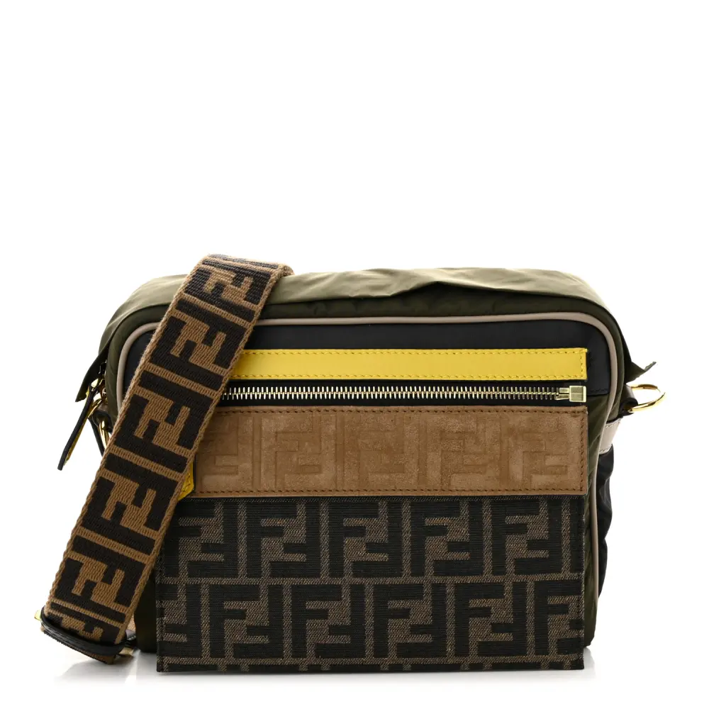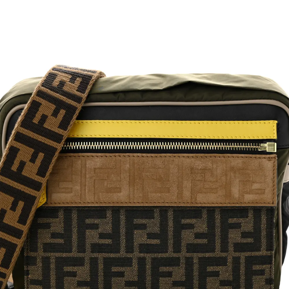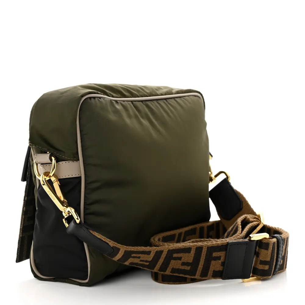 This Fendi Small FF East West Messenger Bag in Military Brown/Tortora Nylon is sleek and functional. Grace Vitello Leather details add luxury to its durable design. Gold hardware enhances its contemporary look. Its adjustable strap allows for comfortable crossbody wear. The organized interior fits daily essentials with ease. A versatile choice for everyday errands.