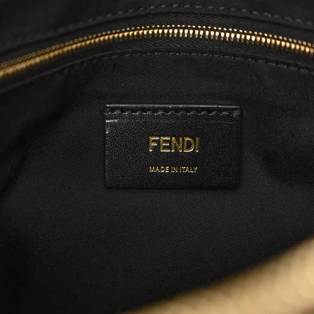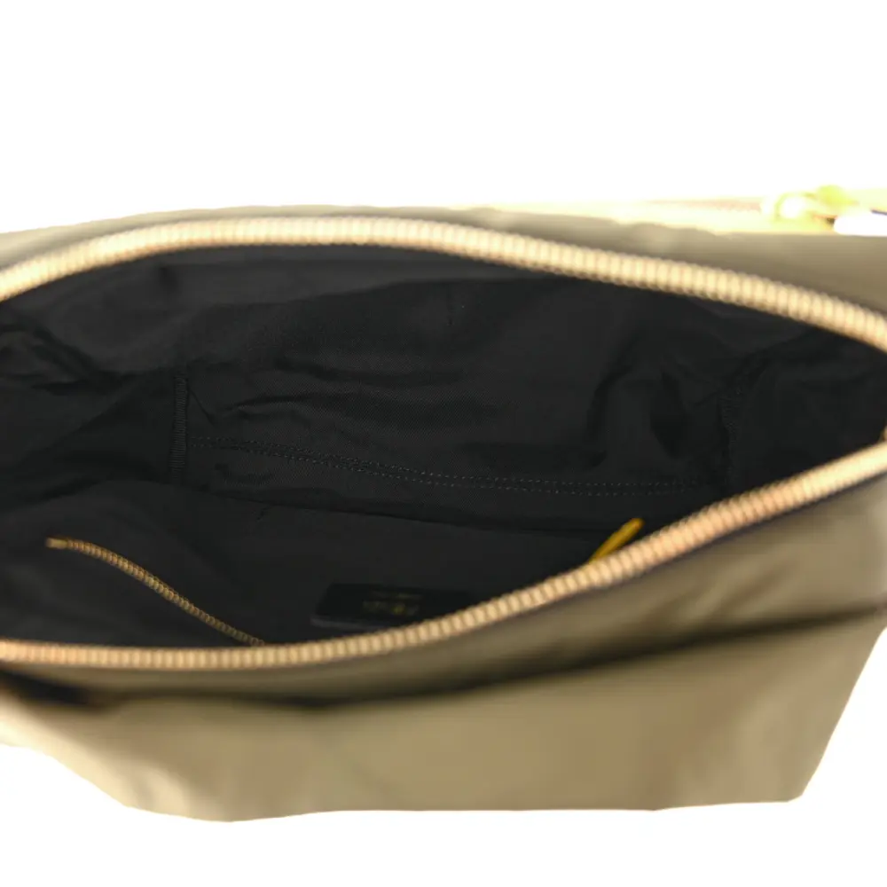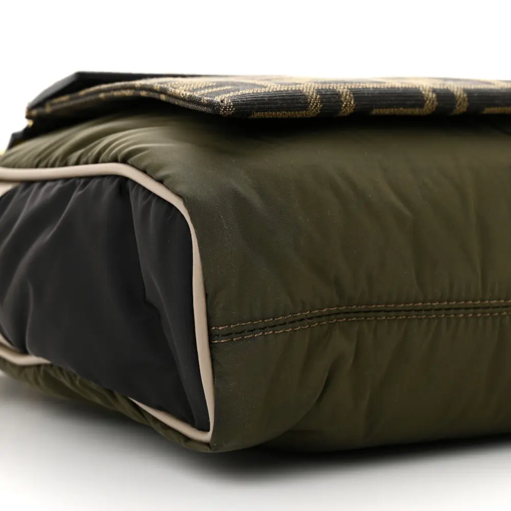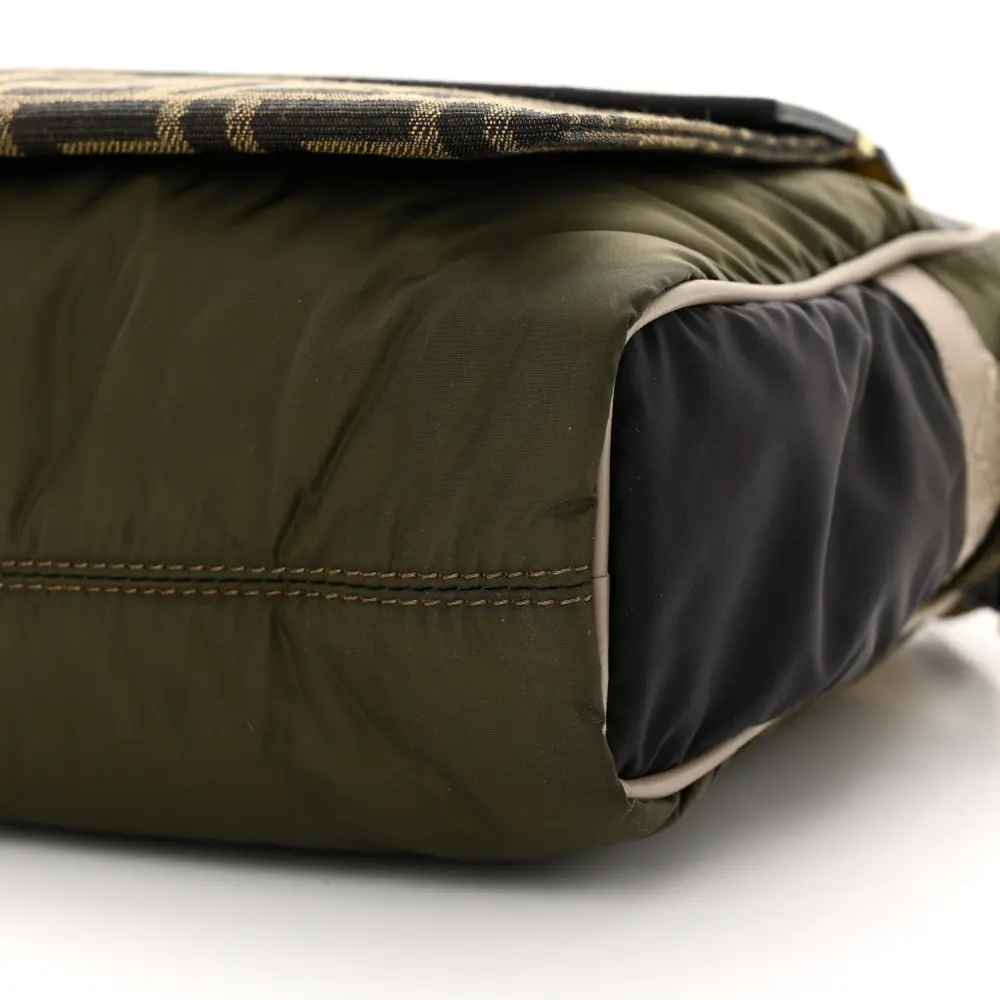 This Fendi Small FF East West Messenger Bag in Military Brown/Tortora Nylon is sleek and functional. Grace Vitello Leather details add luxury to its durable design. Gold hardware enhances its contemporary look. Its adjustable strap allows for comfortable crossbody wear. The organized interior fits daily essentials with ease. A versatile choice for everyday errands.
