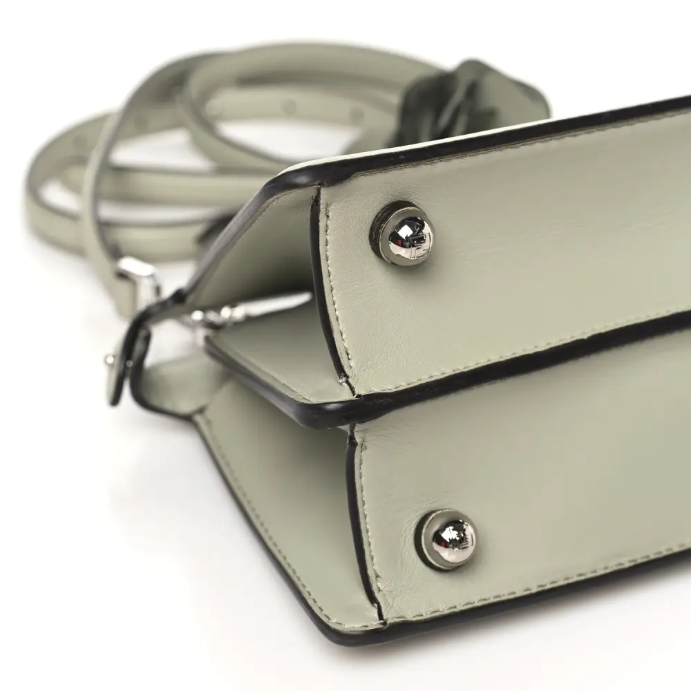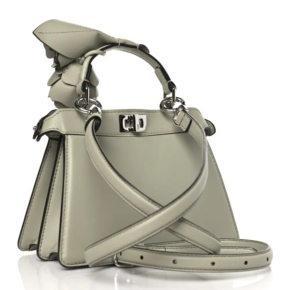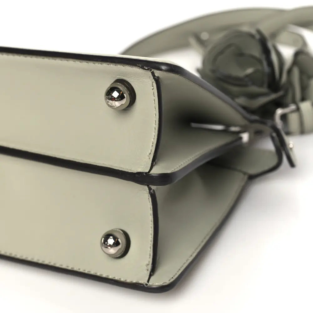 This Fendi Flower Petite Peekaboo I SEE U Satchel in Green Tea Shiny Nappa Leather is whimsical and chic. Silver hardware adds a refined touch to its playful design. The compact size is perfect for essentials on the go. Carry it by the top handle or use the detachable strap. Ideal for adding charm to any outfit. A delightful choice for fashion enthusiasts.