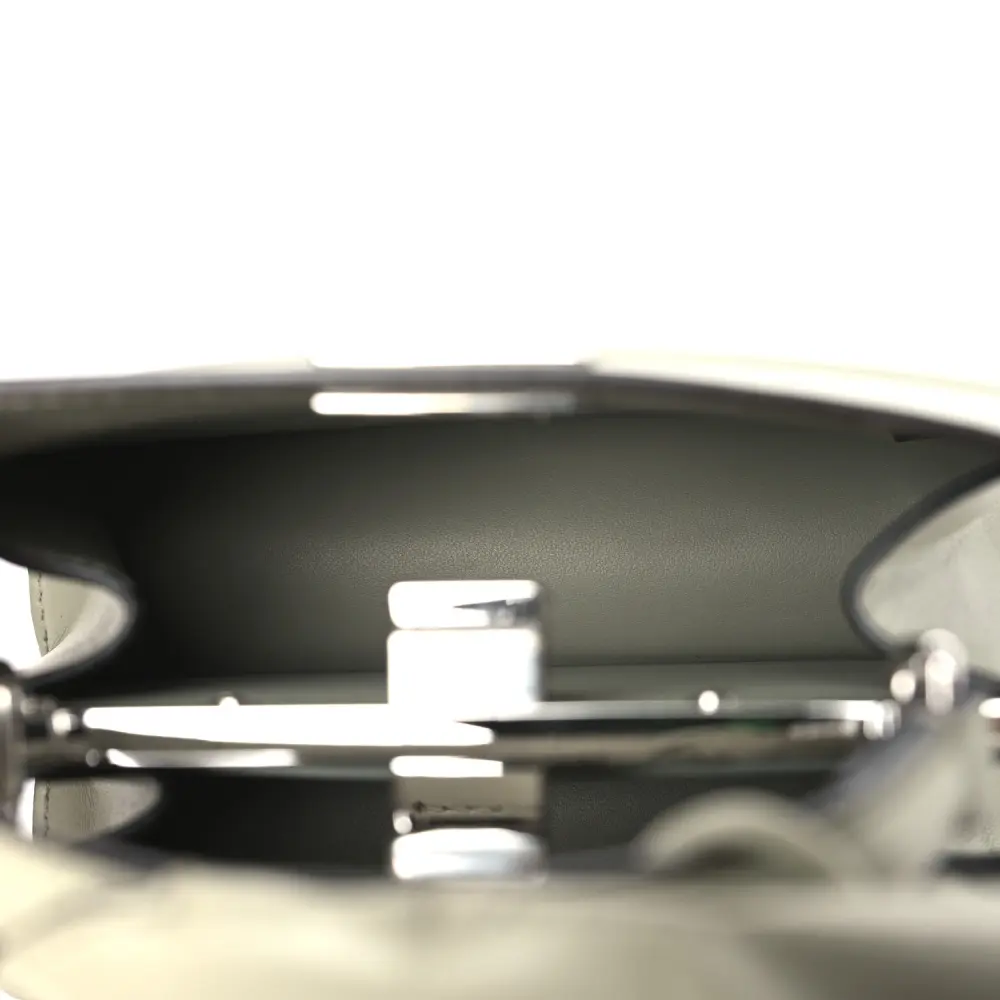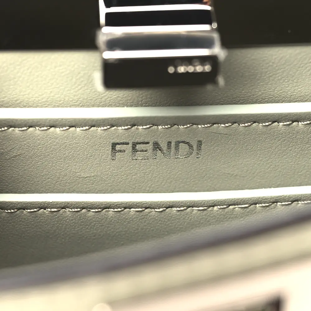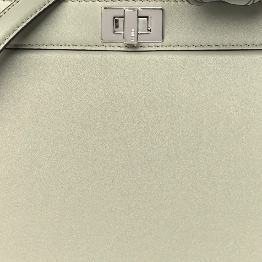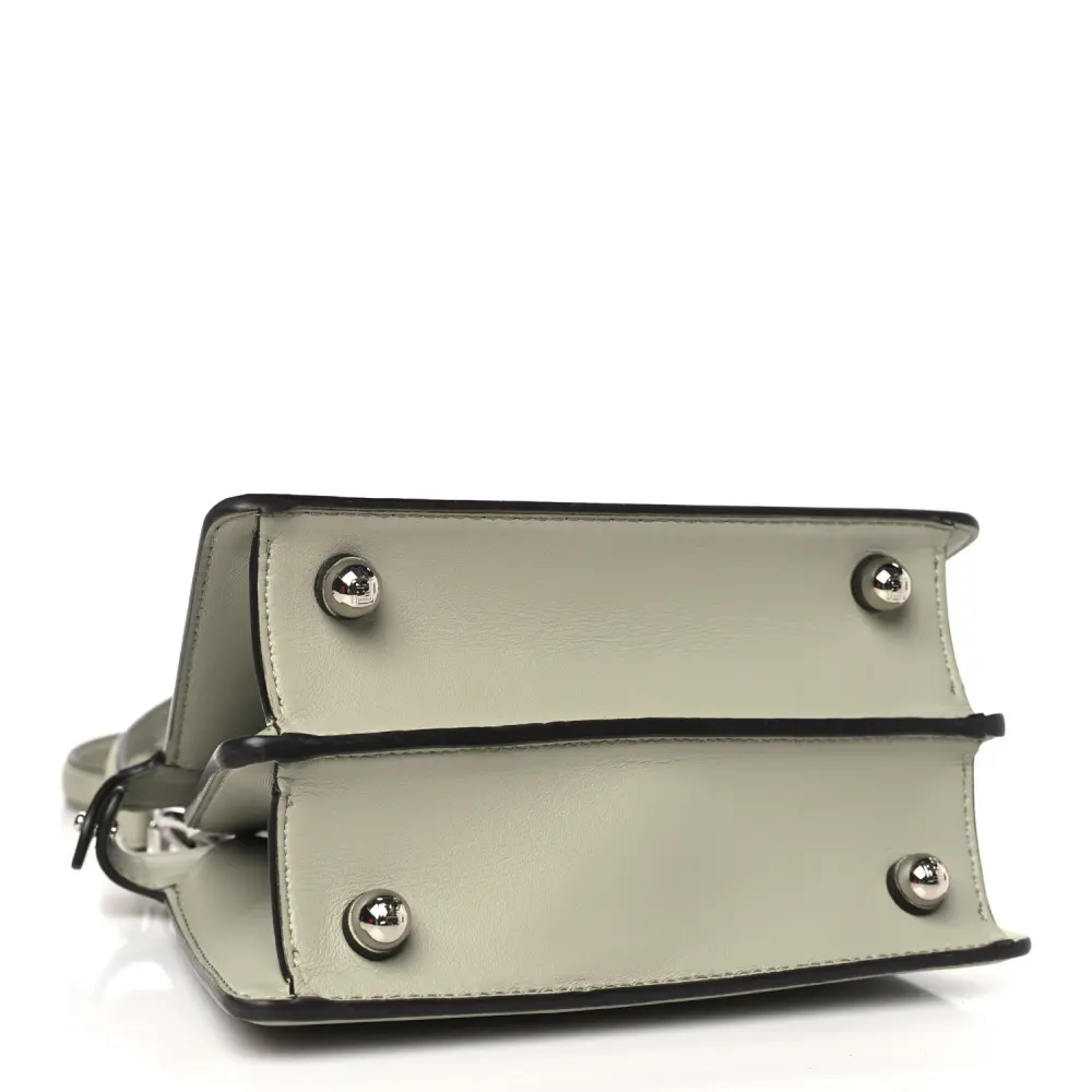 This Fendi Flower Petite Peekaboo I SEE U Satchel in Green Tea Shiny Nappa Leather is whimsical and chic. Silver hardware adds a refined touch to its playful design. The compact size is perfect for essentials on the go. Carry it by the top handle or use the detachable strap. Ideal for adding charm to any outfit. A delightful choice for fashion enthusiasts.