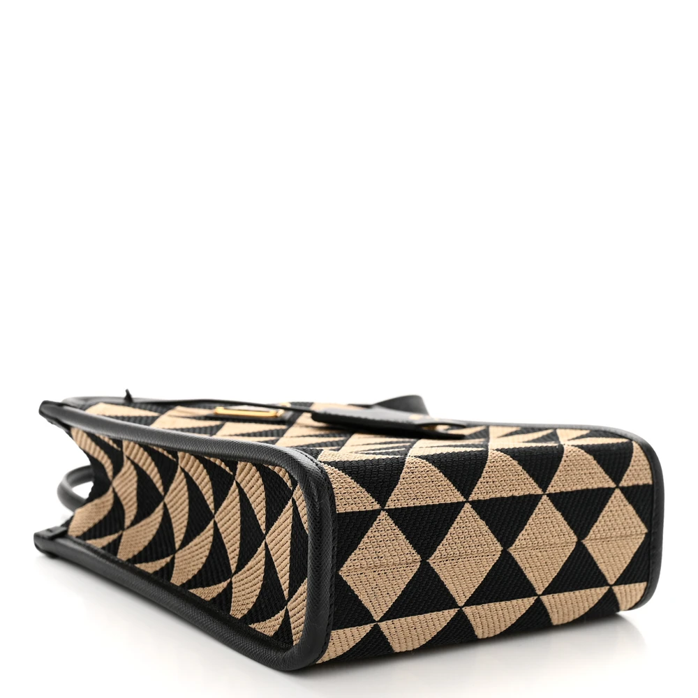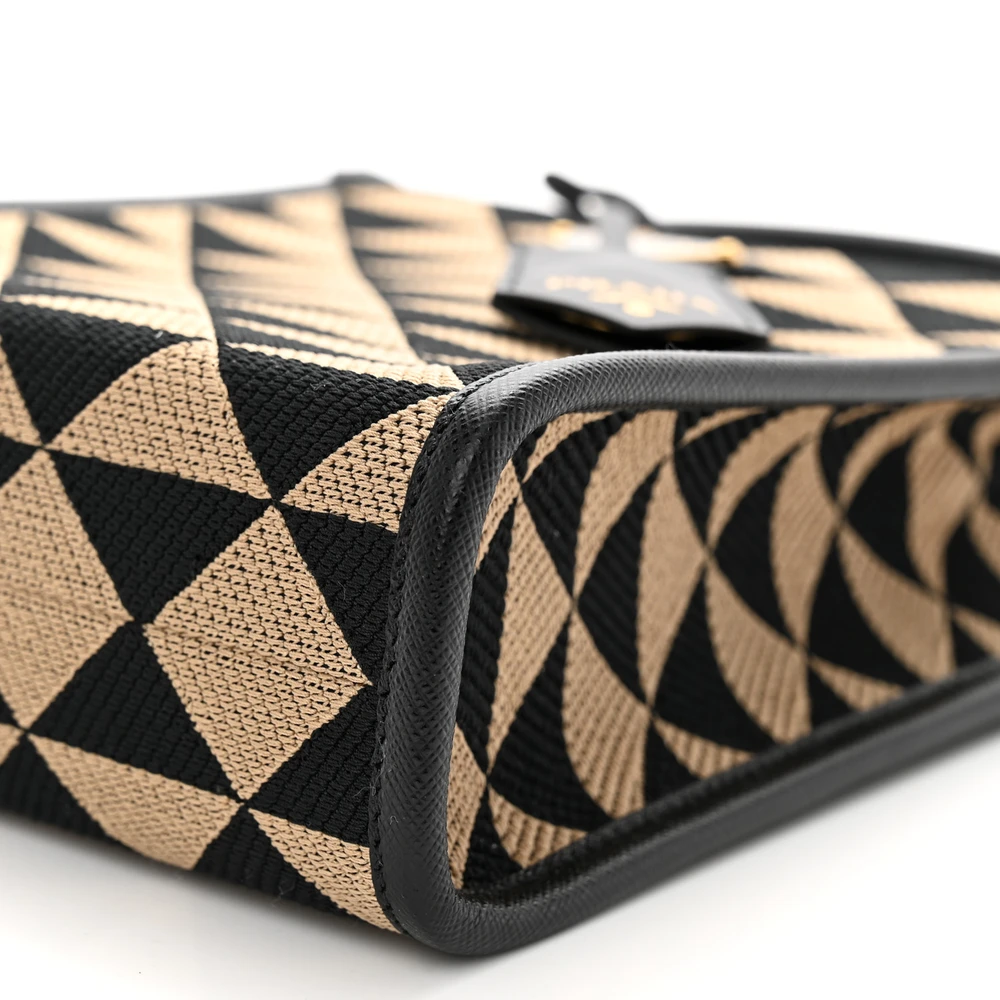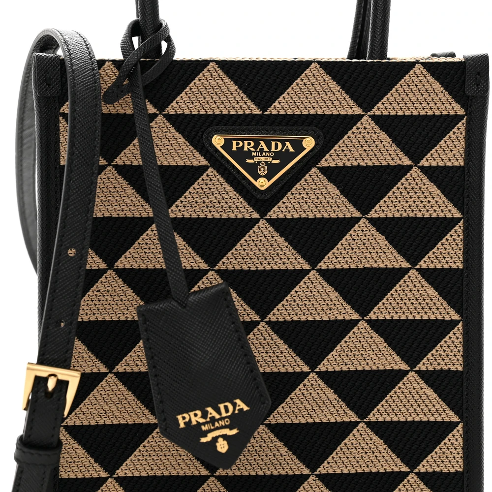 This Prada Micro Triangolo Symbole Embroidered Tote in Black/Corda features jacquard Saffiano leather. Gold hardware adds a sophisticated touch. Compact yet functional for essentials. Dual handles offer versatile carrying options. Perfect for casual or formal settings. A stylish and elegant tote.