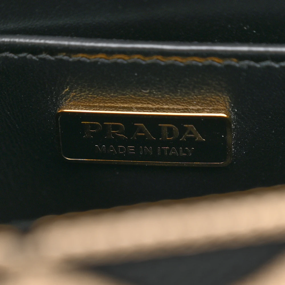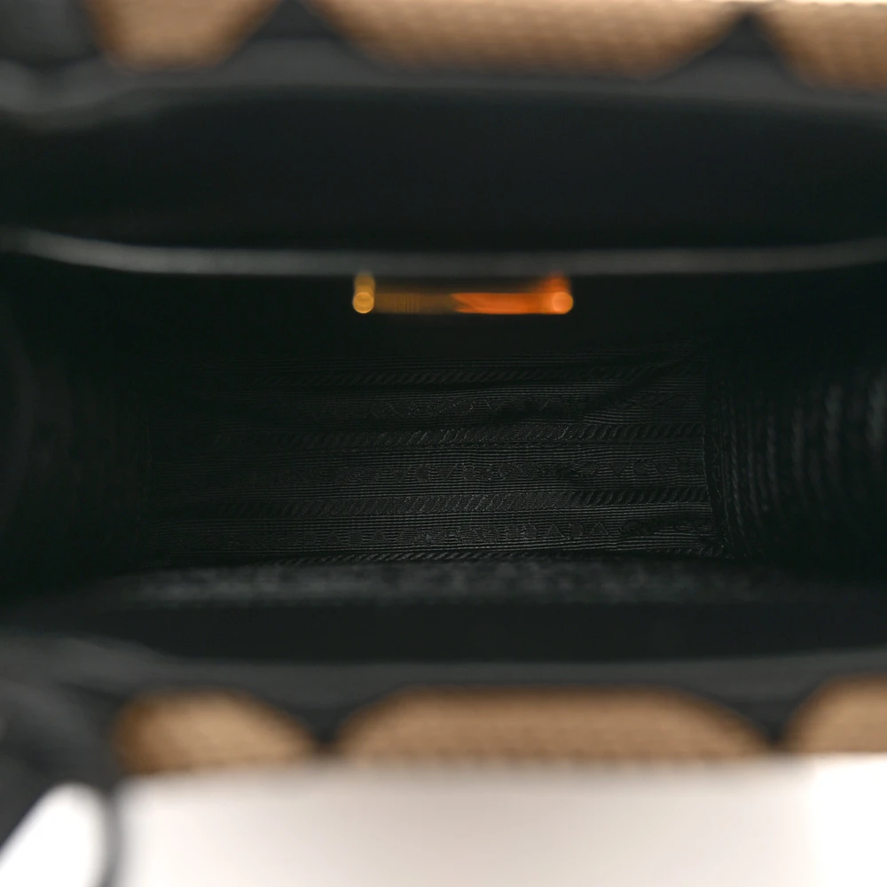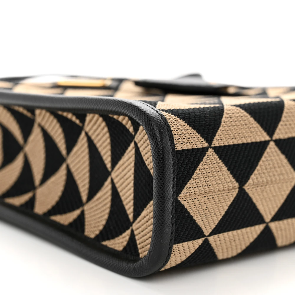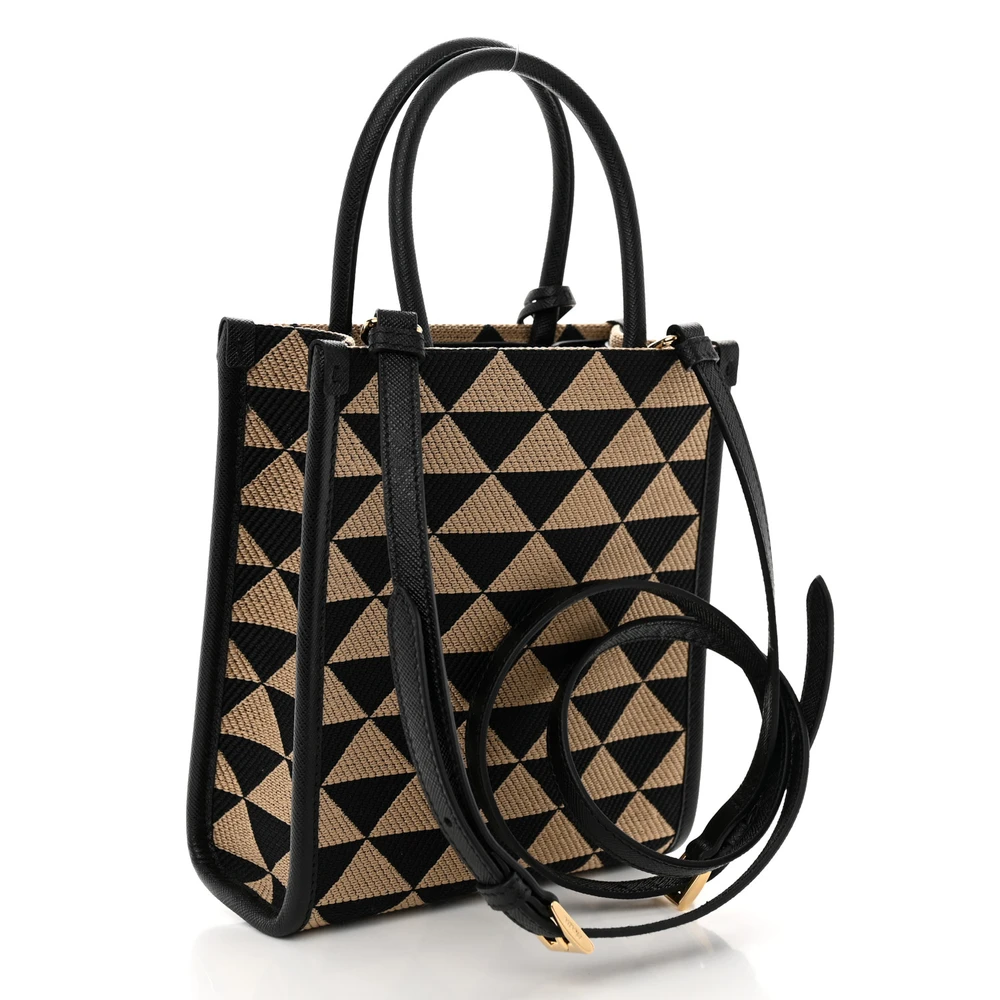 This Prada Micro Triangolo Symbole Embroidered Tote in Black/Corda features jacquard Saffiano leather. Gold hardware adds a sophisticated touch. Compact yet functional for essentials. Dual handles offer versatile carrying options. Perfect for casual or formal settings. A stylish and elegant tote.