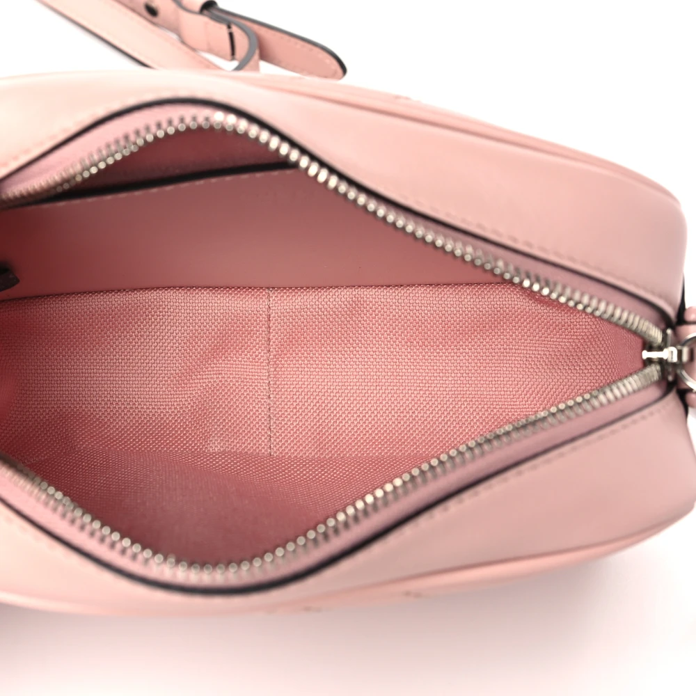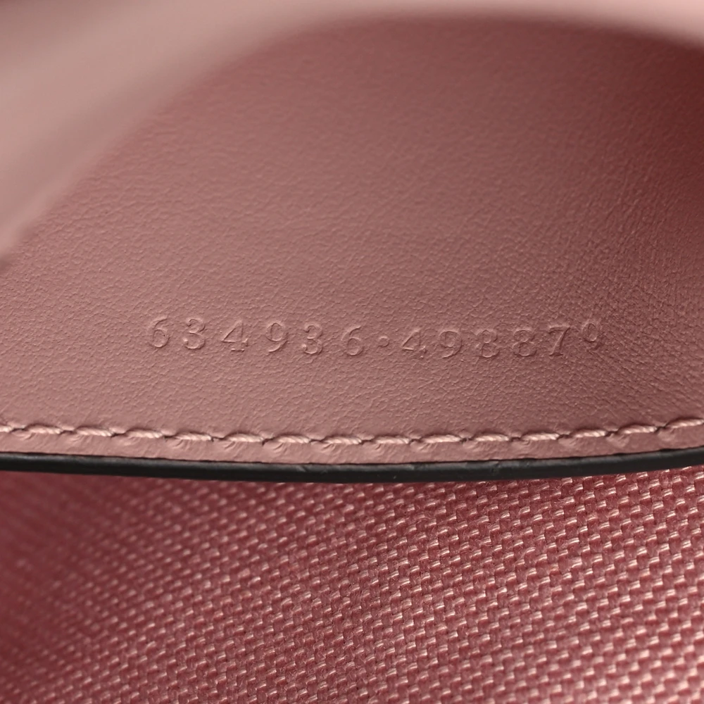 This Gucci Monochrome Mini GG Marmont Chain Shoulder Bag features perfect pink calfskin matelassé leather. Incognito hardware offers a modern twist. Compact size ideal for carrying essentials. Chain strap allows for versatile styling. A chic and functional accessory for any occasion.