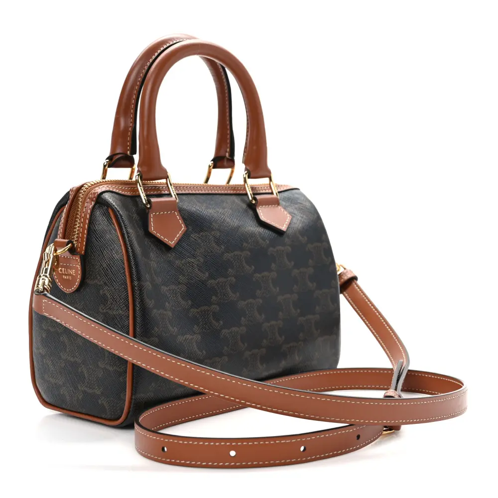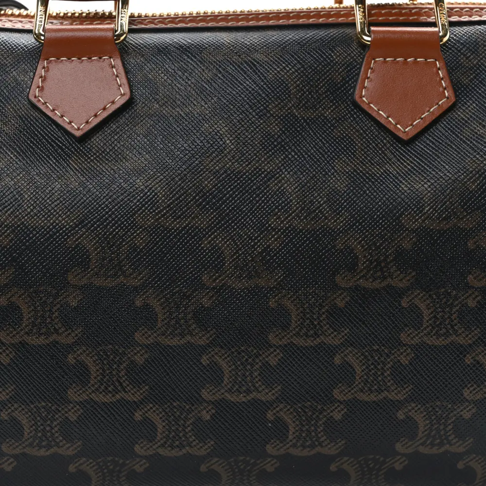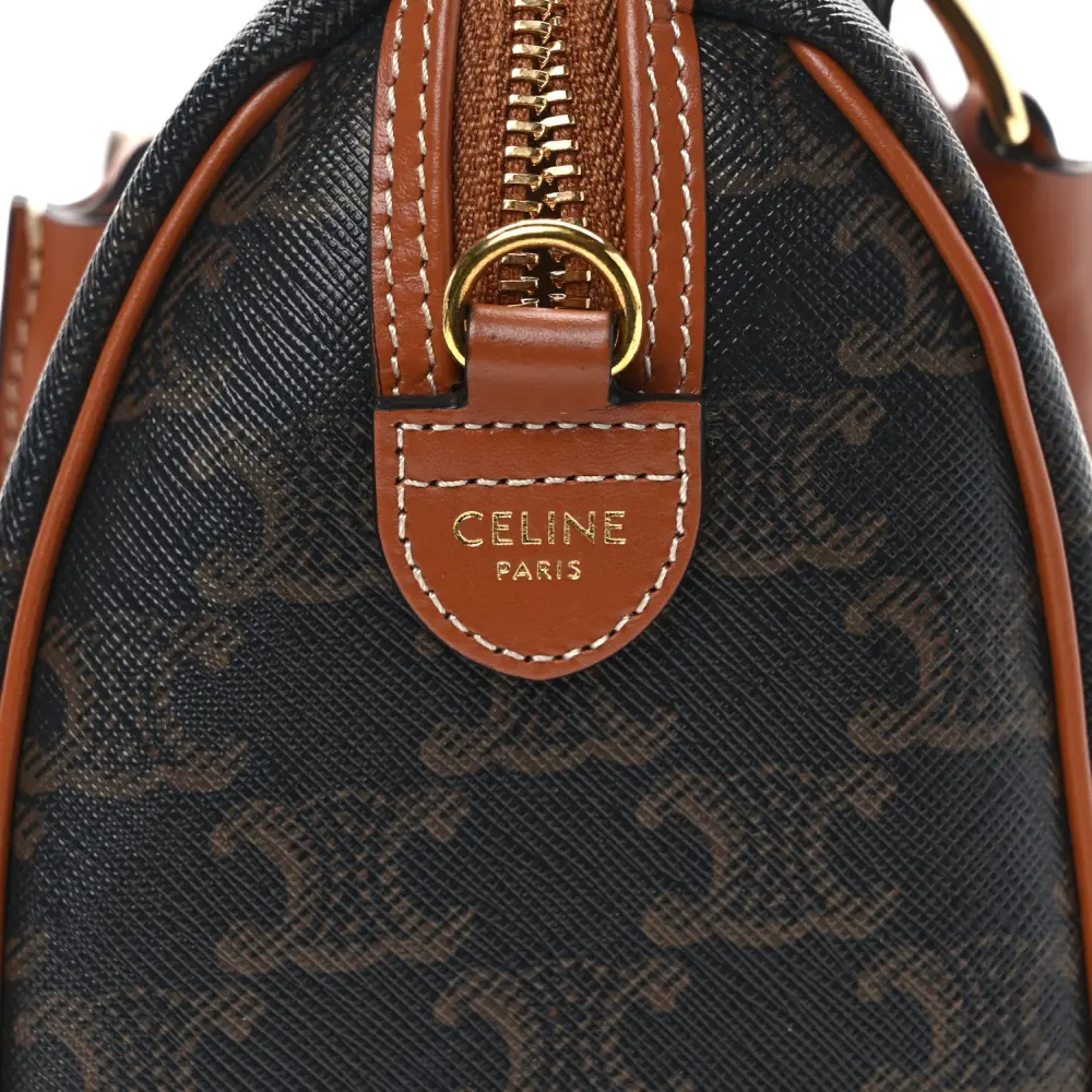 This Celine Small Boston Bag in Tan features Triomphe canvas and calfskin leather with gold hardware. Its compact design is both stylish and functional. The top handles and detachable strap add versatility. Spacious enough for daily essentials, it’s perfect for everyday wear. A timeless and polished accessory.