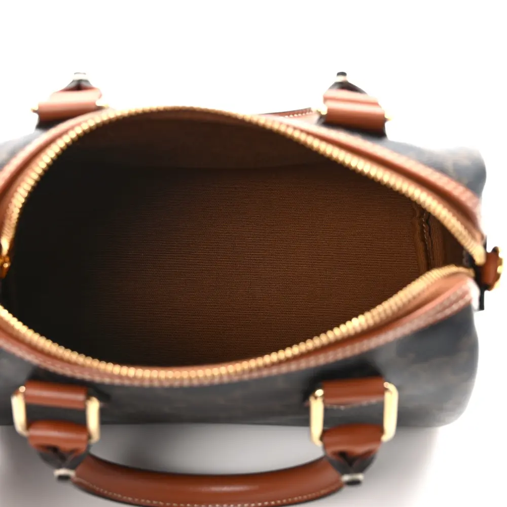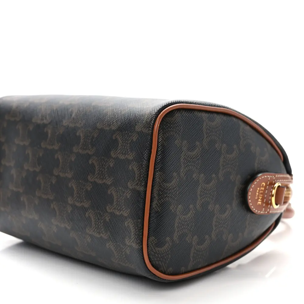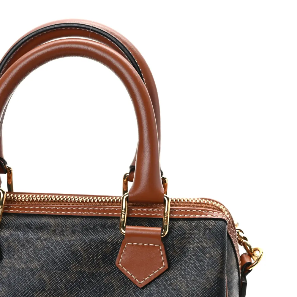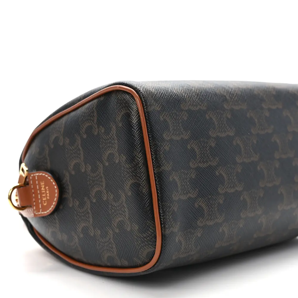 This Celine Small Boston Bag in Tan features Triomphe canvas and calfskin leather with gold hardware. Its compact design is both stylish and functional. The top handles and detachable strap add versatility. Spacious enough for daily essentials, it’s perfect for everyday wear. A timeless and polished accessory.