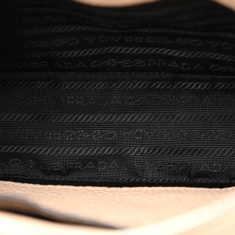This Prada Small Camera Crossbody Bag in Sand showcases Vitello Daino leather. The silver hardware adds modern sophistication. Compact and lightweight, it’s perfect for essentials. Adjustable crossbody strap offers hands-free convenience. Ideal for casual or travel use. A versatile and stylish accessory.