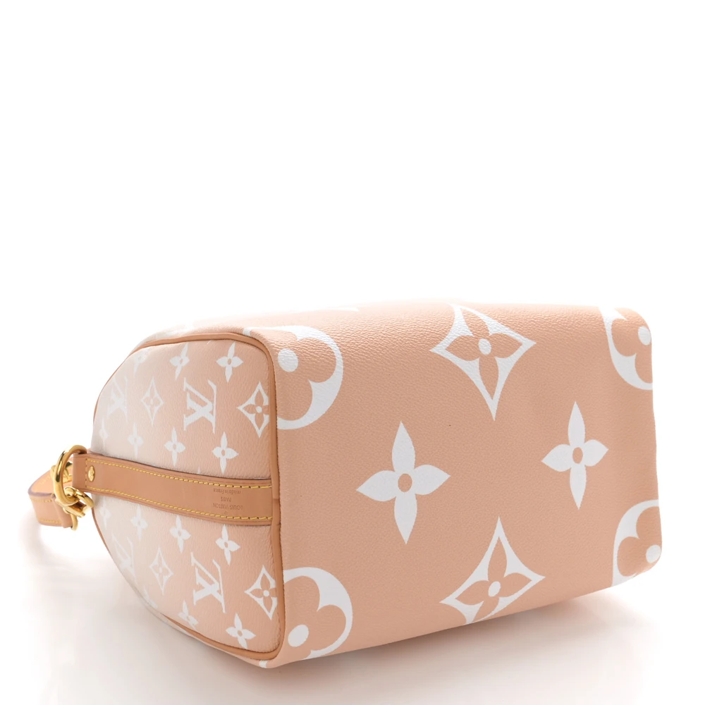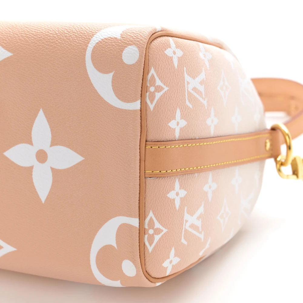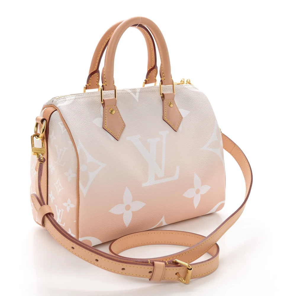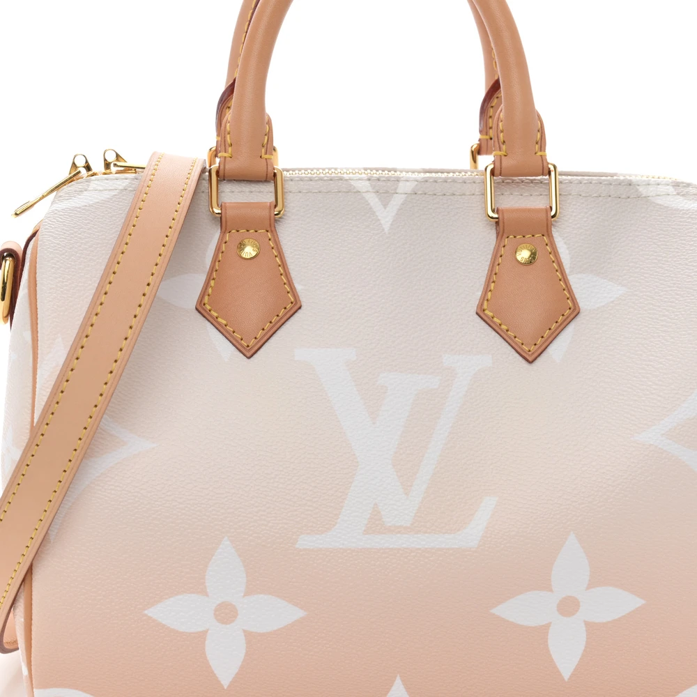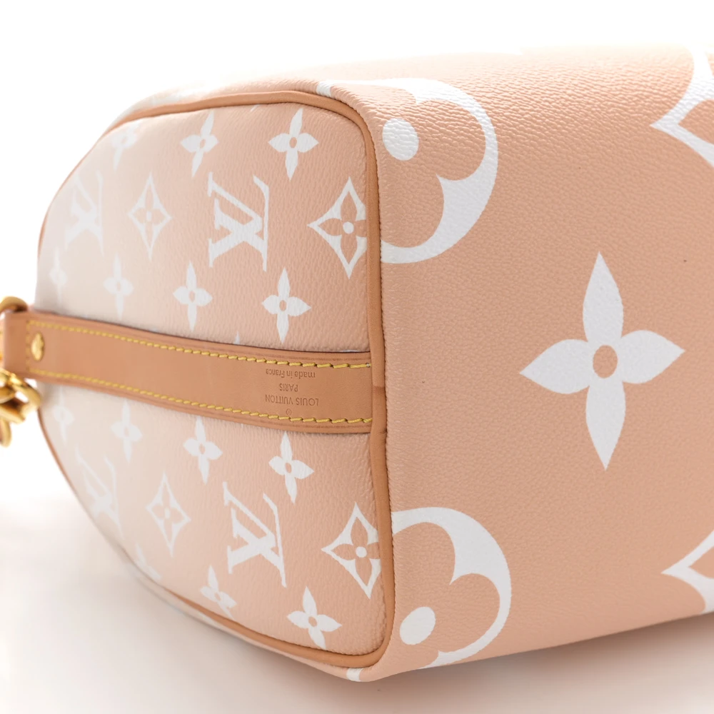 This Louis Vuitton Brume Giant Monogram Canvas By The Pool Speedy Bandouliere 25 is a fresh twist on the iconic Speedy bag. Crafted from giant monogram canvas in a soft brume (gray) hue, it features gold hardware and a spacious interior with plenty of room for your essentials, offering a stylish yet functional design.