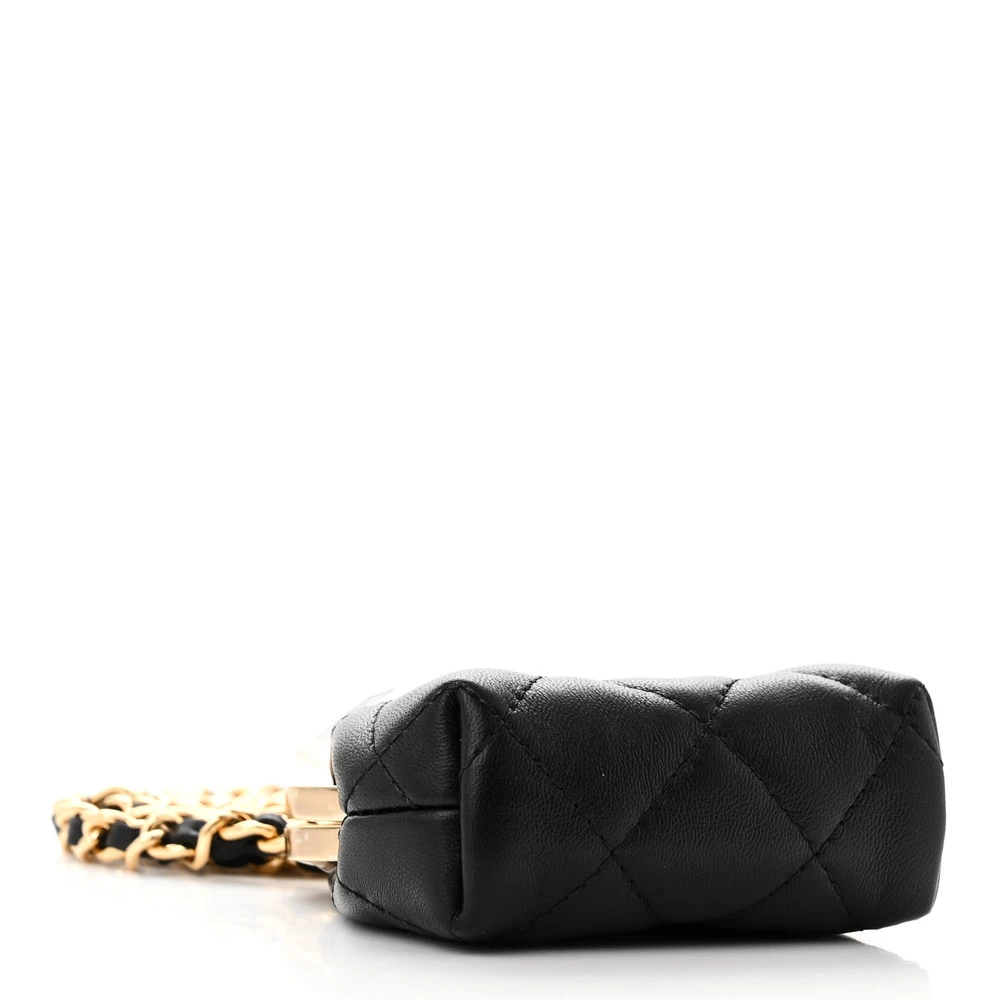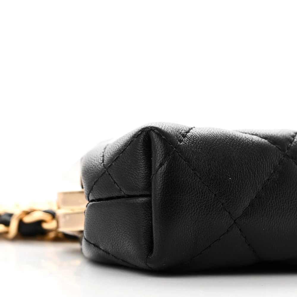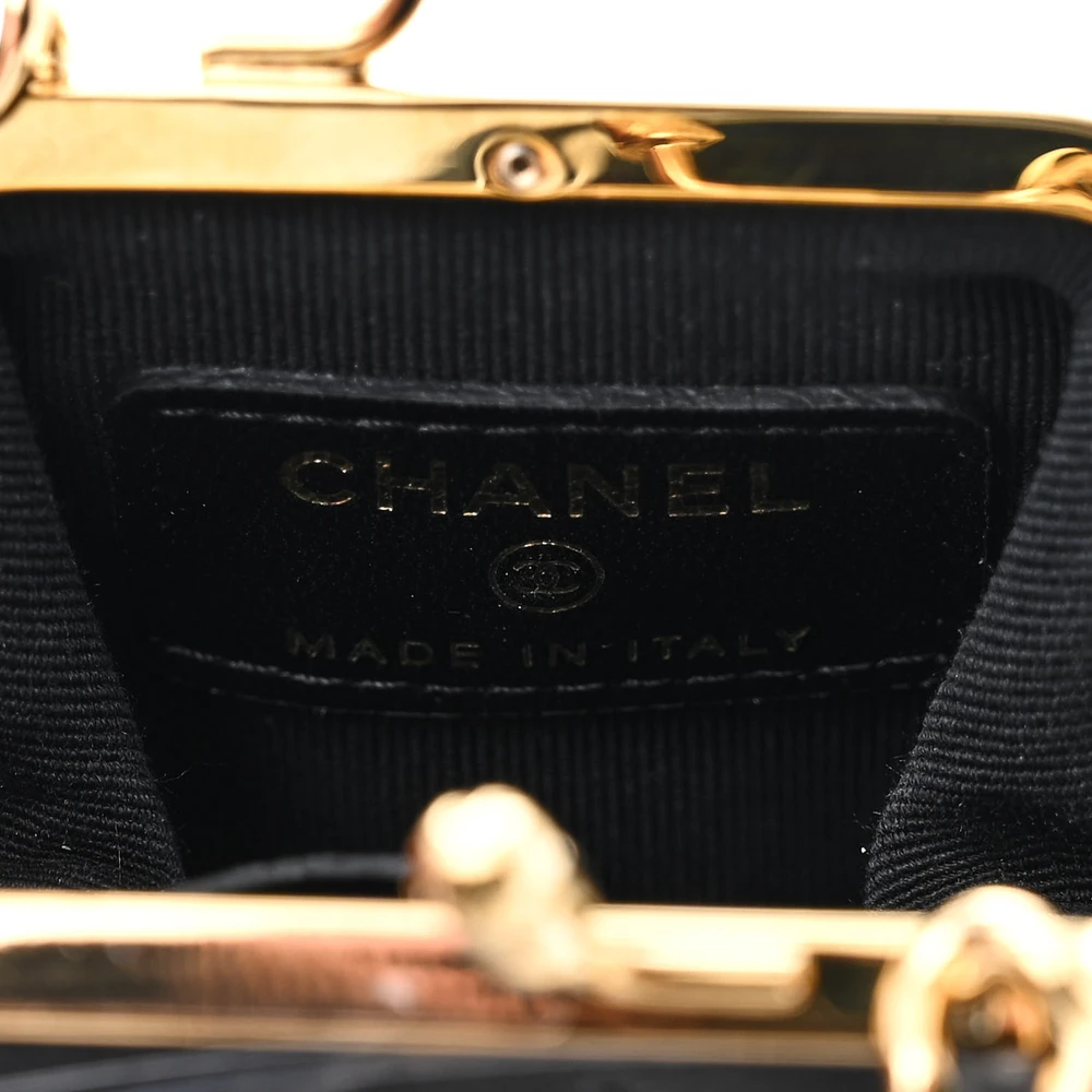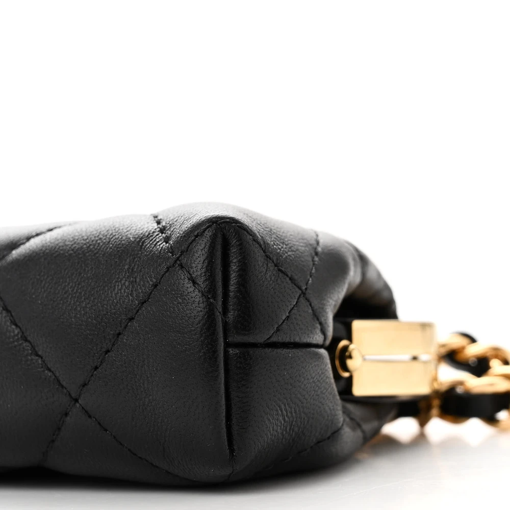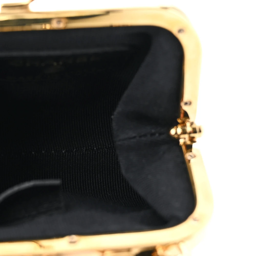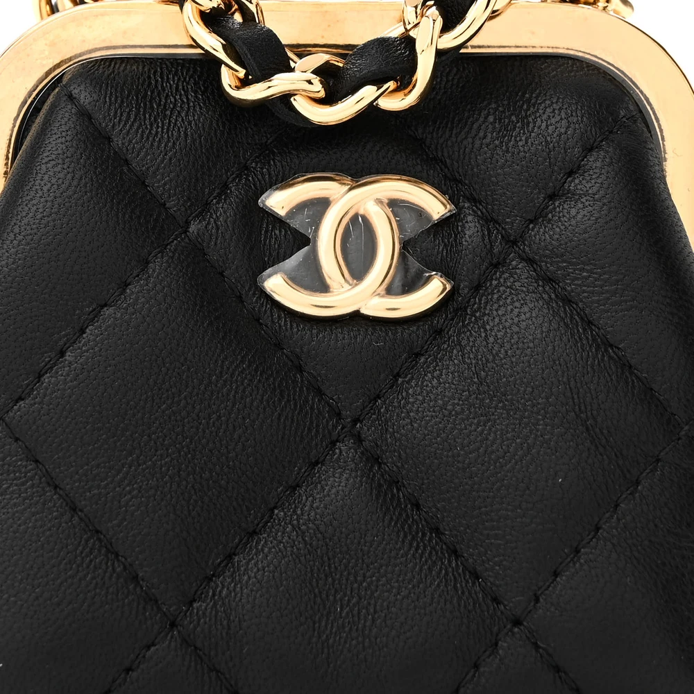 This Chanel Kiss Lock Clutch With Chain Mini in Black Quilted Lambskin Leather with Gold Hardware is a chic and compact accessory. The lambskin leather showcases Chanel’s classic quilted design, complemented by gold hardware. The kiss lock closure adds a vintage charm to its modern aesthetic. Perfect for carrying small essentials, it’s a stylish choice for evening events. The chain strap provides versatile carrying options. A delightful addition to any wardrobe.