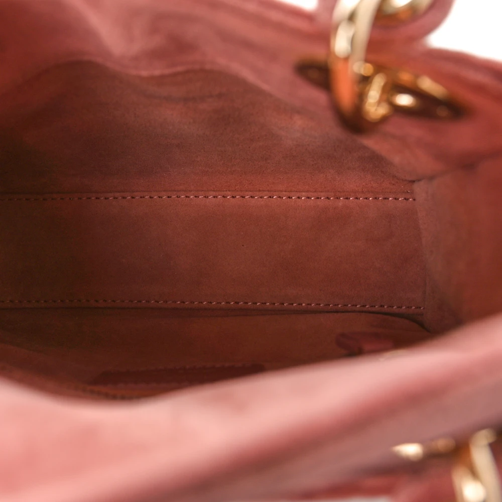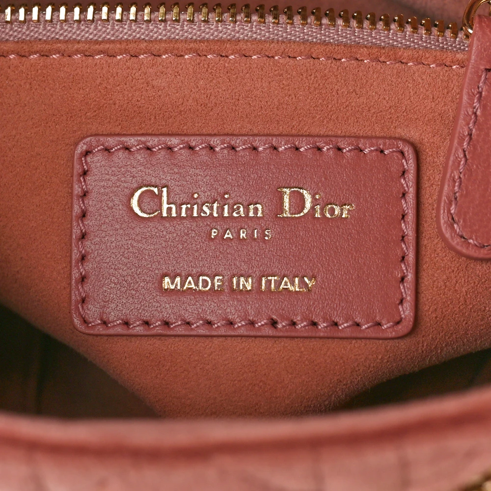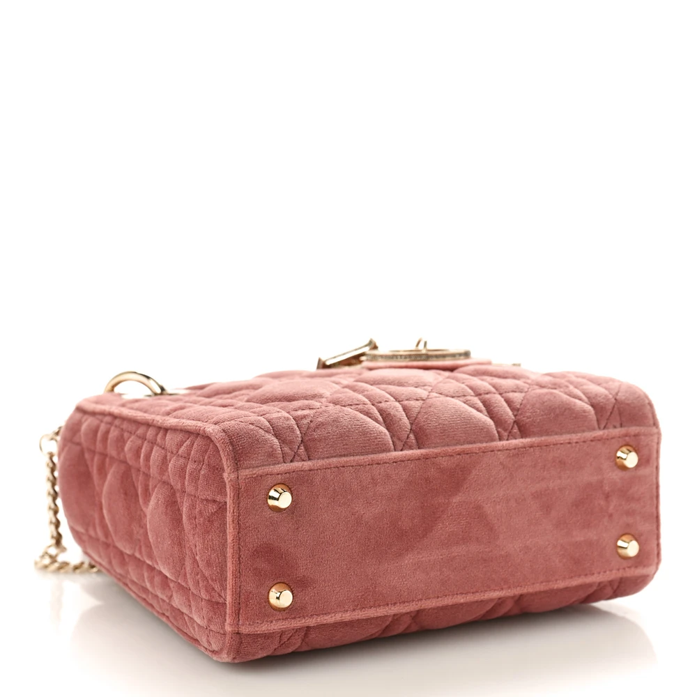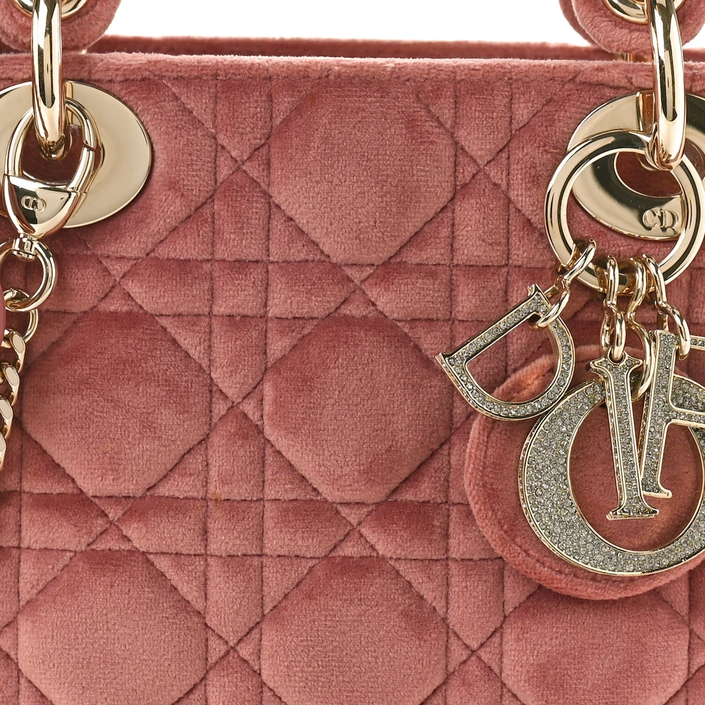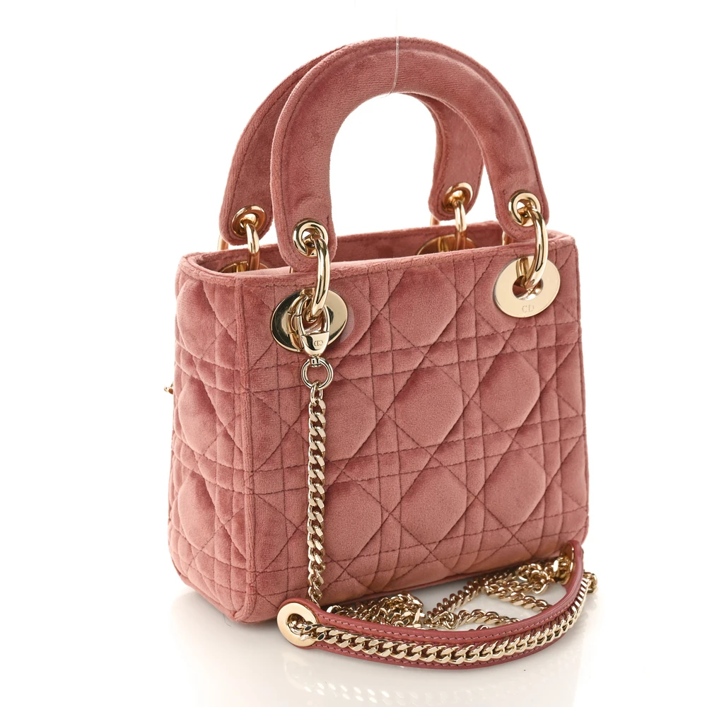 This Dior Mini Lady Dior in Pink Velvet offers a plush and elegant aesthetic. The gold hardware accentuates its luxurious texture, perfect for special occasions. Its compact size makes it ideal for carrying essentials in style. A statement piece that exudes charm and sophistication.