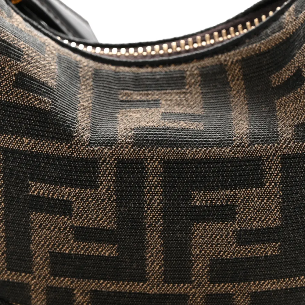 This Fendi Nano FF 1974 Fendigraphy Hobo Charm in Tobacco/Moro Jacquard Fabric is unique. Gold hardware adds a luxurious touch to its petite design. Compact yet spacious enough for small essentials. Perfect as an accessory or standalone statement. A playful addition to elevate any bag collection. Chic and sophisticated in every detail.
