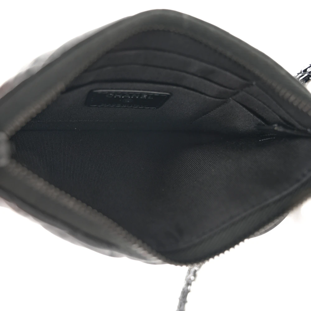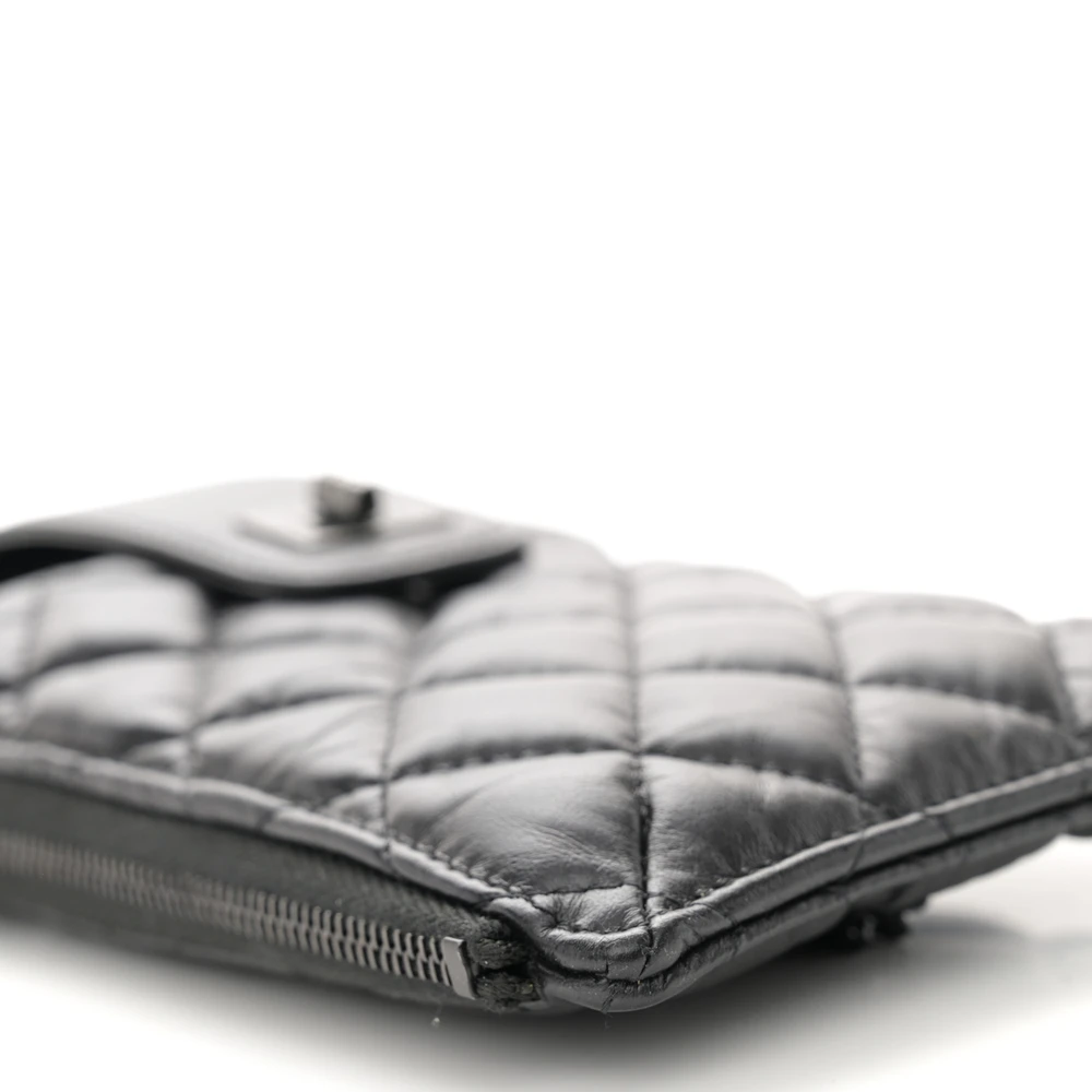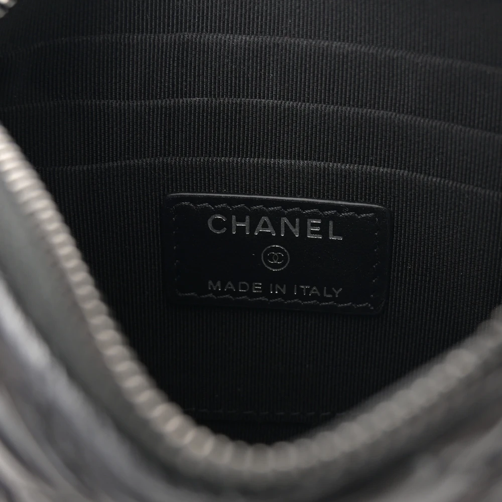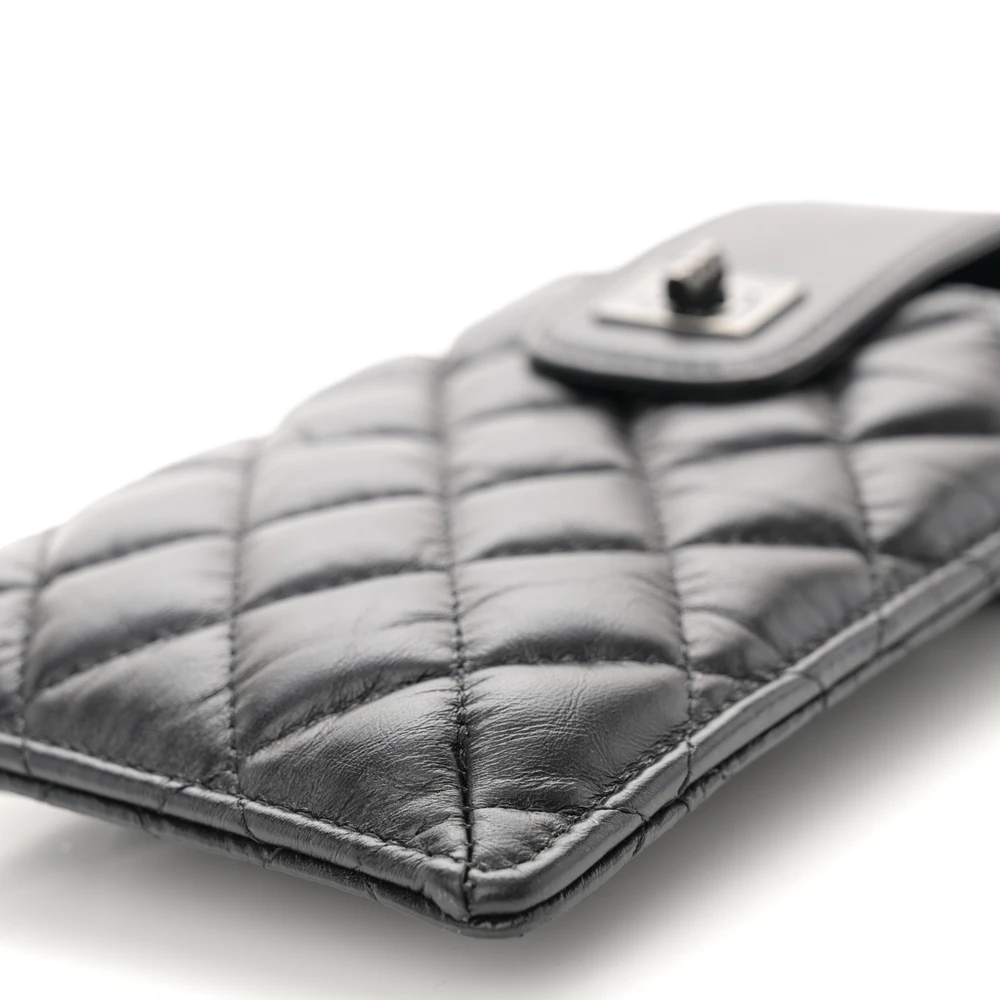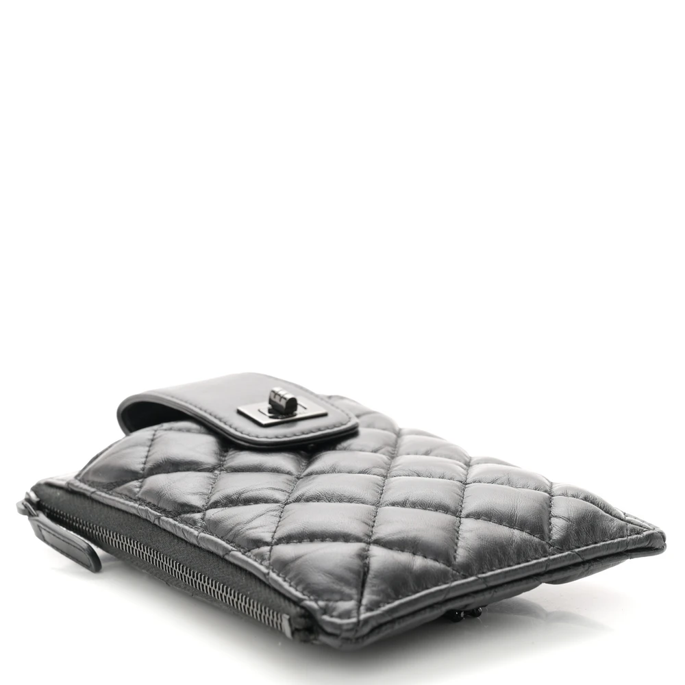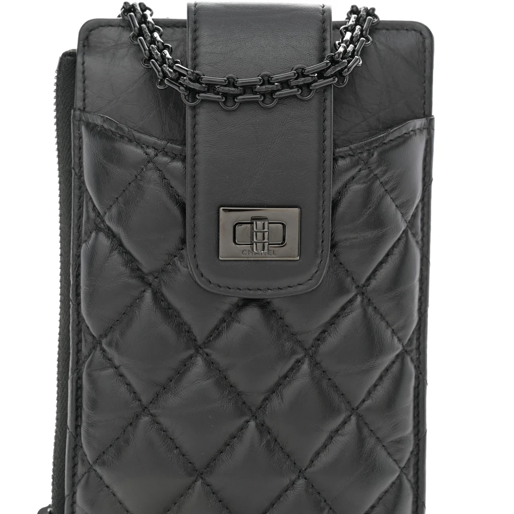 This Chanel Reissue Phone Holder With Chain Mini in Quilted Aged Calfskin Leather with So Black Hardware is a sleek and modern piece. The aged calfskin leather adds a vintage charm to its compact design. So Black hardware creates a bold and edgy look. Perfect for carrying a phone and small essentials, it combines practicality with elegance. The chain strap offers versatile carrying options. A must-have accessory for Chanel lovers.